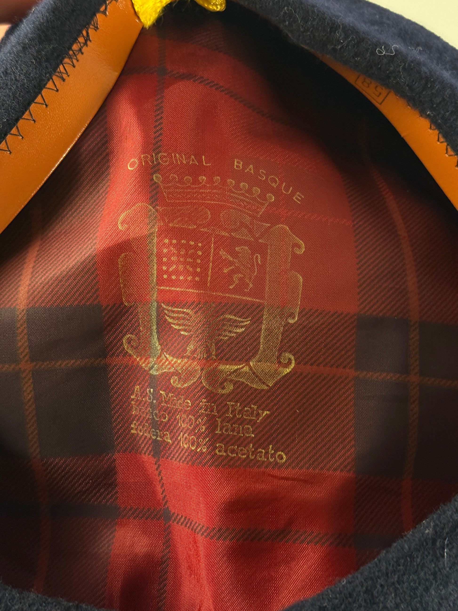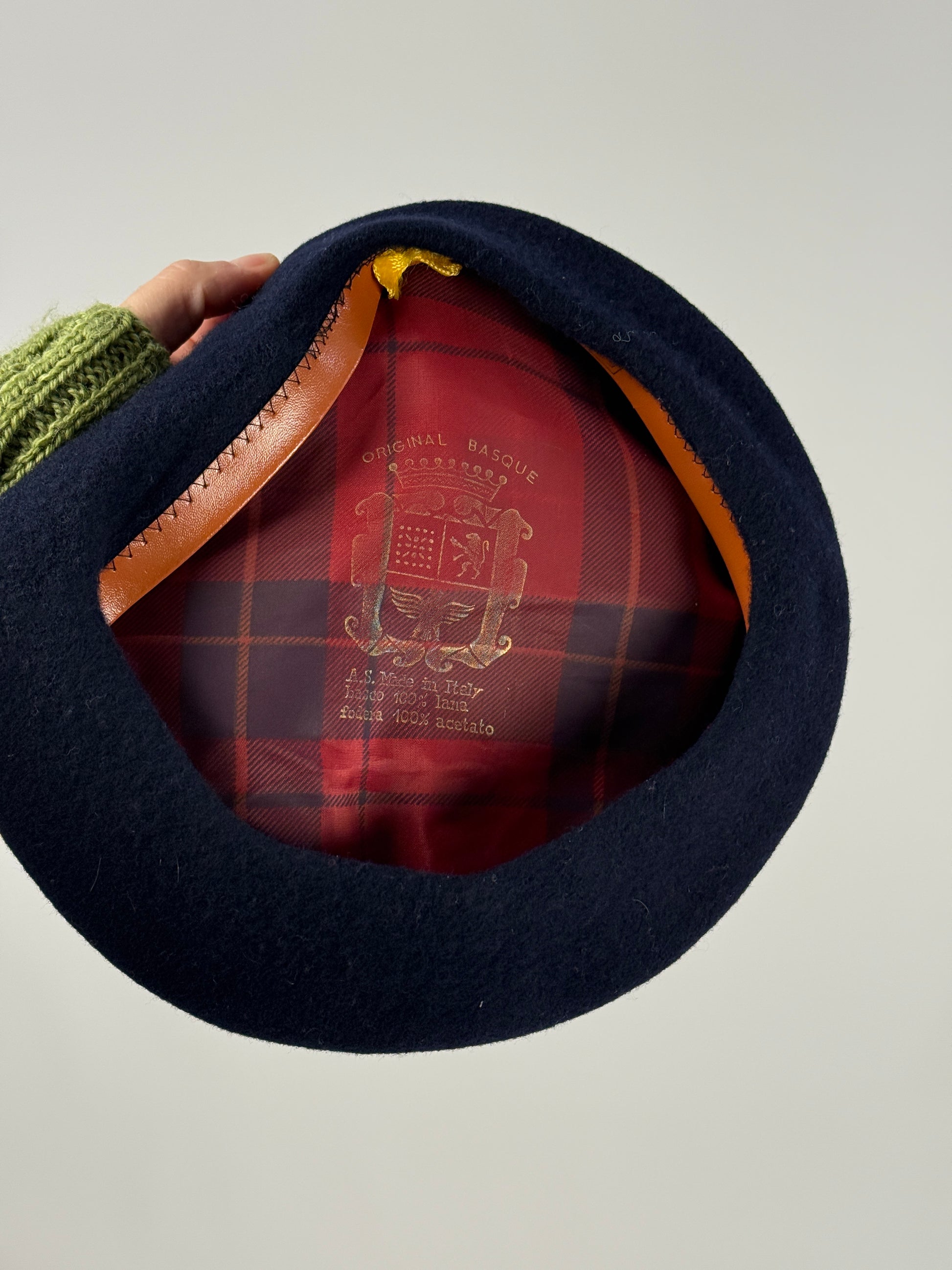 Basco vintage blu navy in pura lana, modello Original Basque, un classico senza tempo che arriva direttamente dalla tradizione italiana. Interno scozzese rosso con logo dorato, fascetta in pelle e costruzione rigida da basco autentico: pulito, elegante, di quelli che raccontano stile senza sforzo.