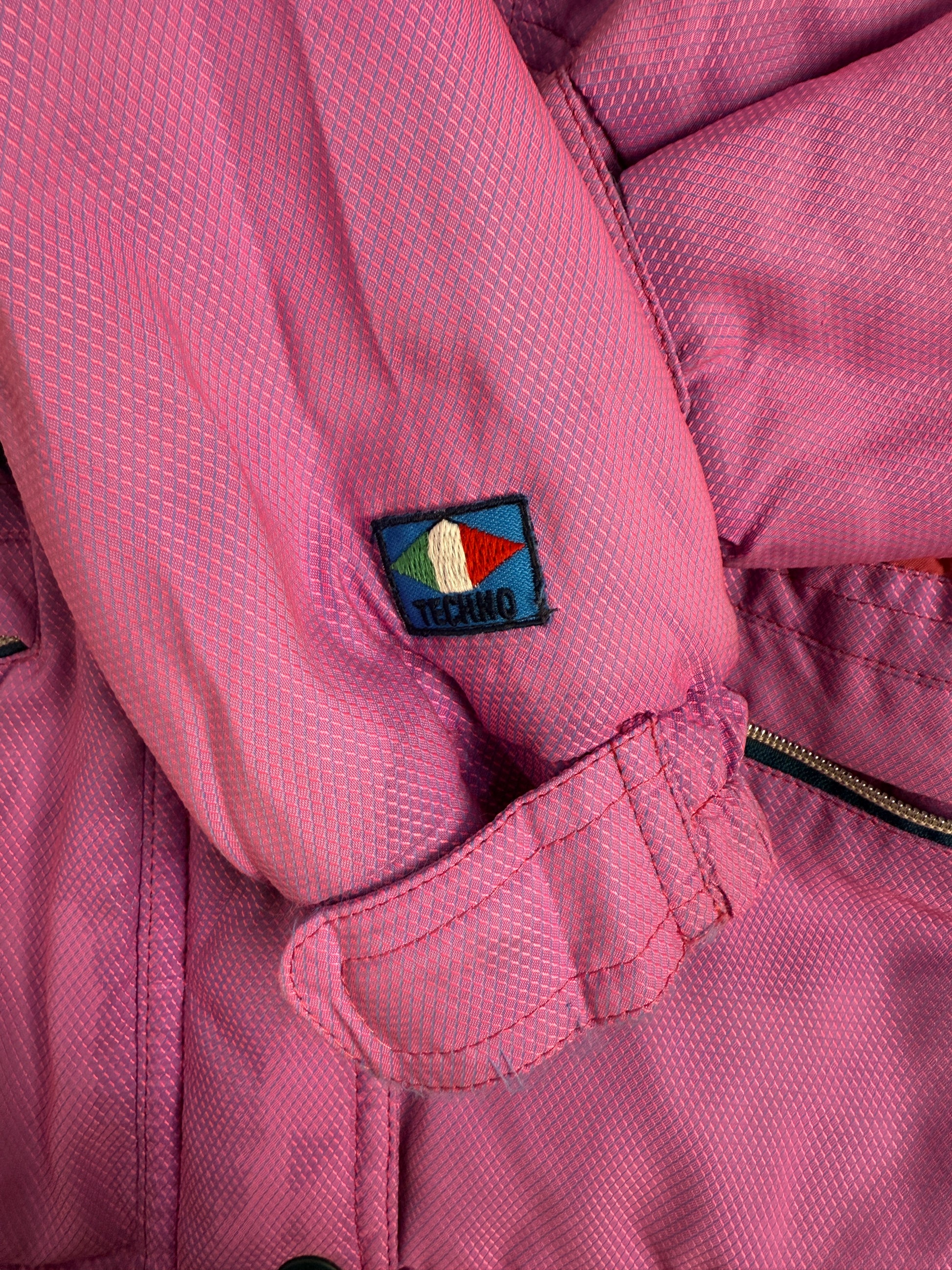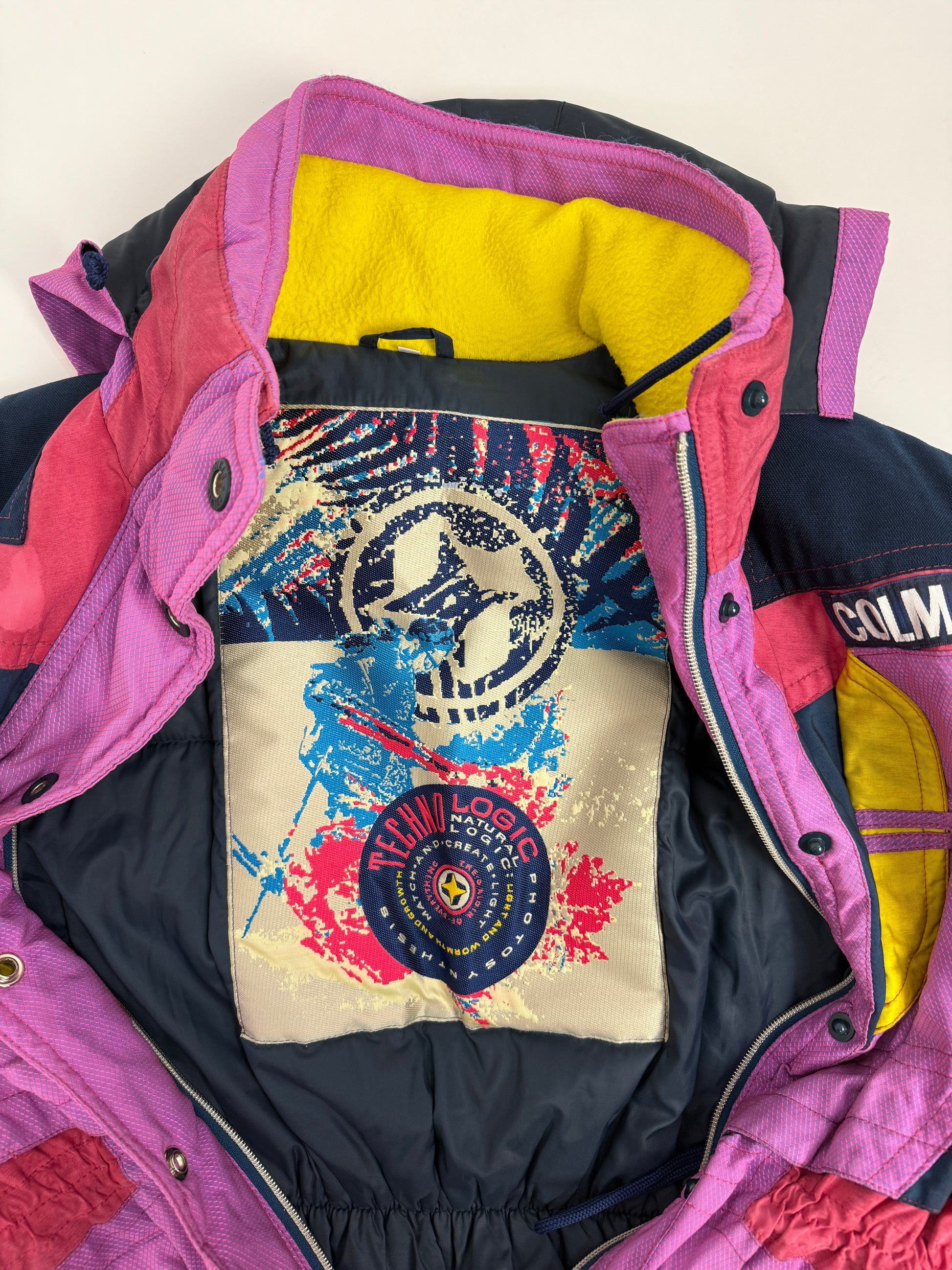Dettagli autentici come il logo Techno Logic ricamato, la patch interna multicolor e la targhetta Colmar sul petto ne certificano la provenienza d’archivio