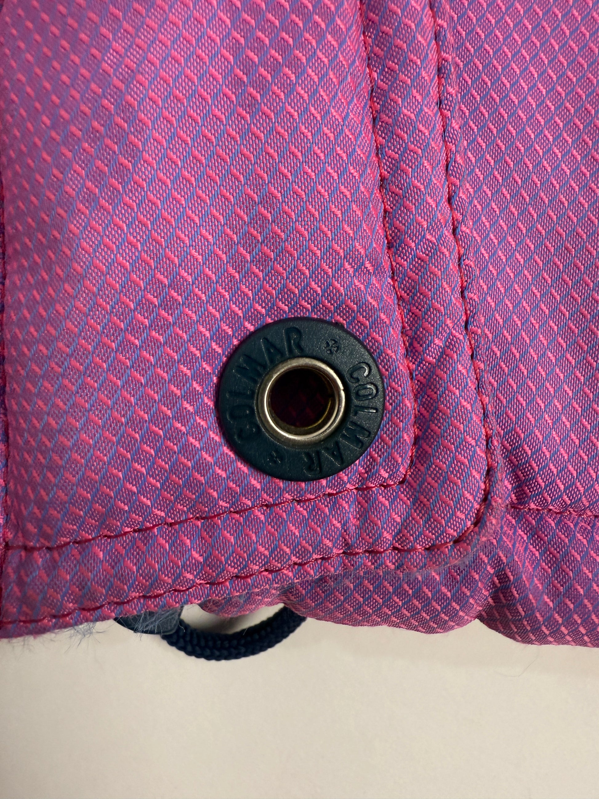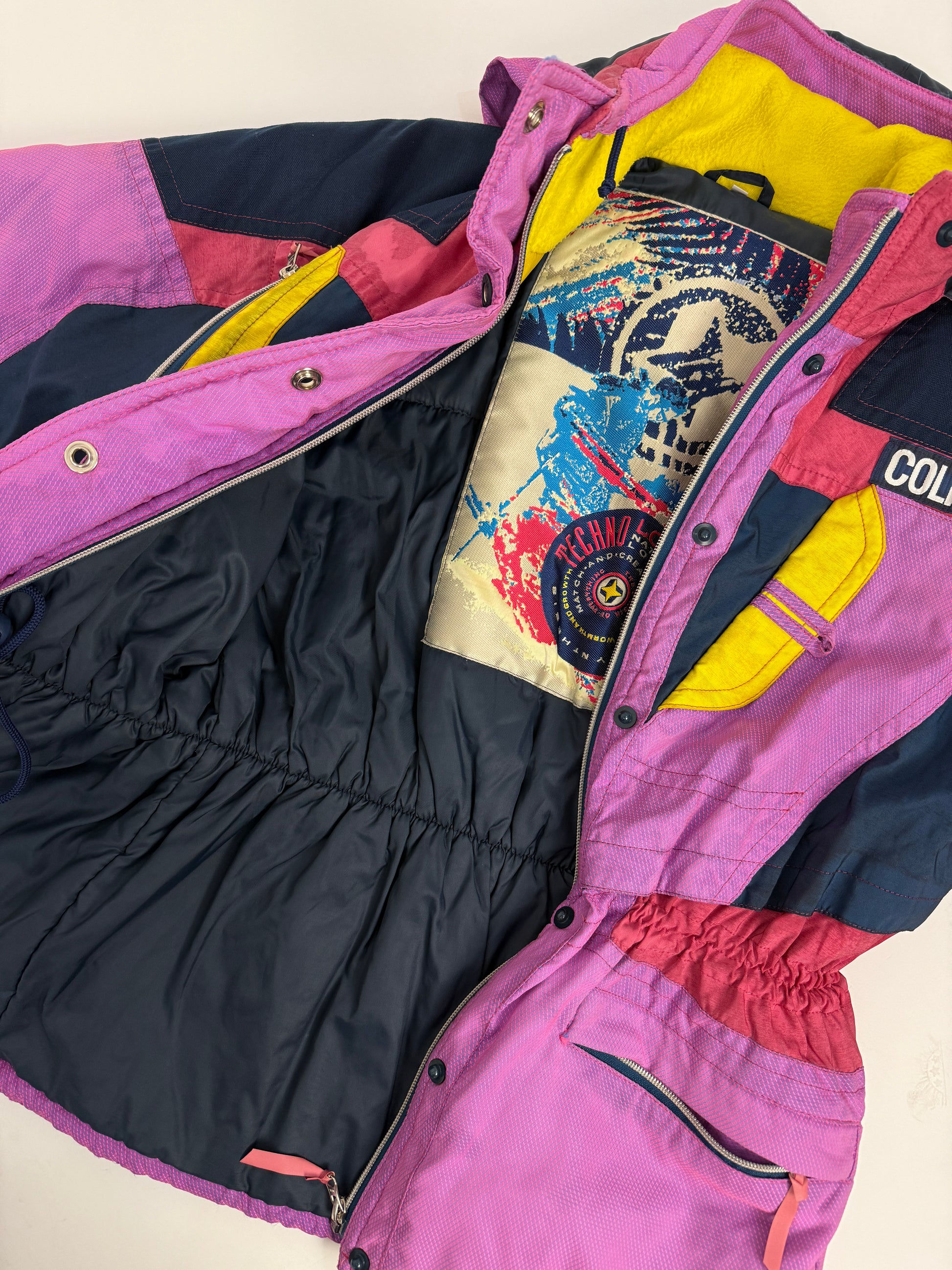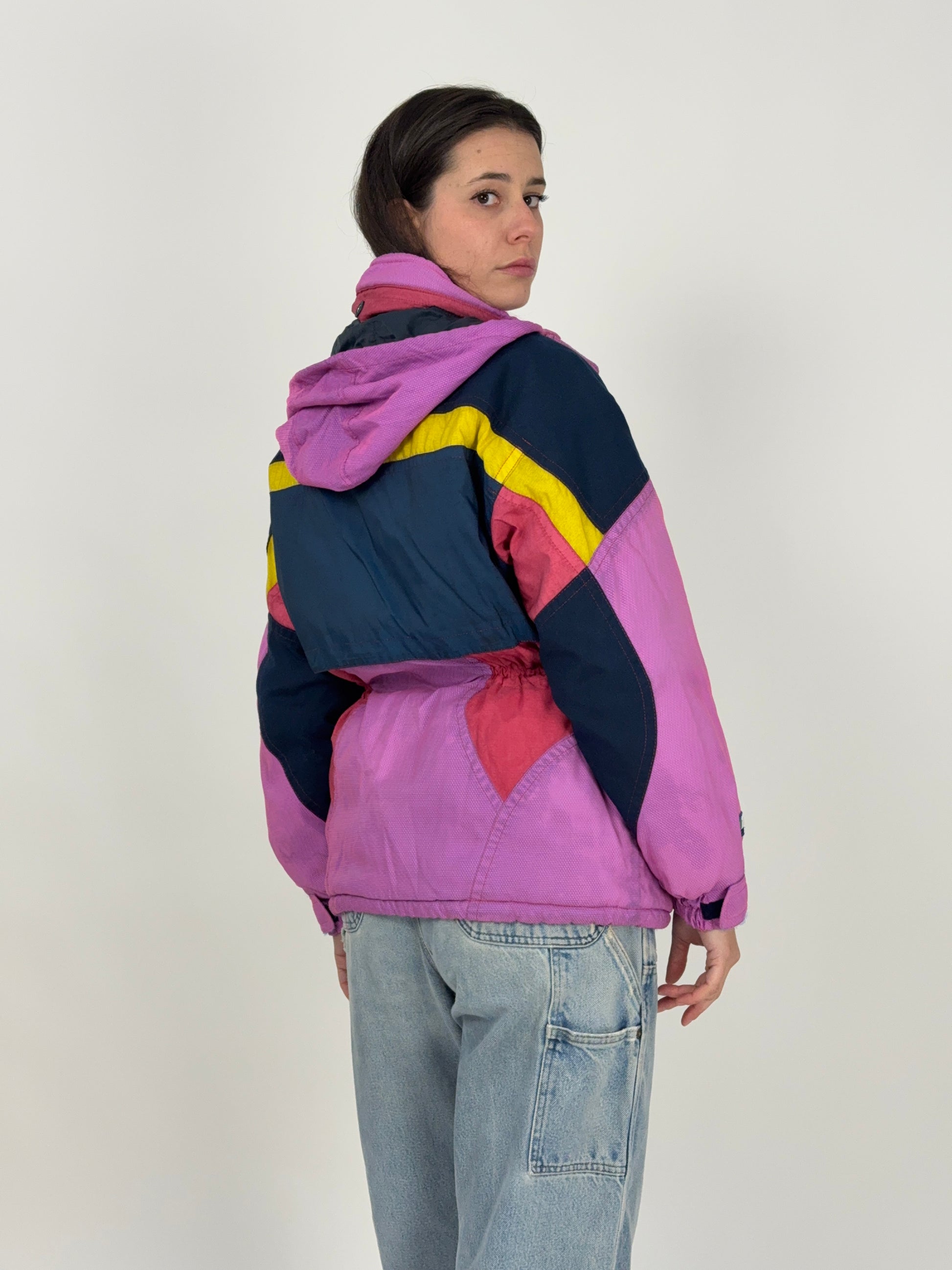 Questa Colmar Techno Logic vintage è una giacca da sci Made in Italy pensata per resistere al freddo e ai decenni, con un design color block che unisce rosa, blu navy, giallo e rosso.