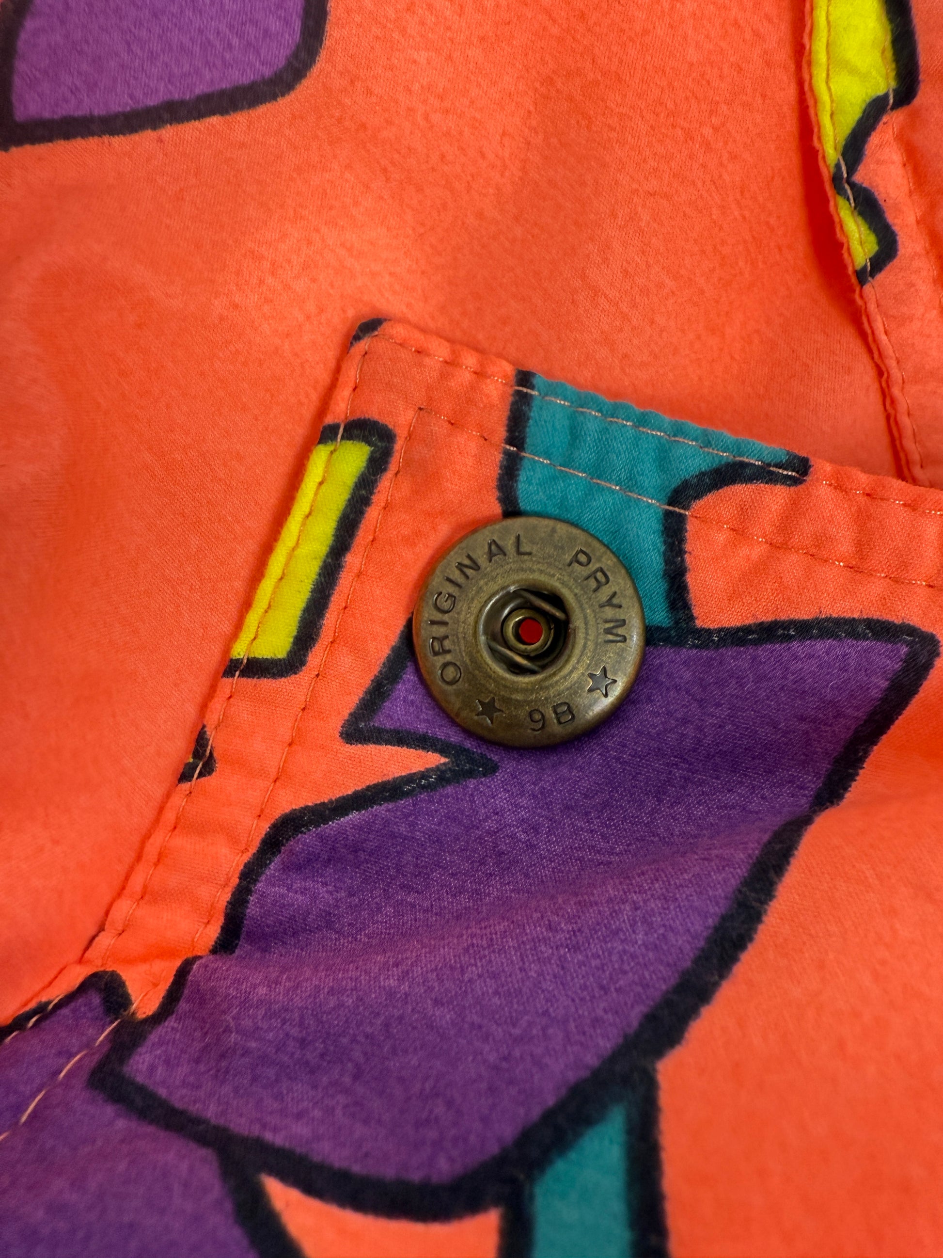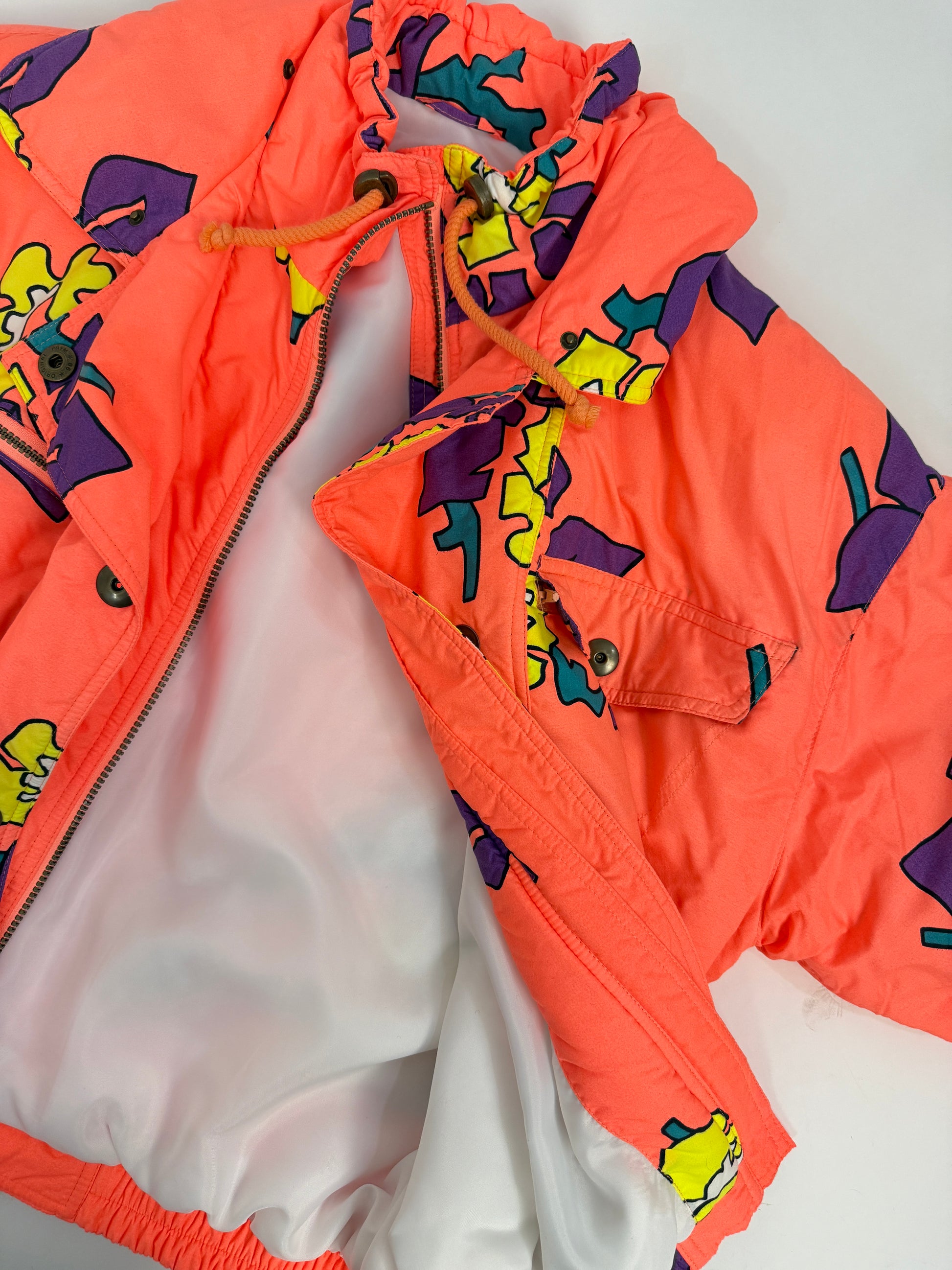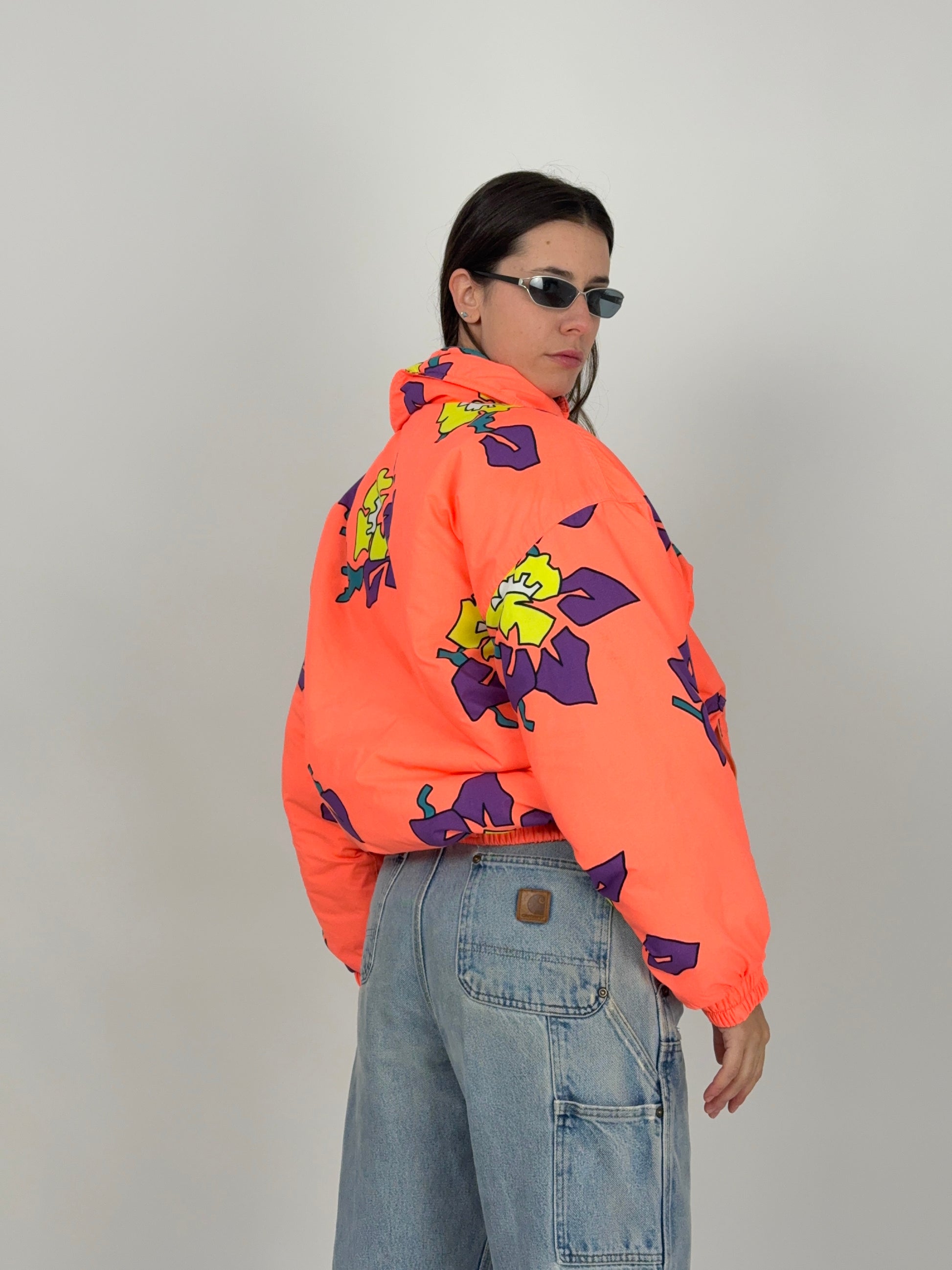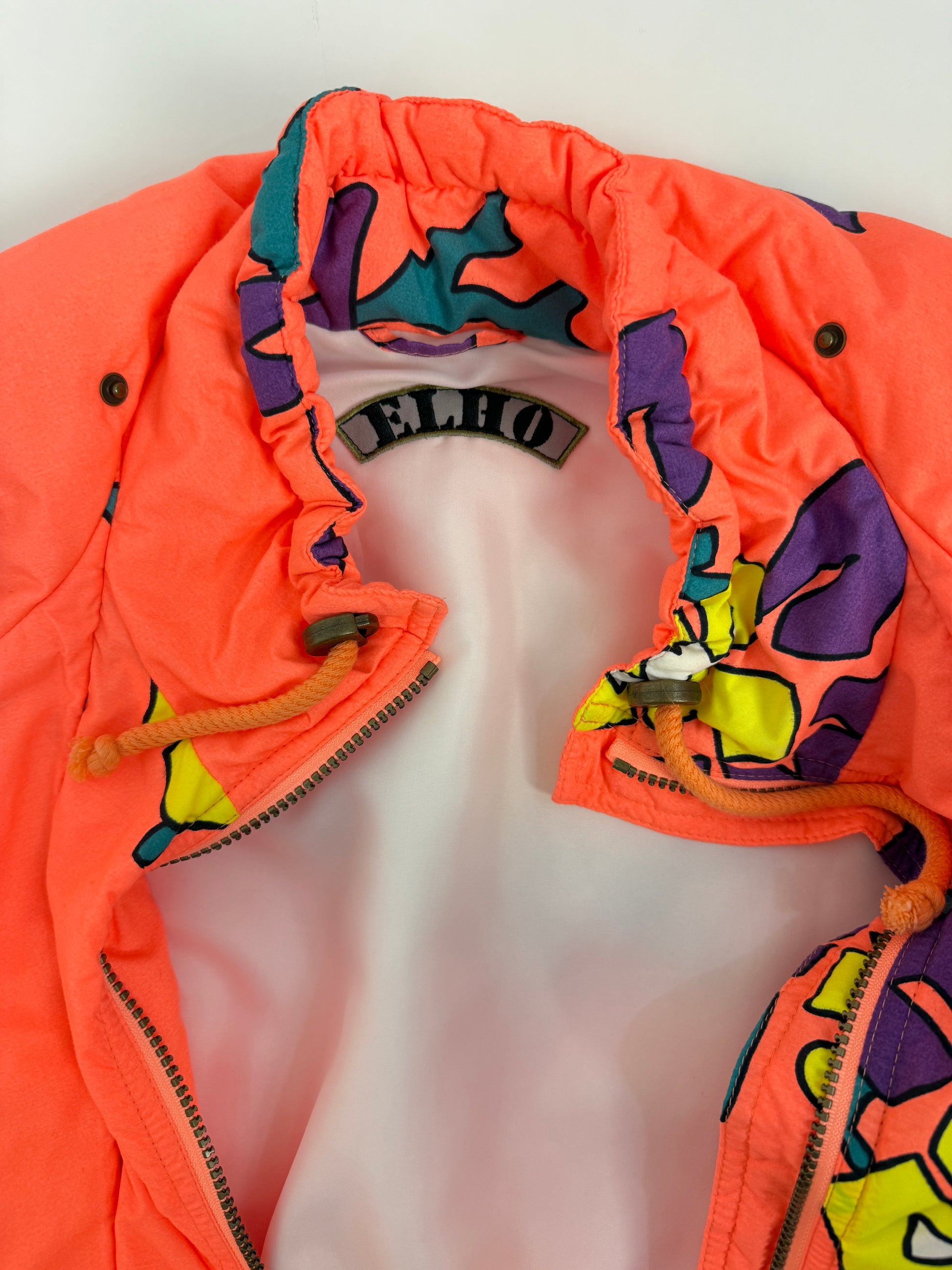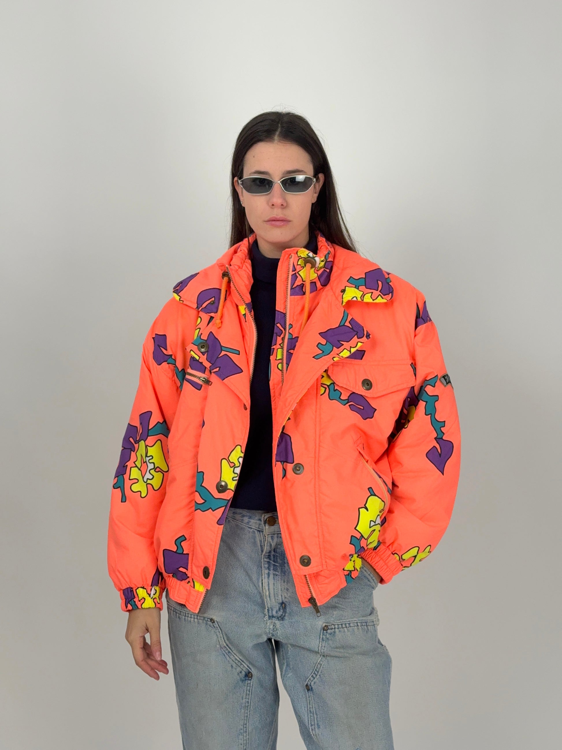 Questa giacca da sci vintage cattura subito l’occhio con il suo arancione fluo intenso e la stampa astratta multicolor nei toni del viola, giallo e turchese, un mix grafico che racconta lo stile più iconico delle piste di quell’epoca.