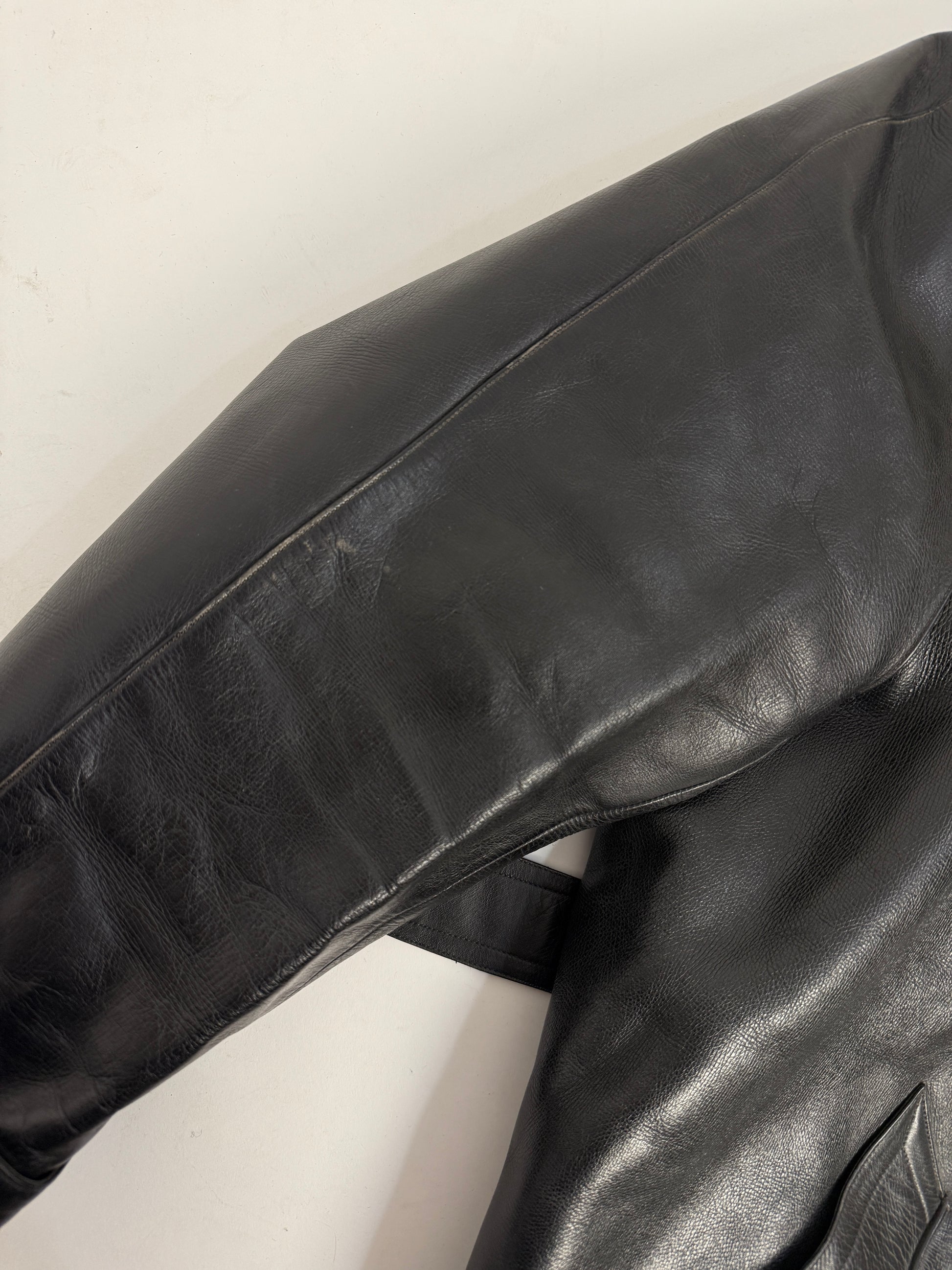 Cappotto in pelle nera di produzione italiana, realizzato tra fine anni ’40 e primi anni ’50. La struttura è quella del doppiopetto sartoriale: spalle costruite, vita leggermente segnata dalla cintura, rever ampio e funzionale. Un capo pensato per proteggere dal freddo e dal vento. La pelle è spessa, pieno fiore, ancora oggi spessa e compatta, con quella patina naturale che solo decenni di utilizzo reale sanno creare. All’interno troviamo una fodera in panno lana marrone, tipica delle produzioni sartoriali del dopoguerra, studiata per isolamento termico e comfort.