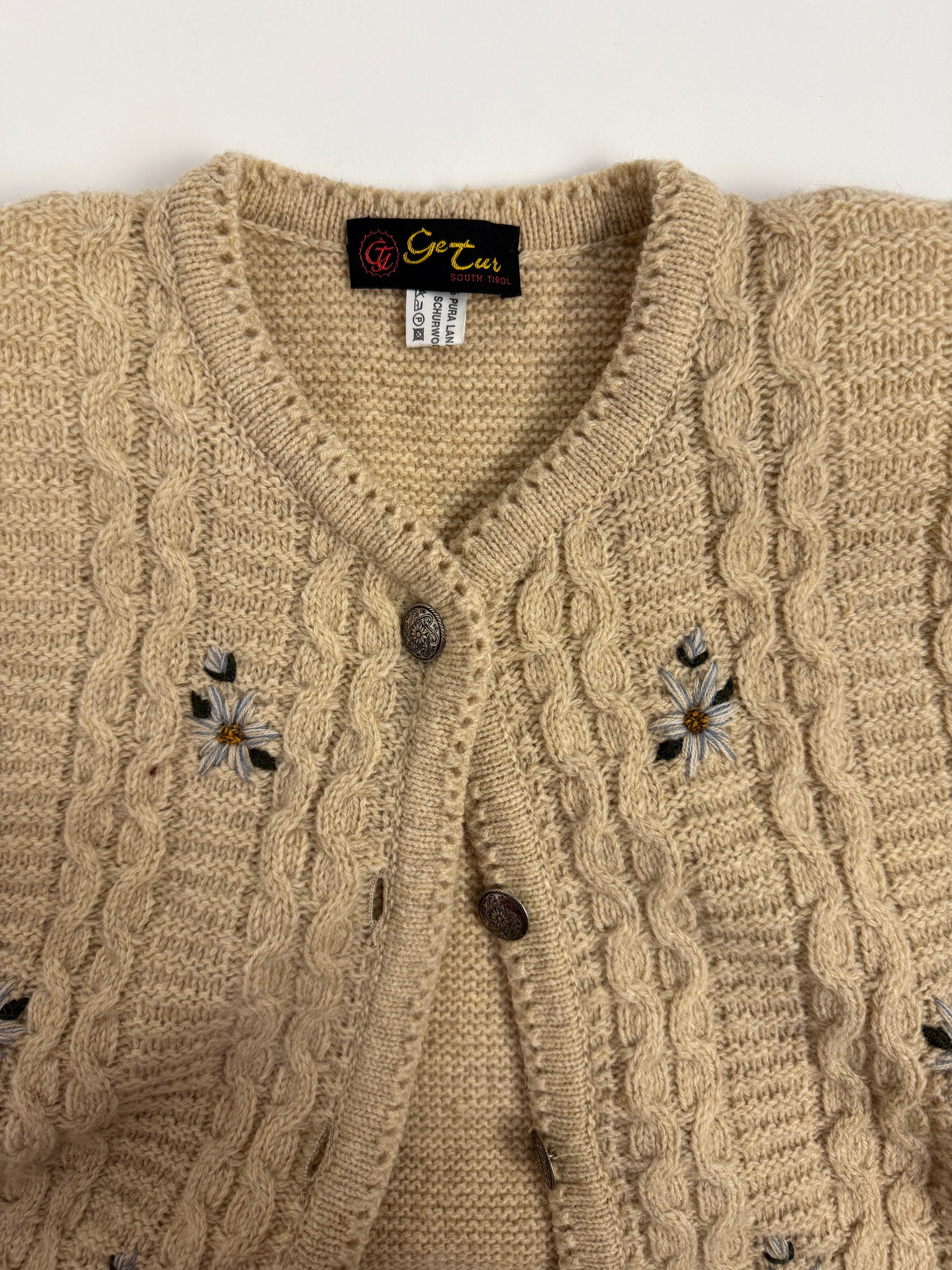Cardigan tirolese originale Getur South Tirol, un pezzo autentico degli anni ’80 che porta con sé tutto il fascino dell’artigianato alpino.