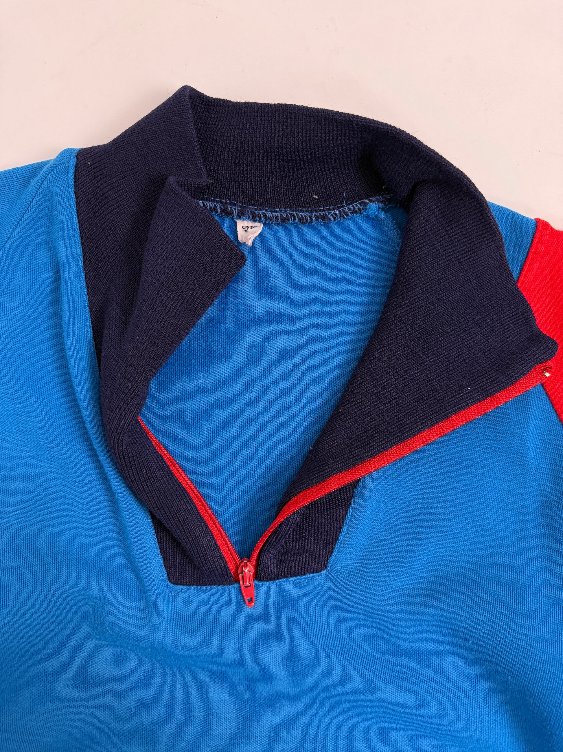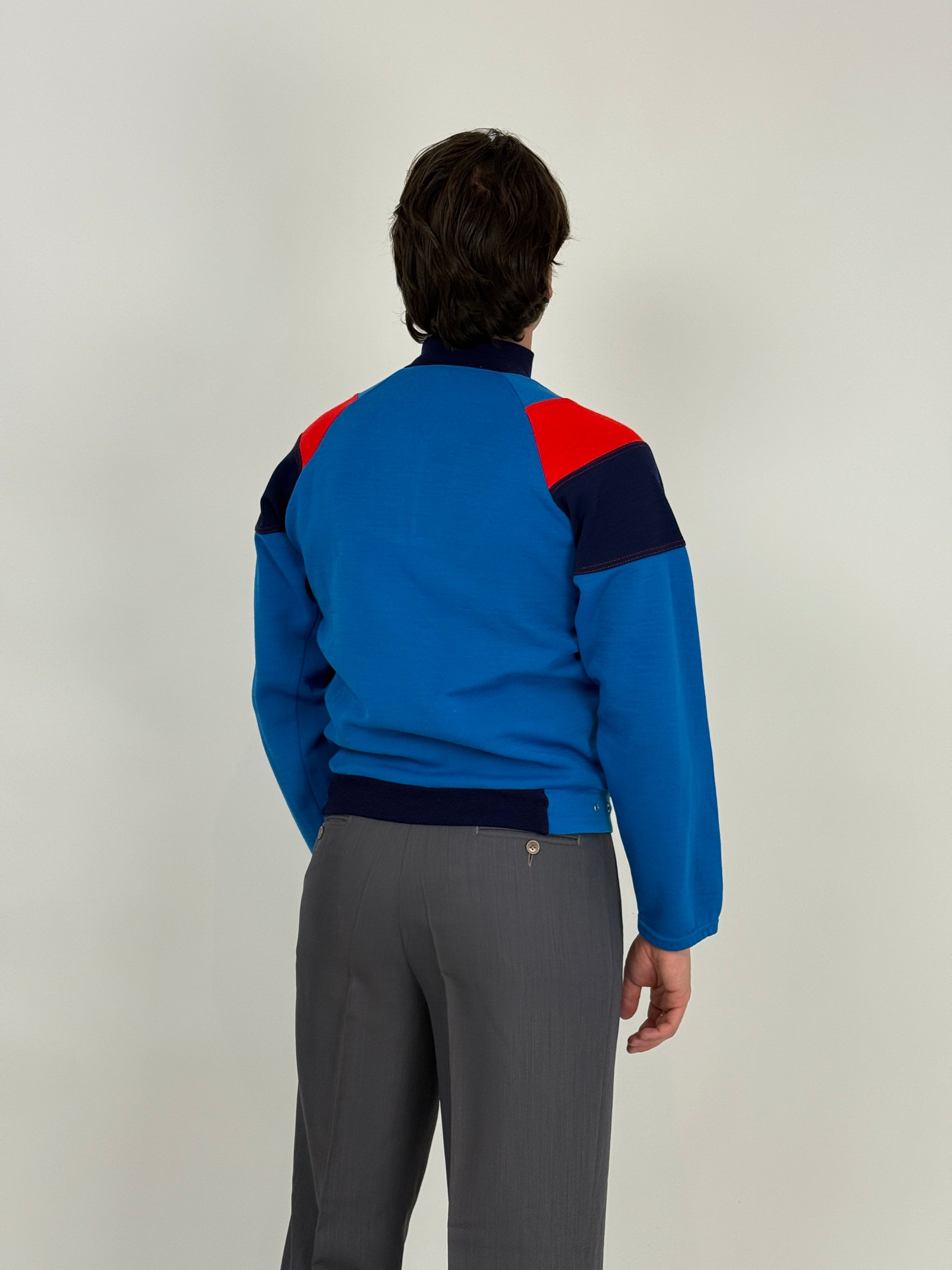 Realizzata in cotone pesante, presenta design bicolore blu con inserti rossi e navy, zip a mezza apertura e logo ricamato Moto Gear sul petto. Dettagli a contrasto con cuciture rosse che richiamano il mondo delle moto e dell’abbigliamento outdoor italiano.