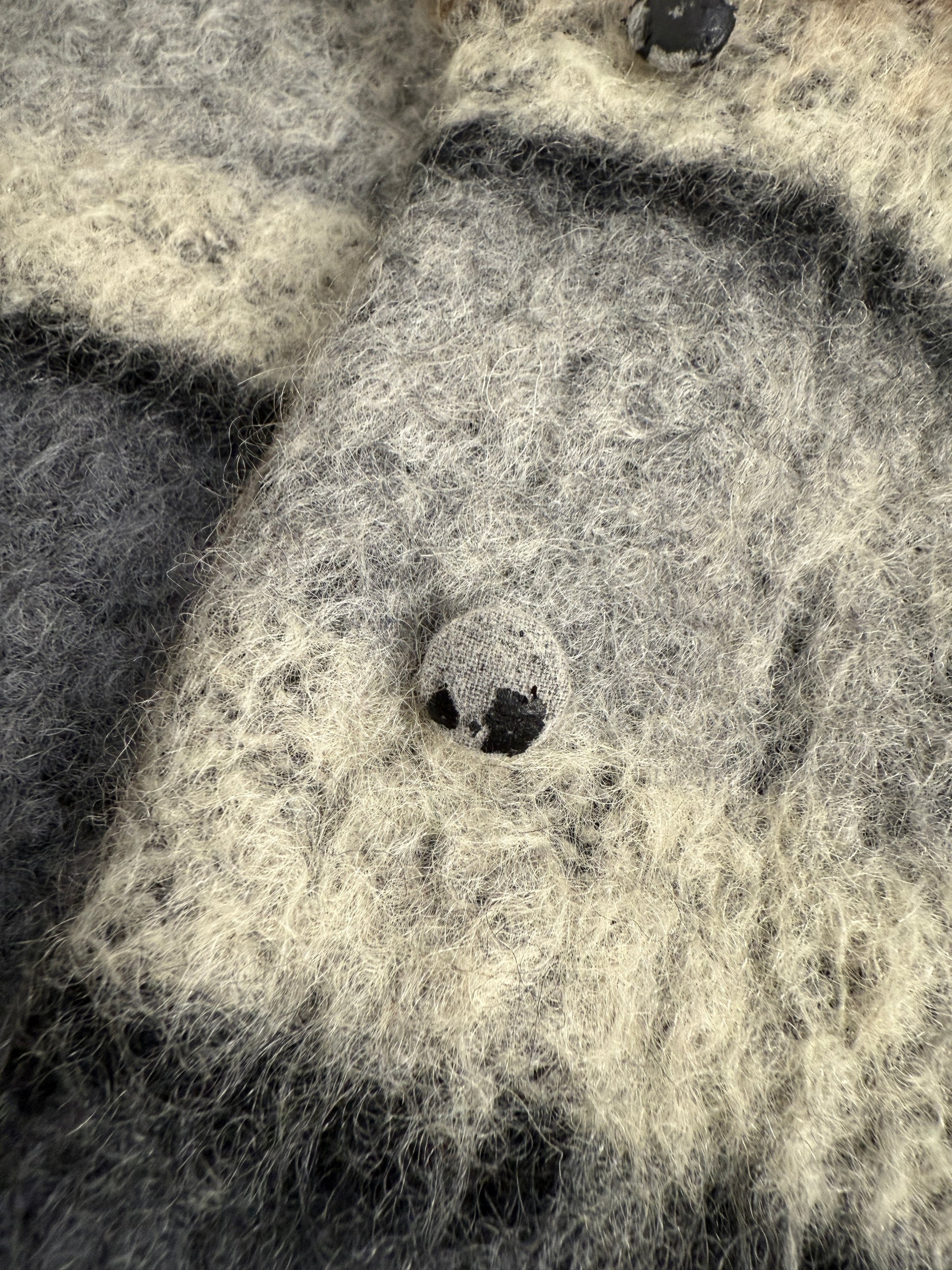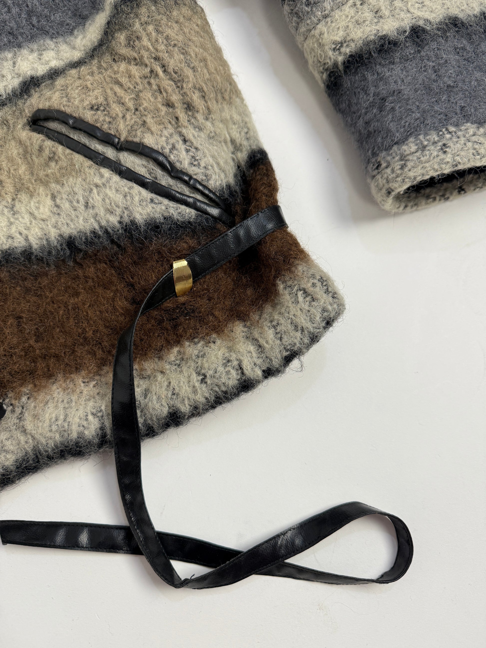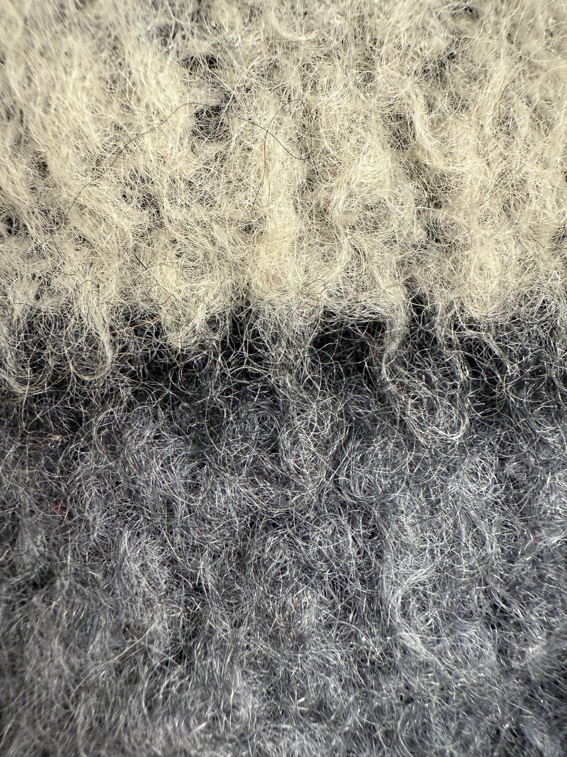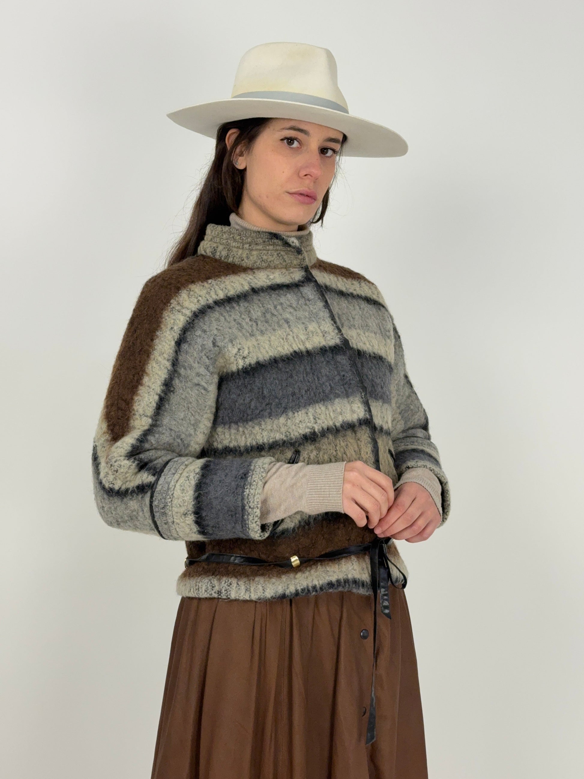 Il filato misto lana/mohair crea quell’effetto morbido e “vaporoso”, con righe in sfumature naturali che vanno dal beige al grigio fino al marrone tabacco.