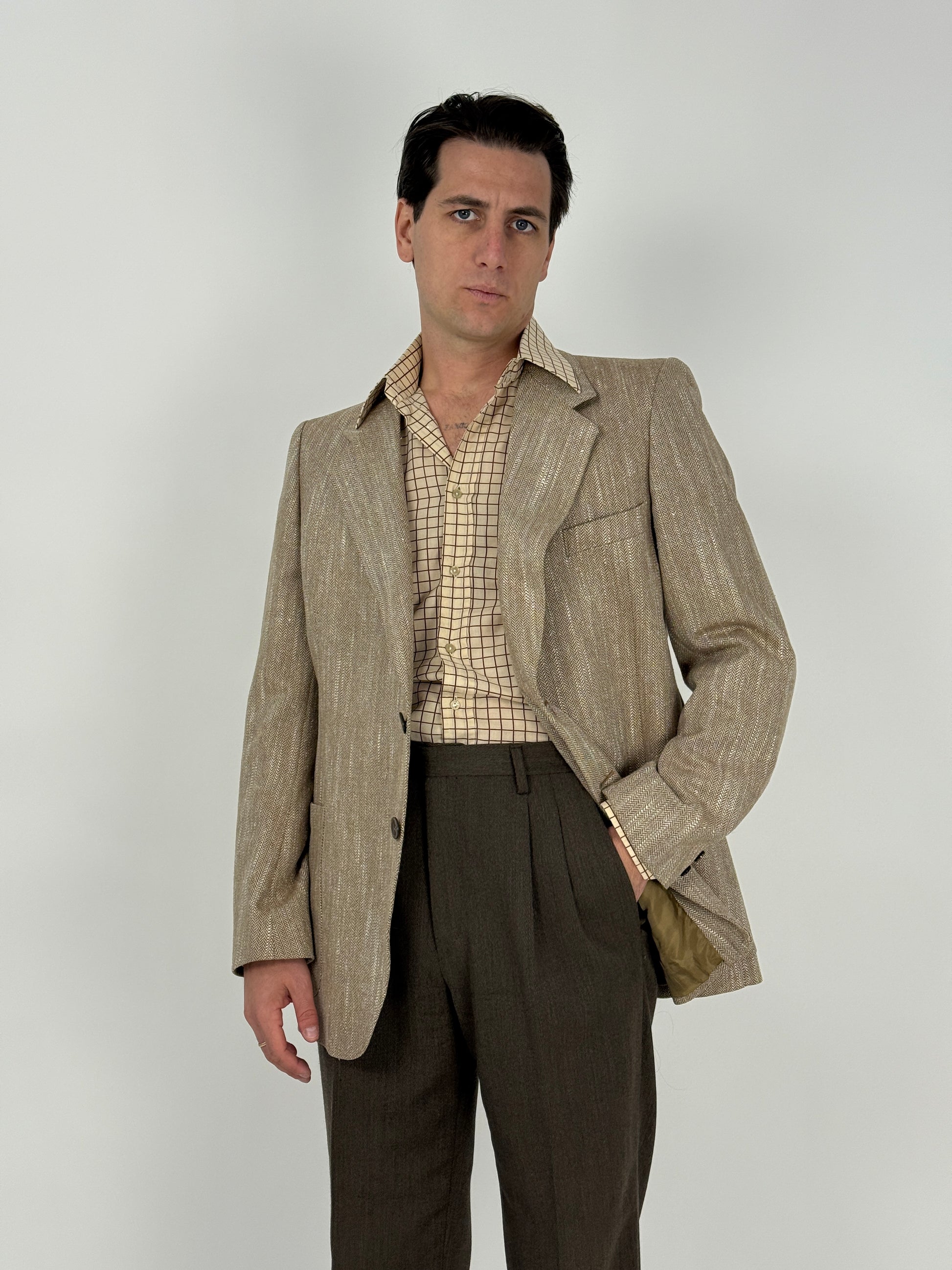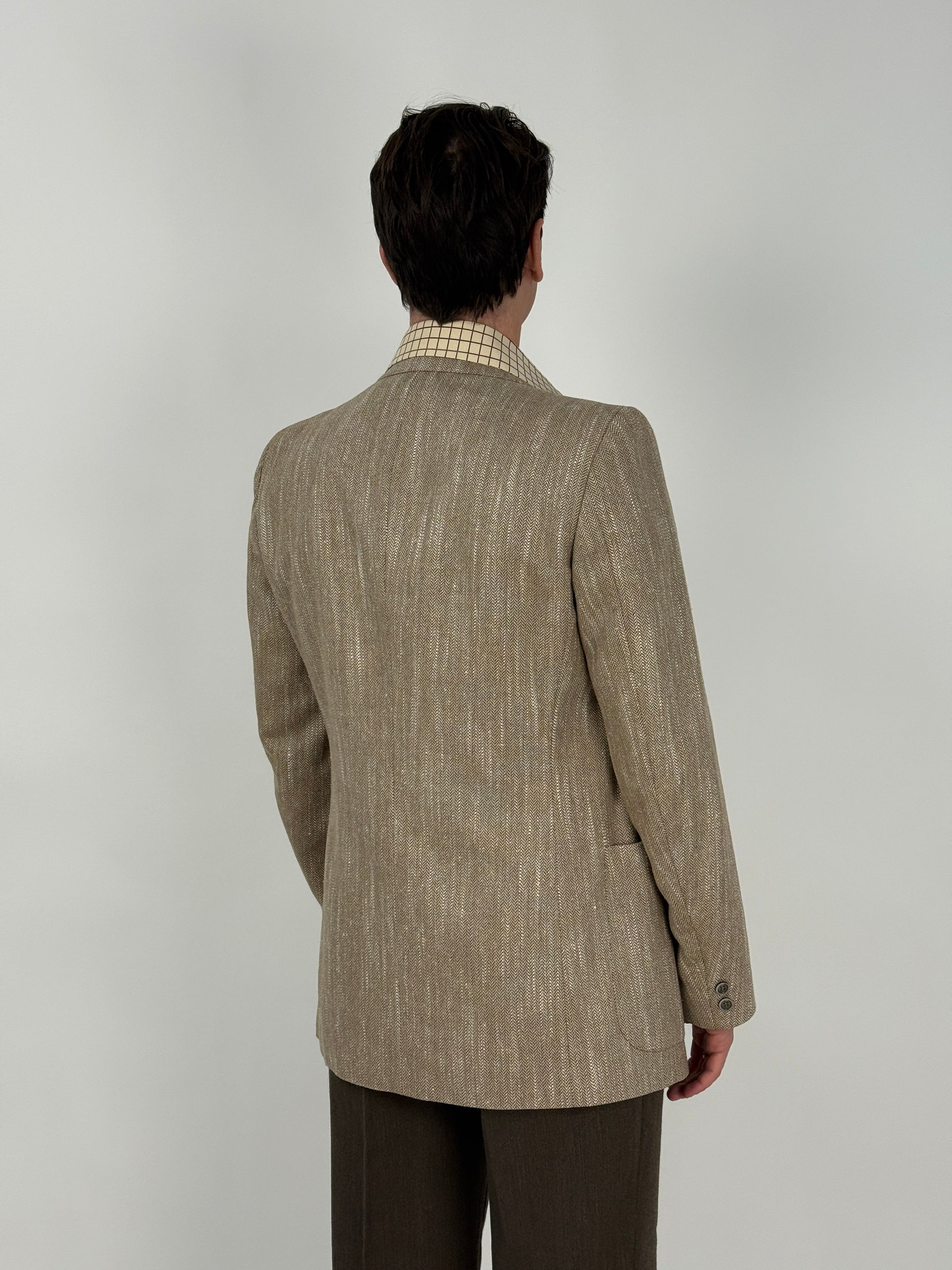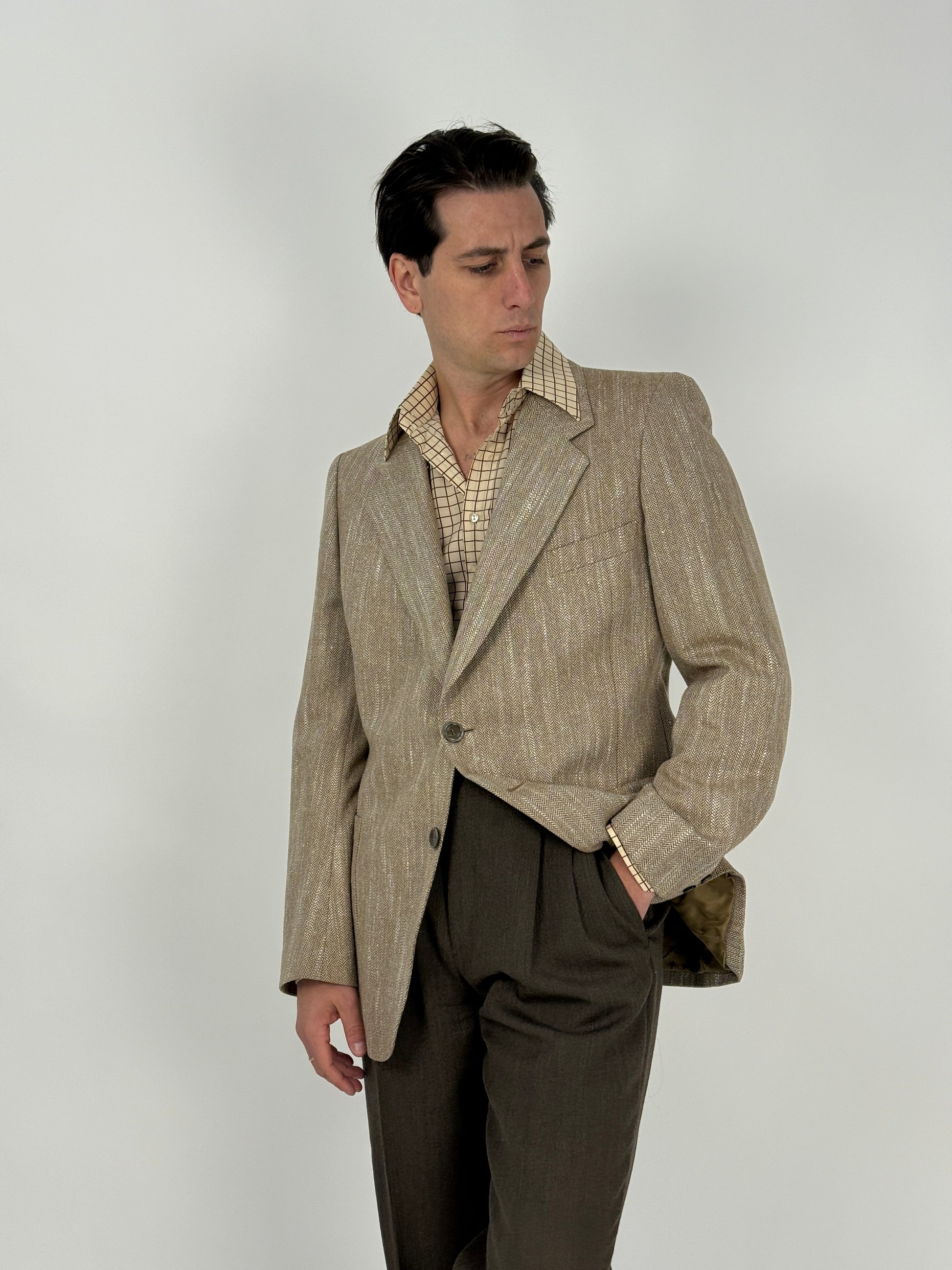 Giacca DRAIV Confezioni, anni ’70, in tessuto spigato beige mélange dalla mano strutturata , taglio monopetto a 2 bottoni con rever classico, taschino al petto e tasche laterali. Spalle morbide, fodera interna completa: perfetta per look smart-casual e formali di stagione