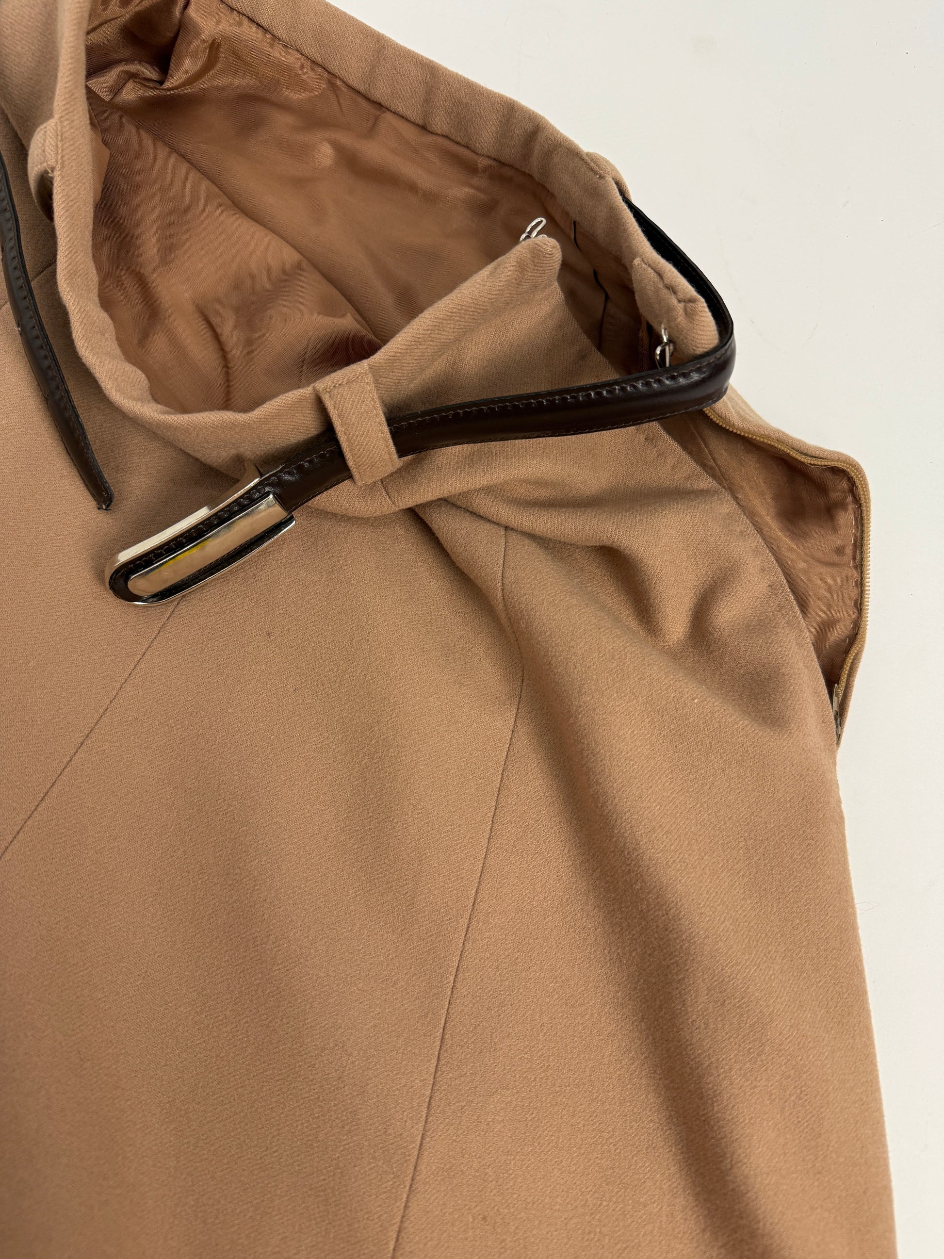 Elegante gonna midi originale anni ’70 in morbida lana beige, linea svasata A-line che slancia la figura. Vita regolare con passanti, cintura, cuciture pulite e bella caduta; completamente foderata per un comfort impeccabile