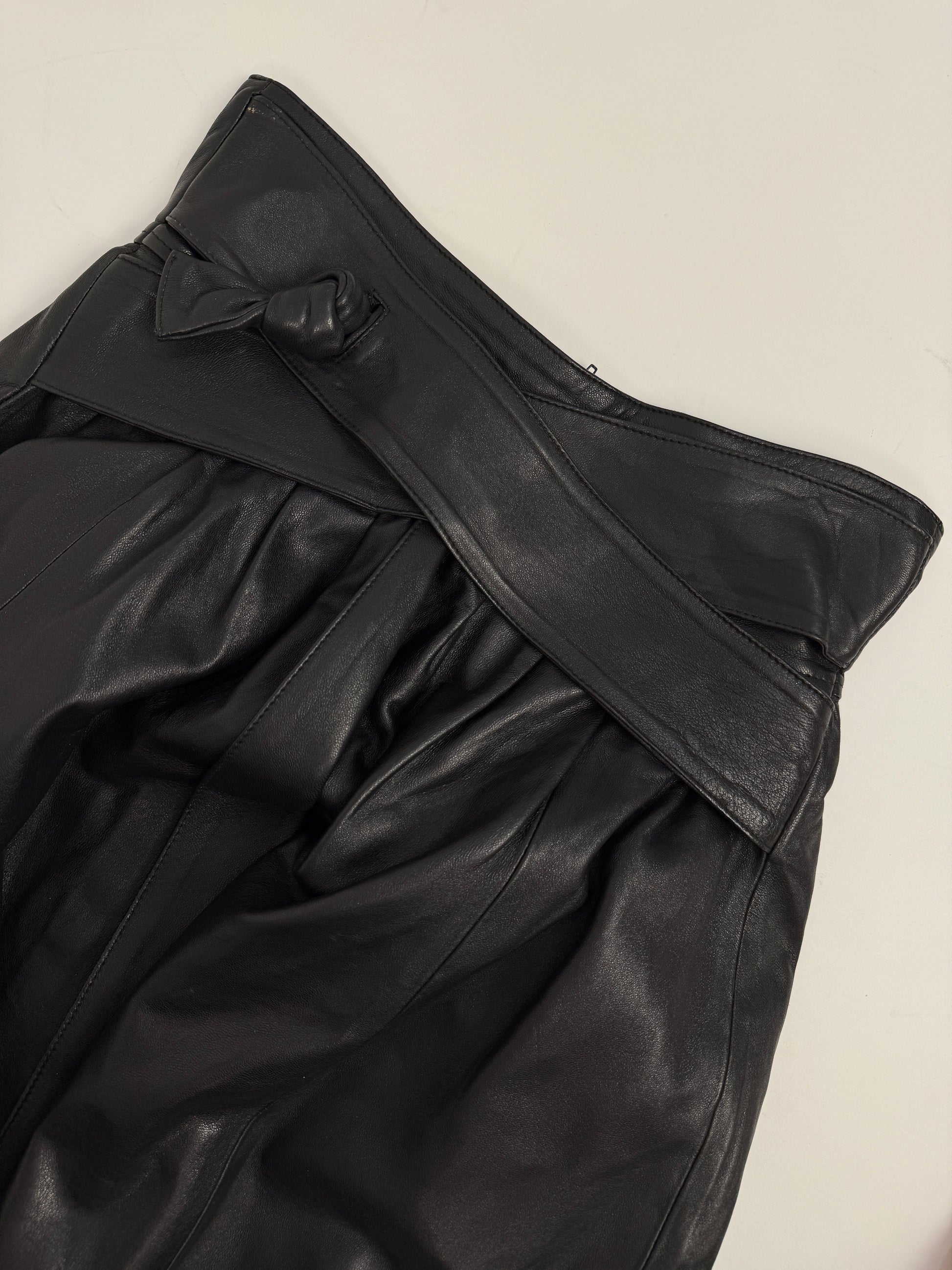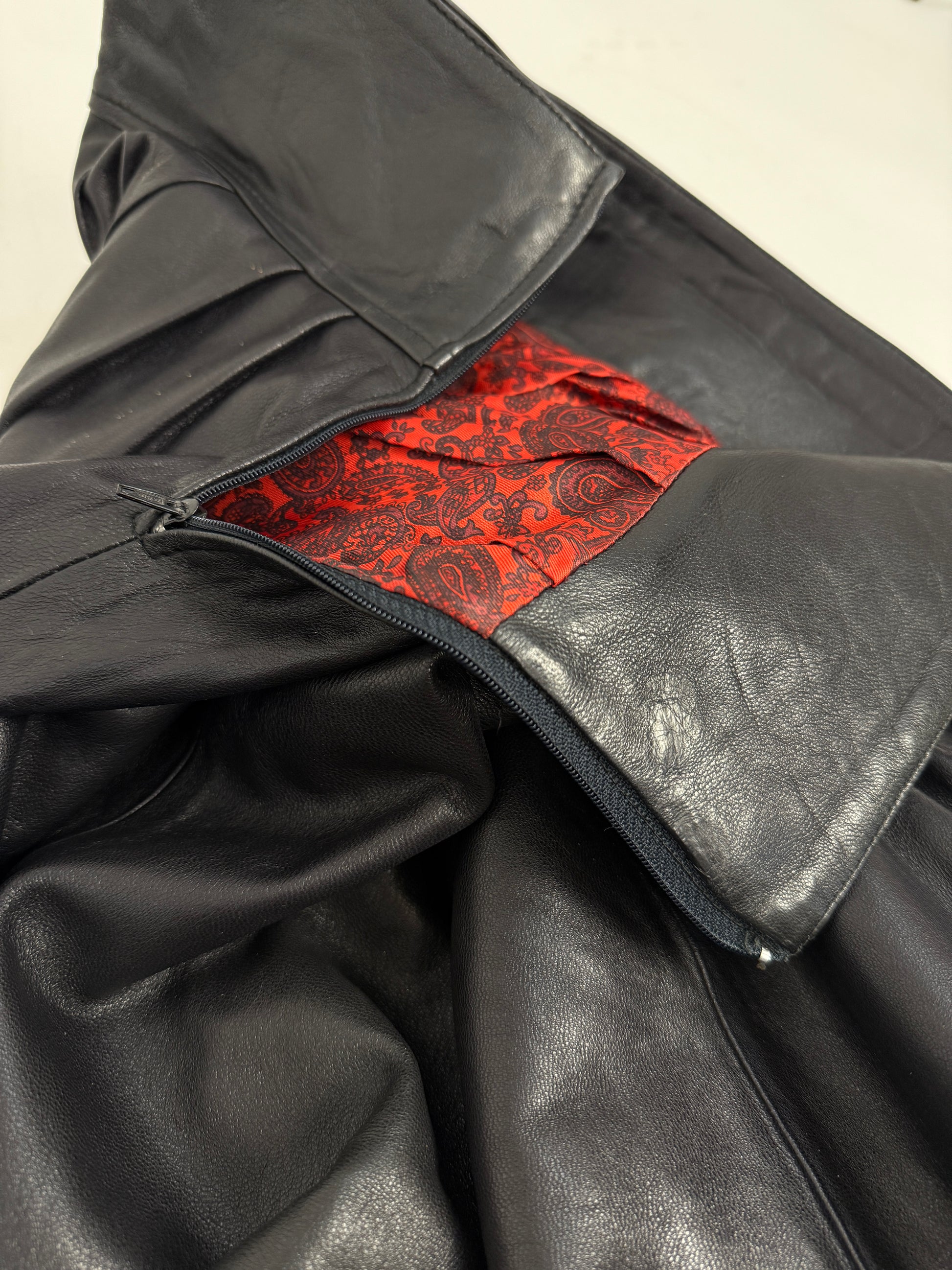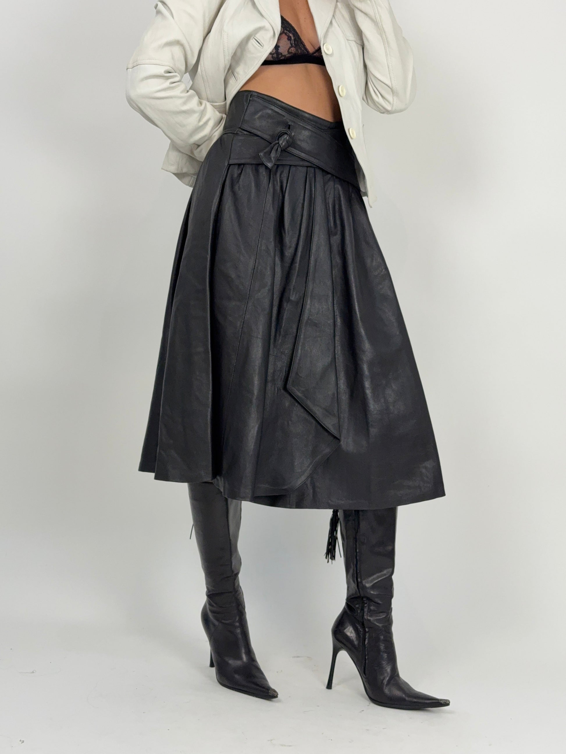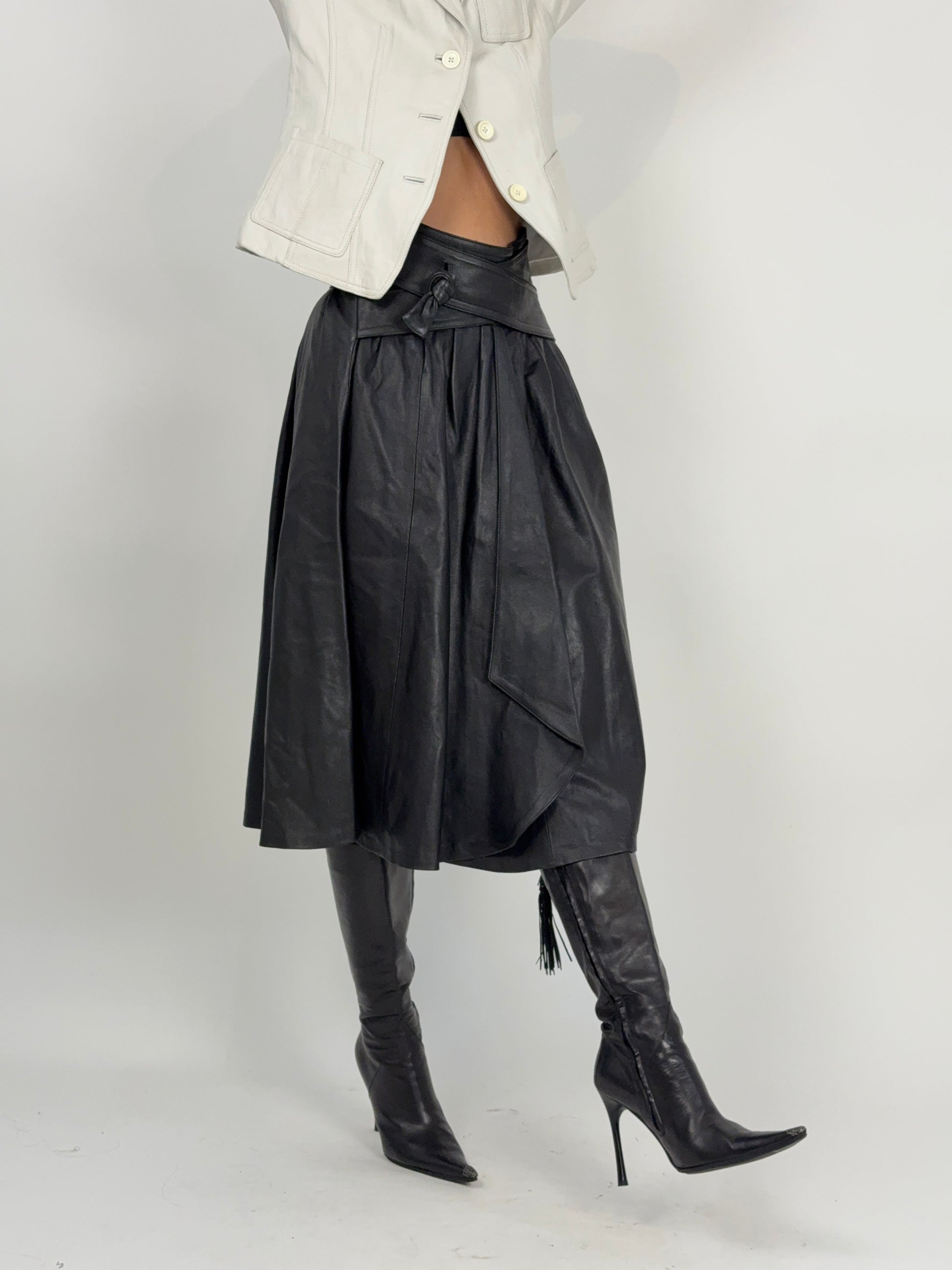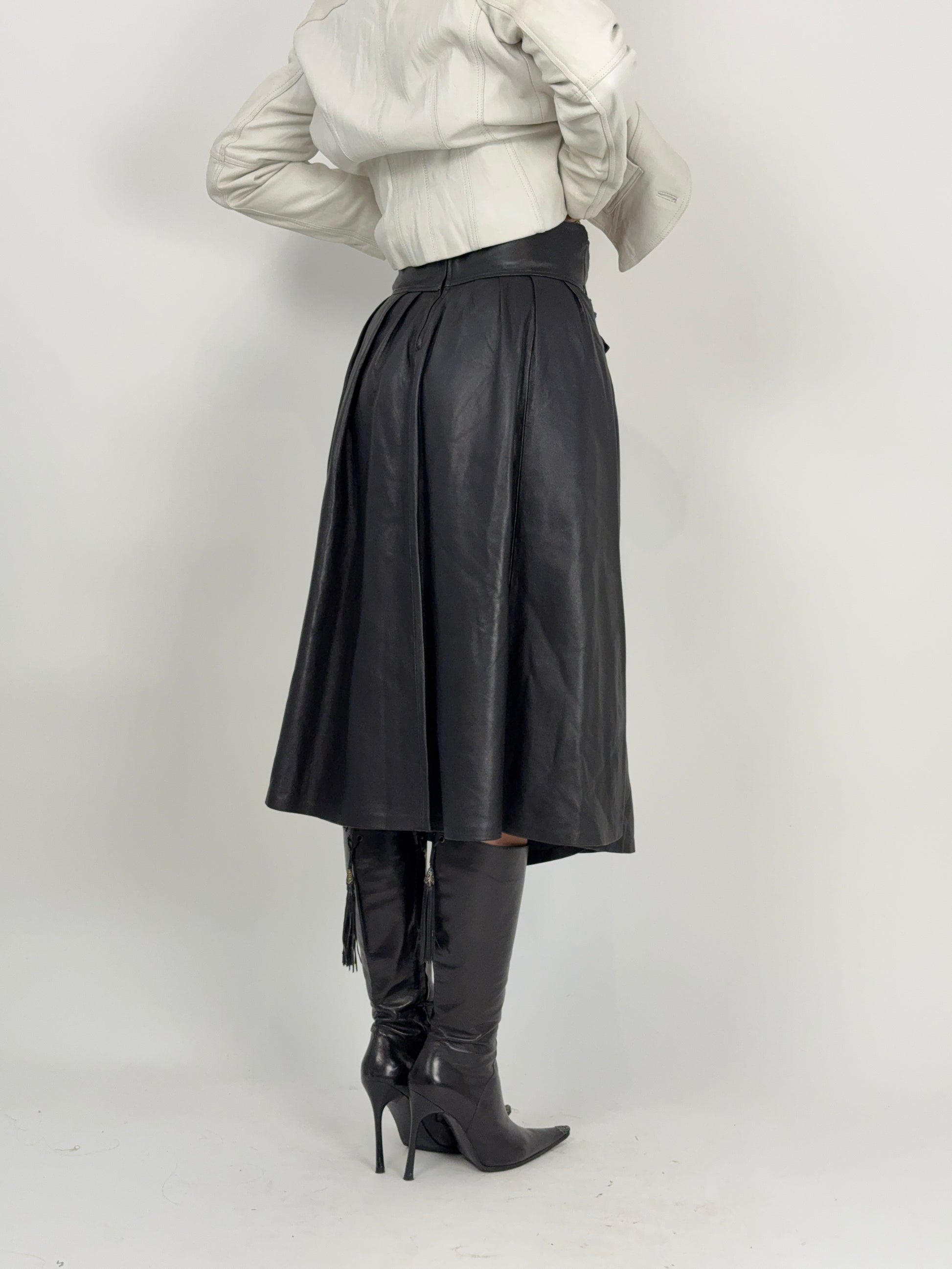 questa gonna midi in pelle nera vintage è un perfetto esempio di moda retrò che oggi torna protagonista. Realizzata in vera pelle morbida, presenta una vita alta strutturata con dettaglio fiocco laterale e una linea ampia e plissettata che valorizza la silhouette femminile.