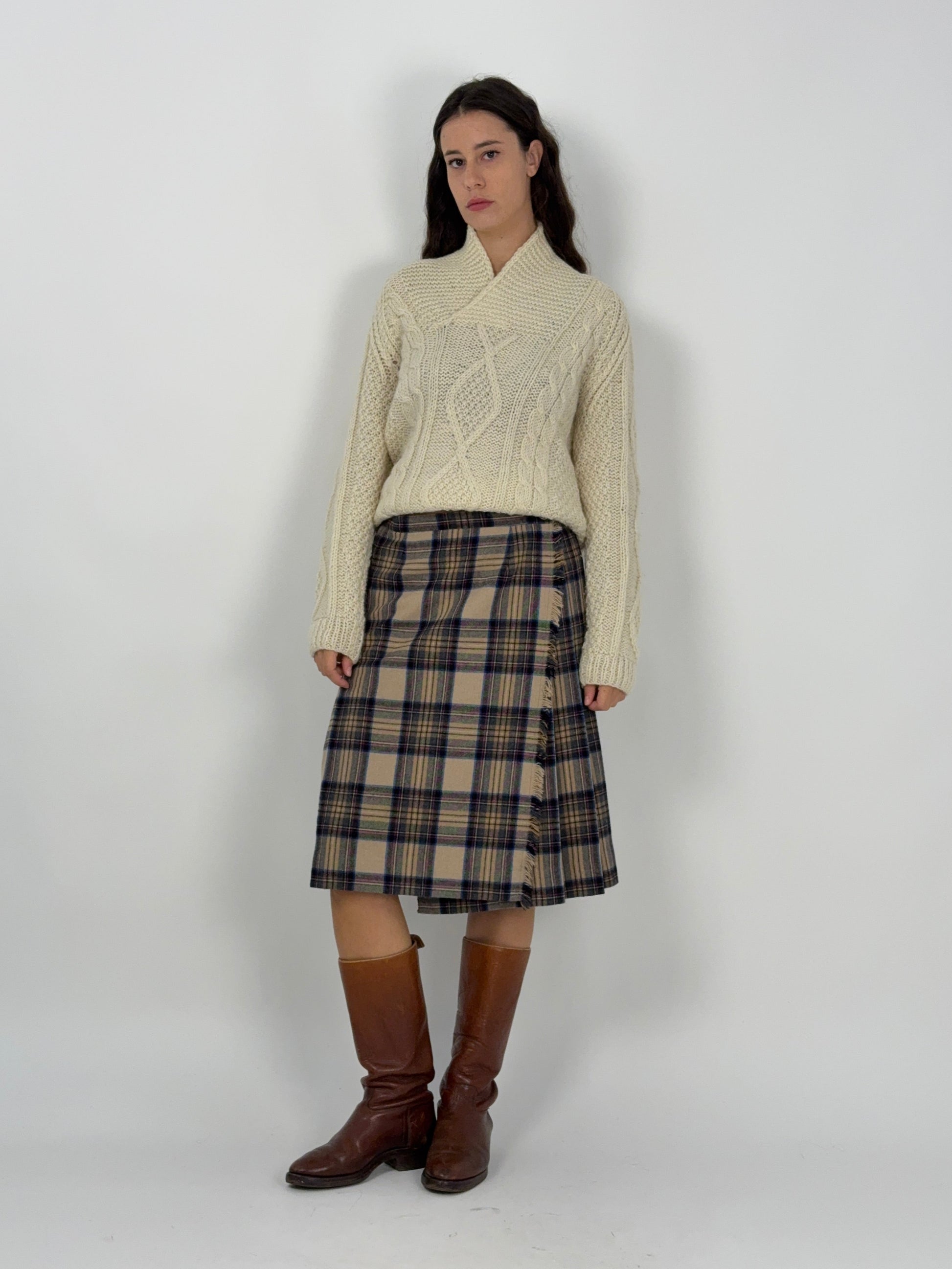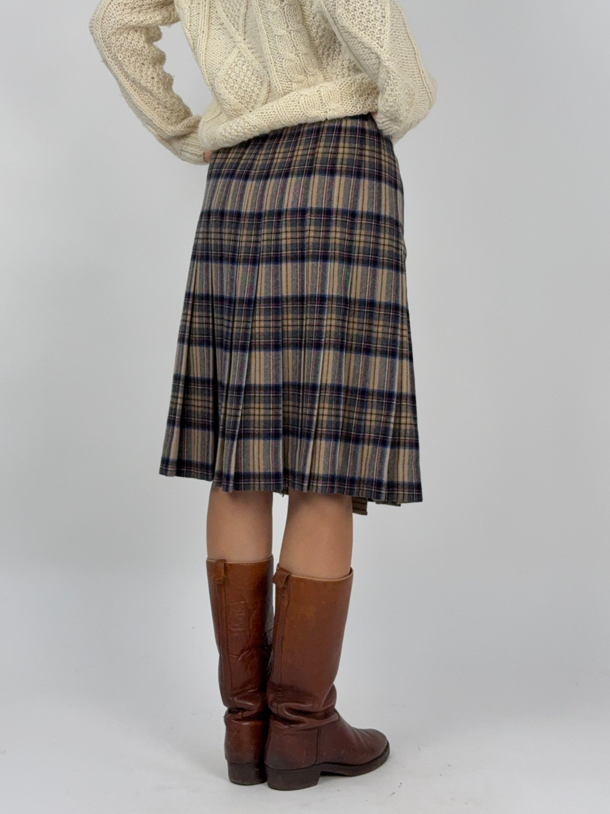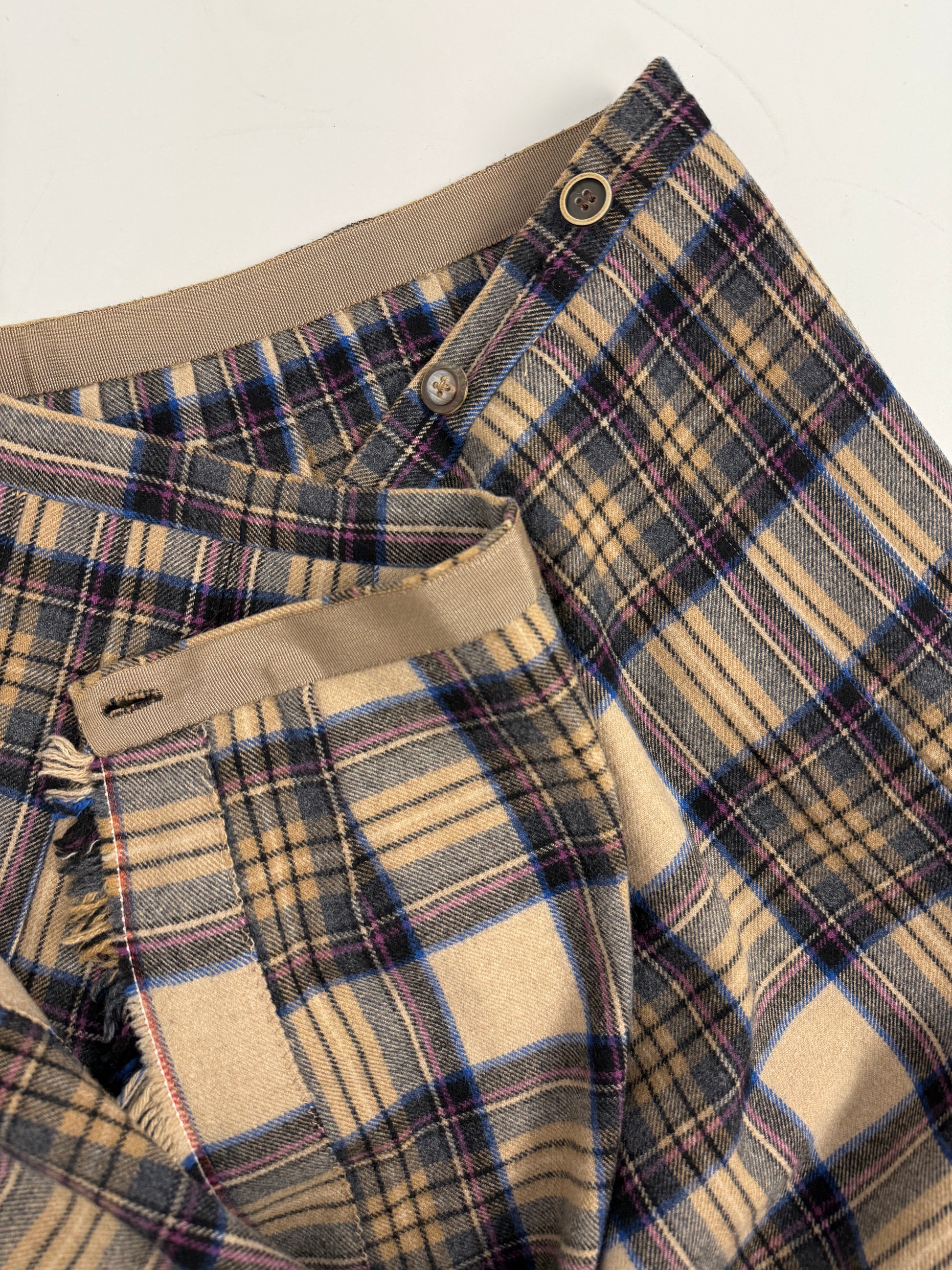 Un capo iconico dello stile heritage: gonna vintage a pieghe in lana, fantasia tartan scozzese nei toni del beige con dettagli blu e viola. Linea morbida, lunghezza al ginocchio e chiusura laterale con bottoni.