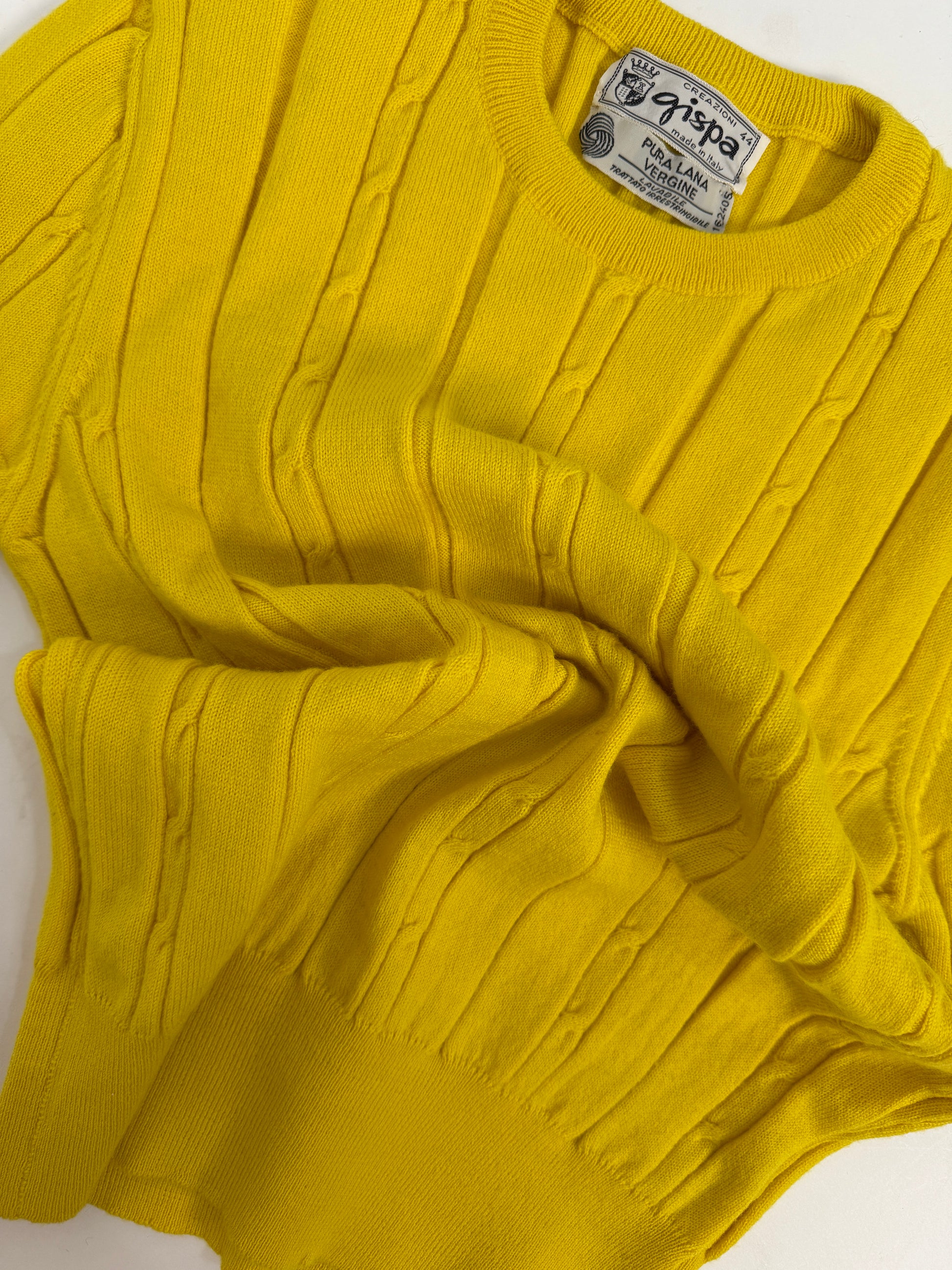 Maglia a maniche corte in pura lana vergine con motivo verticale in rilievo e fondo/colli a costine. Il giallo pieno accende qualsiasi look, dal denim alle gonne sartoriali.