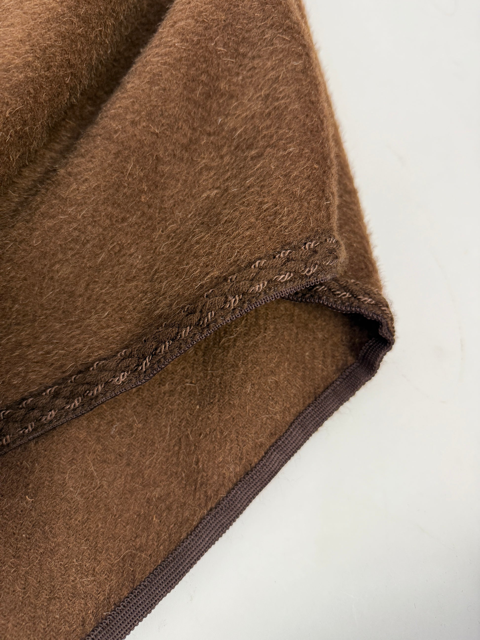 Realizzato in lana marrone a pelo lungo, questo capo oversize avvolge con calore e carattere, ricordando le atmosfere bohemien e western degli anni ’70. La linea morbida e fluida rende questo poncho un pezzo versatile, da indossare sopra denim a zampa, stivali o outfit più minimal per creare un contrasto ricercato.