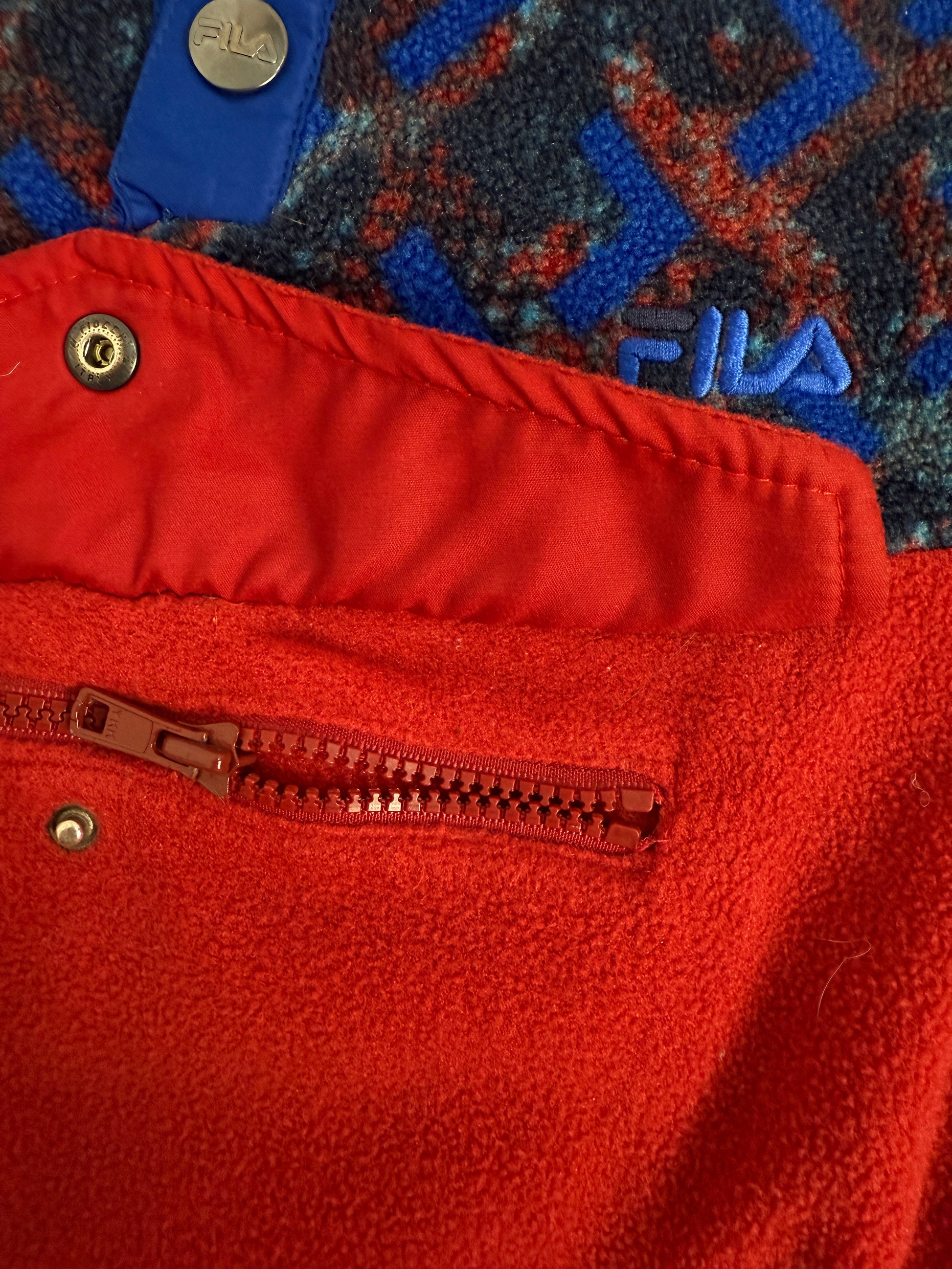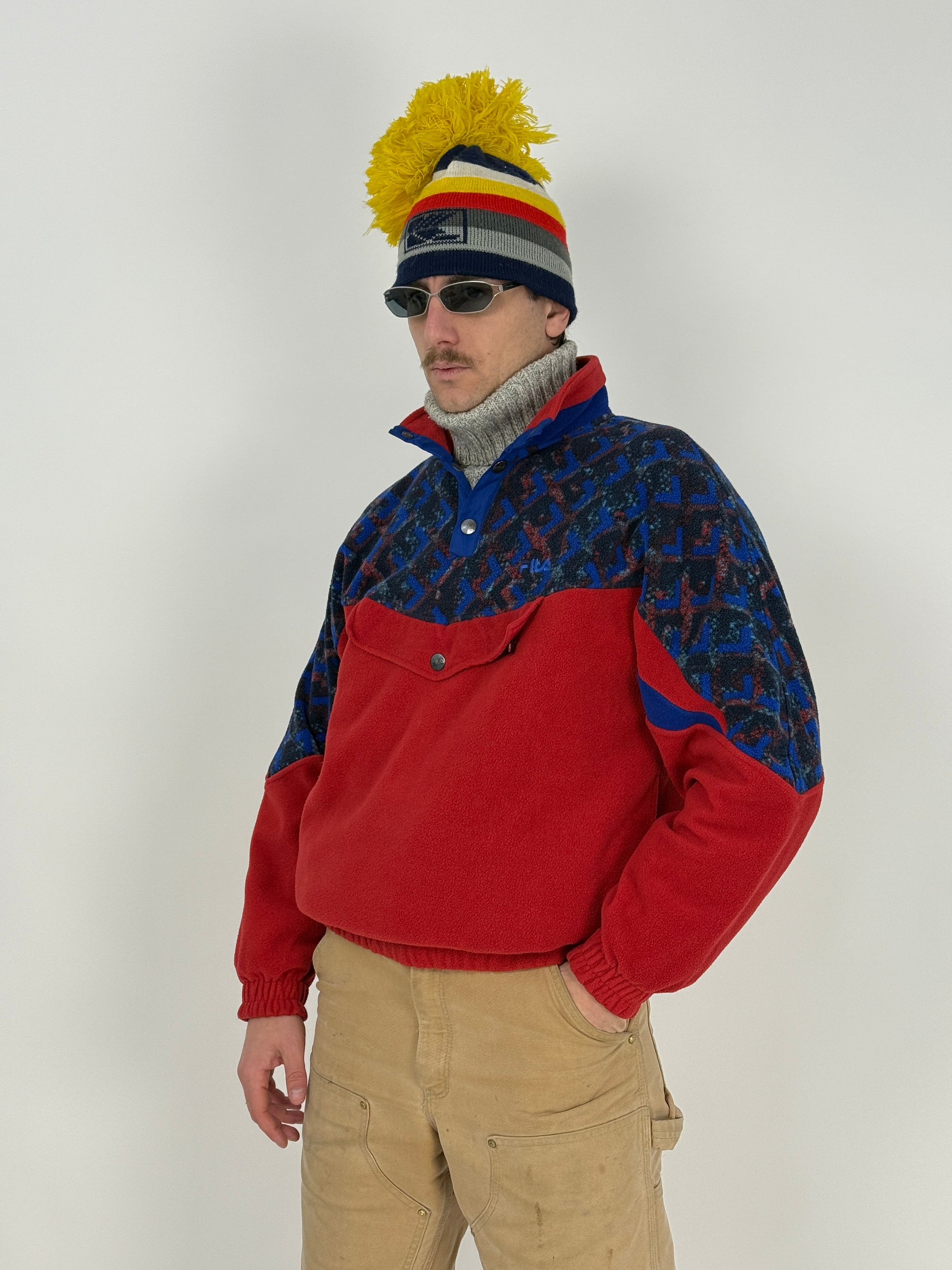 Pile FILA vintage rosso vivo, con inserto geometrico multicolor blu/nero/rosso tipico della linea outdoor dell’epoca.