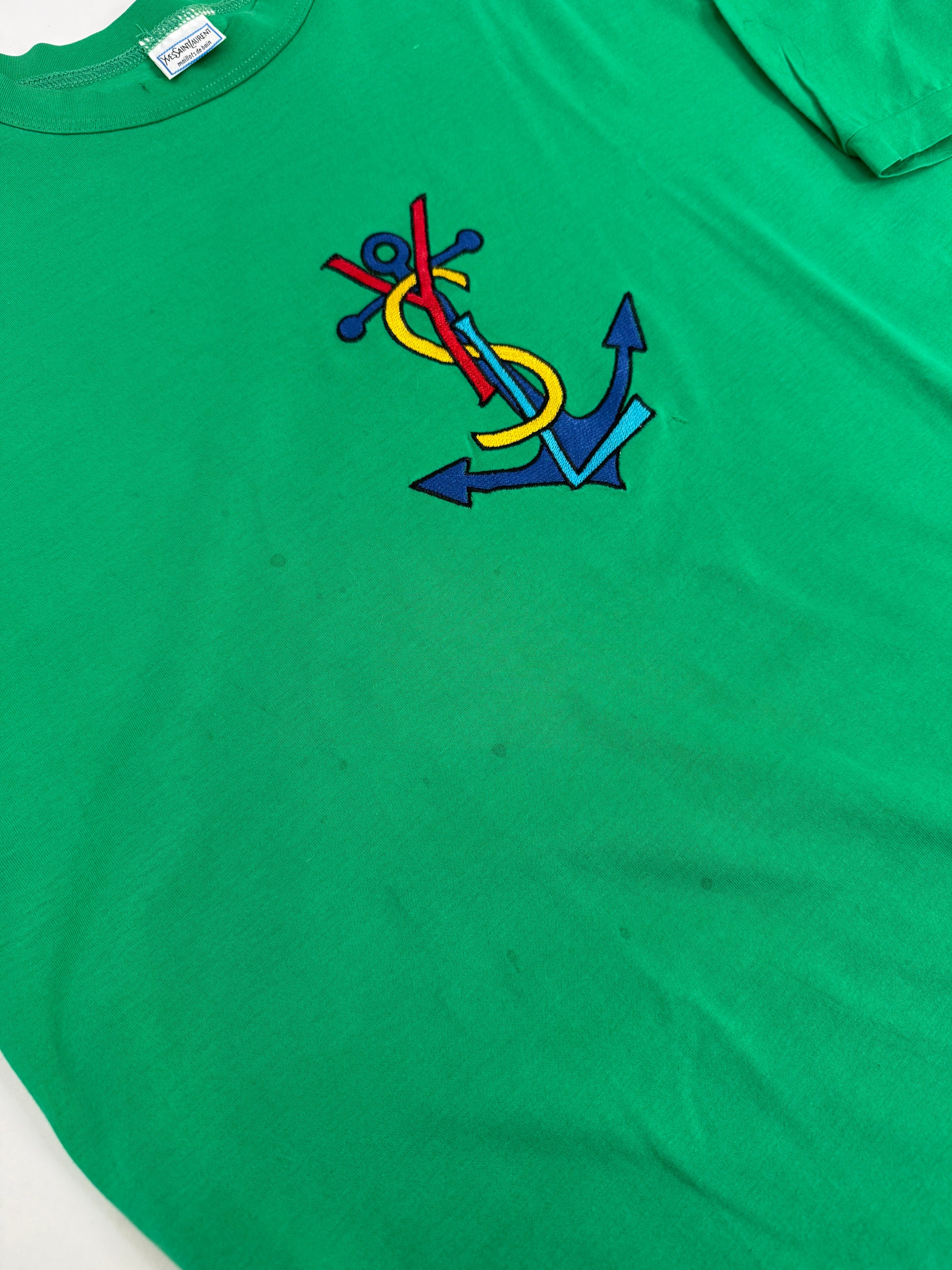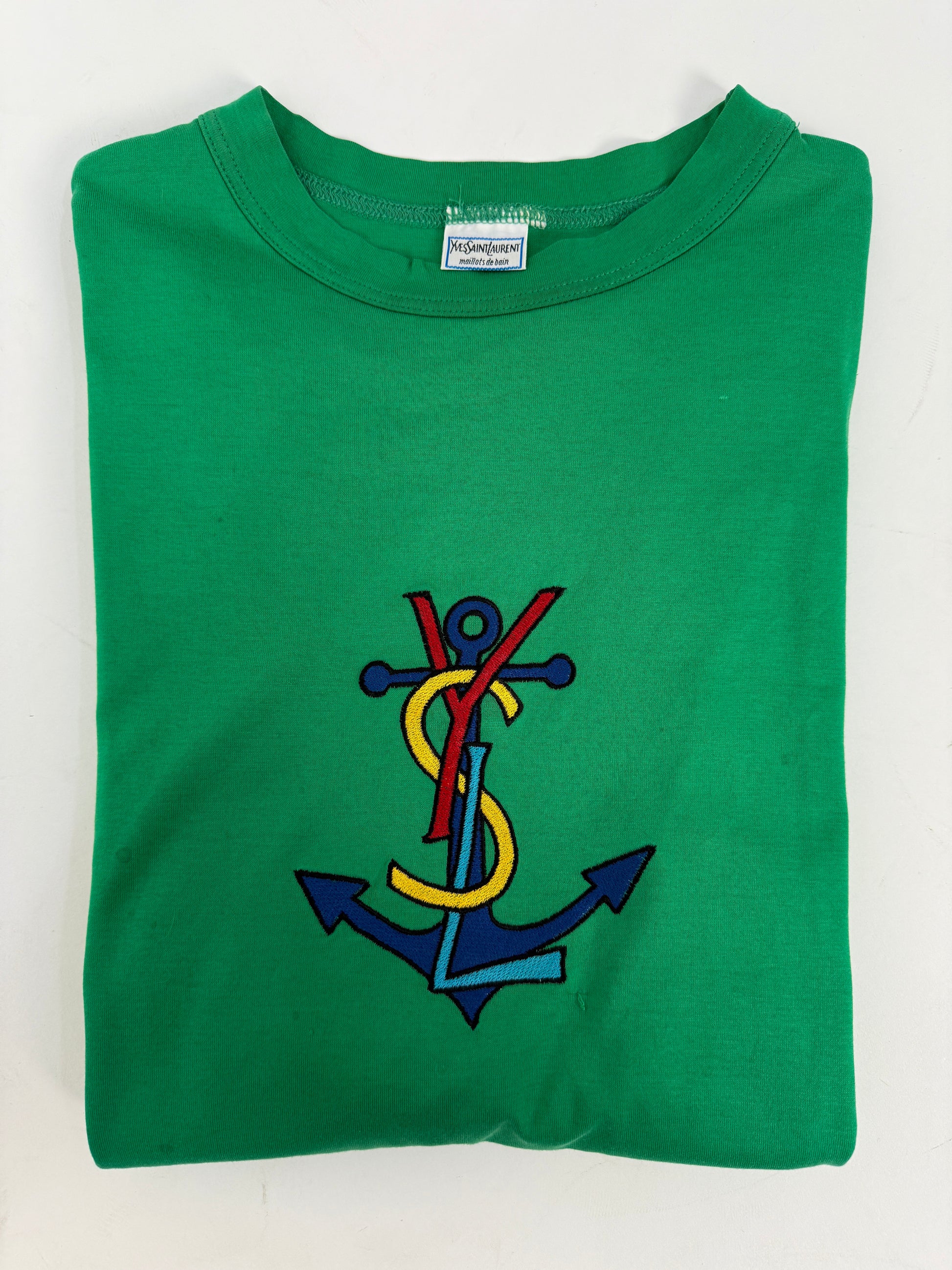 T-shirt Yves Saint Laurent Mailots de bain anni ’90, realizzata in morbido cotone verde brillante con maxi logo YSL ancorato ricamato multicolor sul petto, uno dei simboli più riconoscibili del periodo navy chic della maison francese.