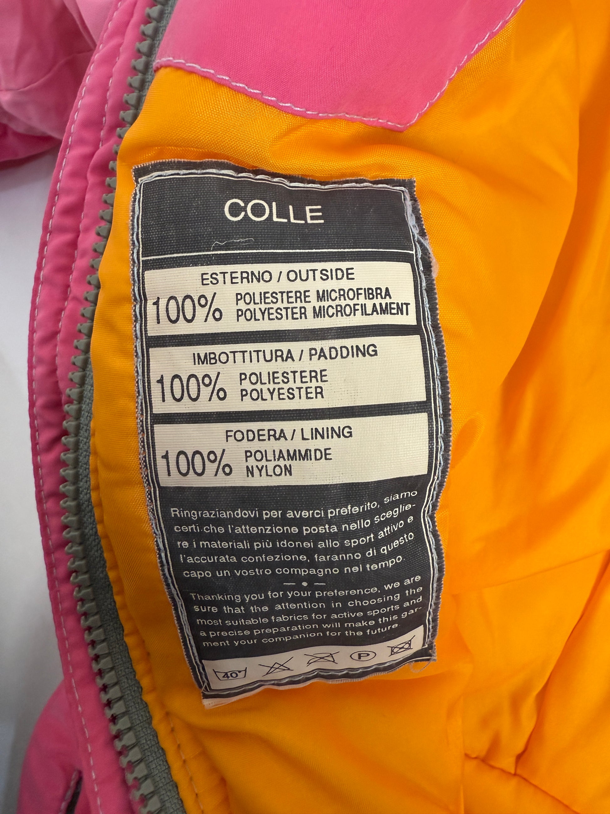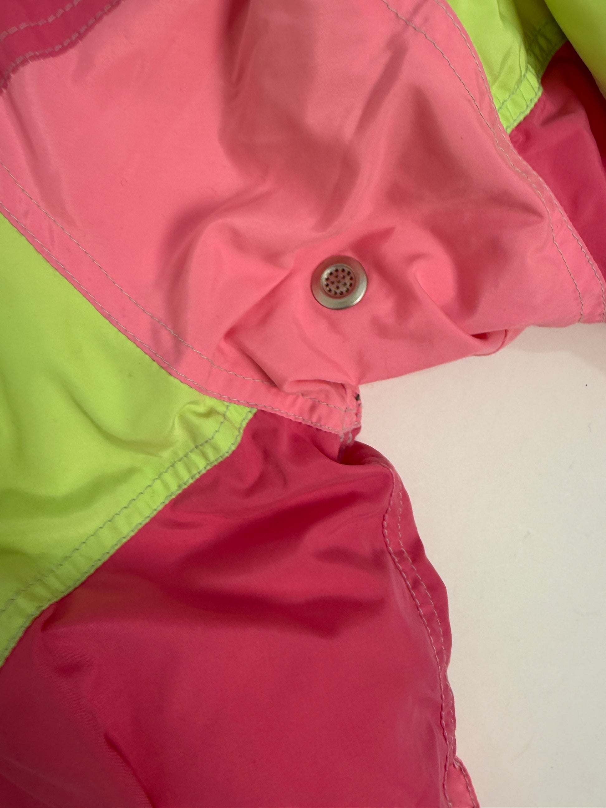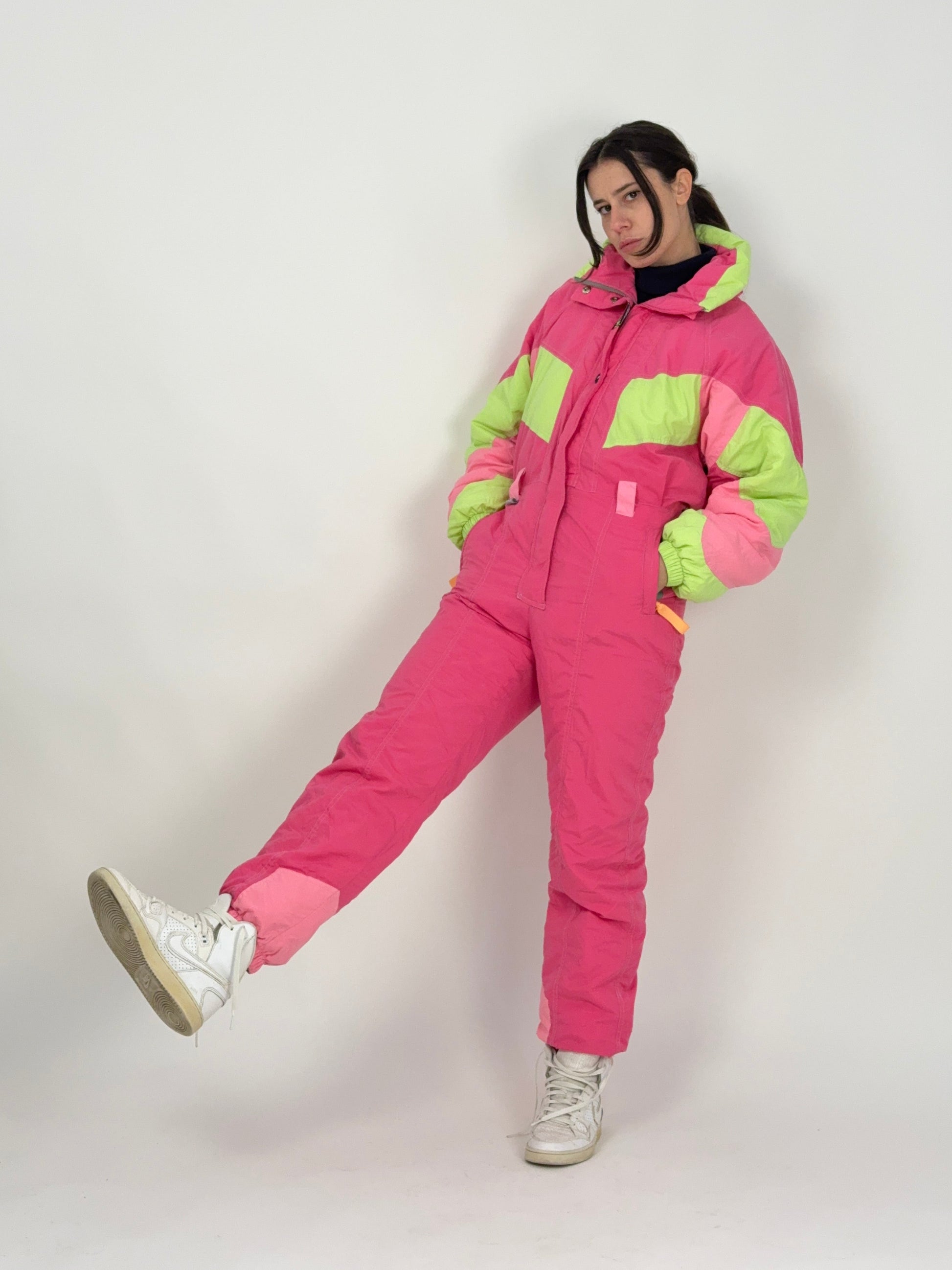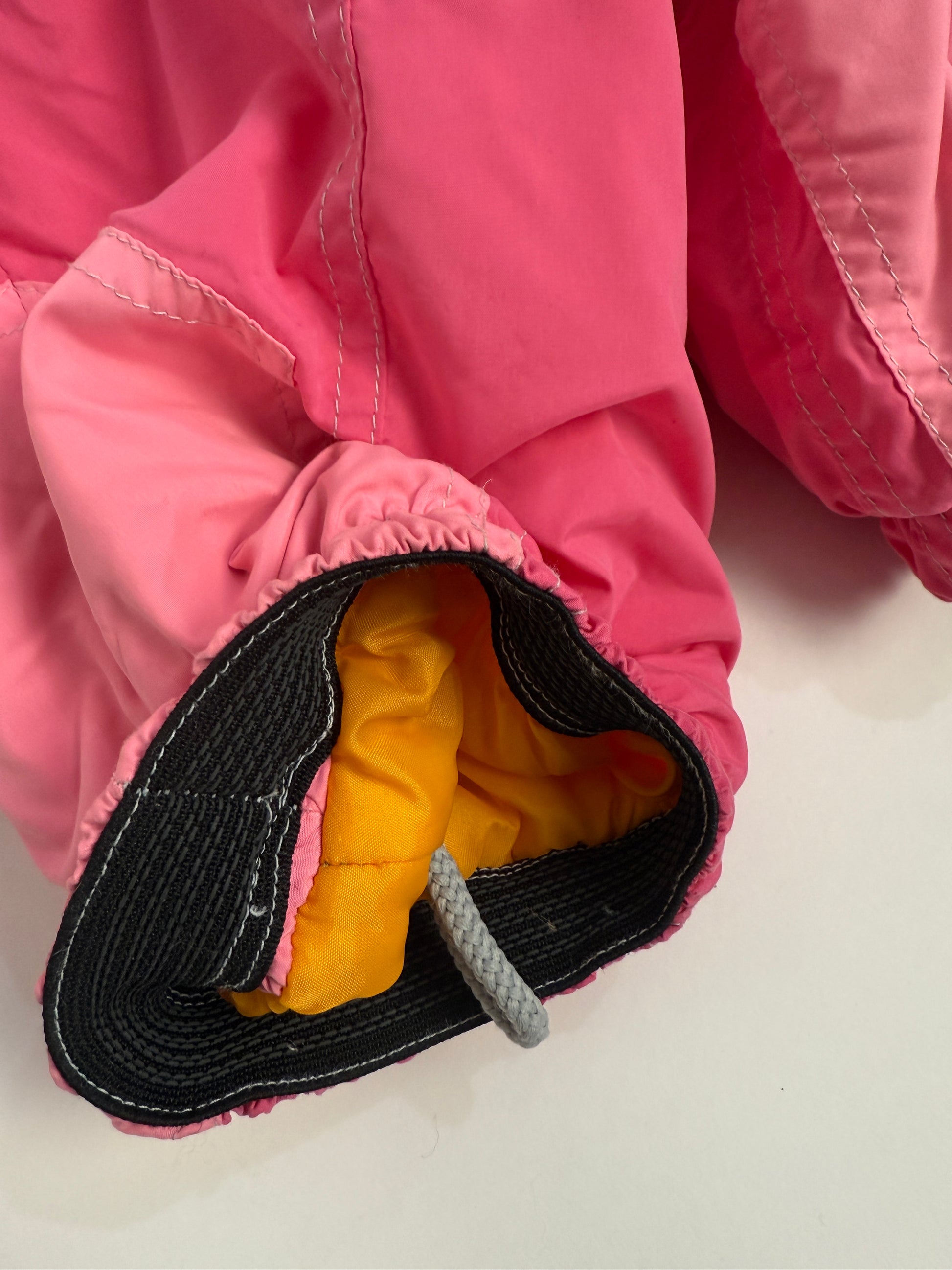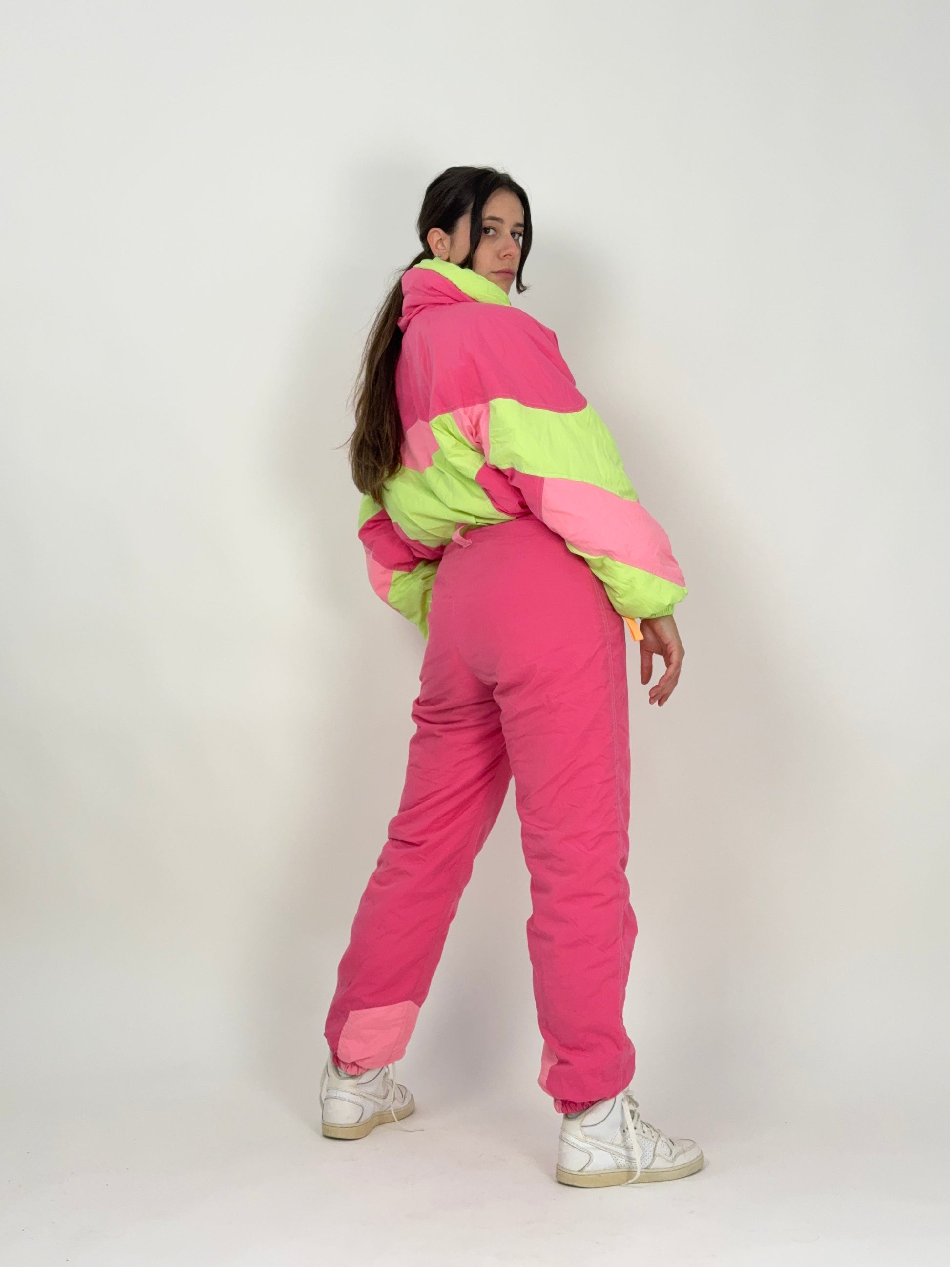 Il color block rosa shocking e verde fluo è inconfondibile, così come i dettagli tecnici d’archivio: chiusura a zip frontale, cintura in vita regolabile e polsini elasticizzati.