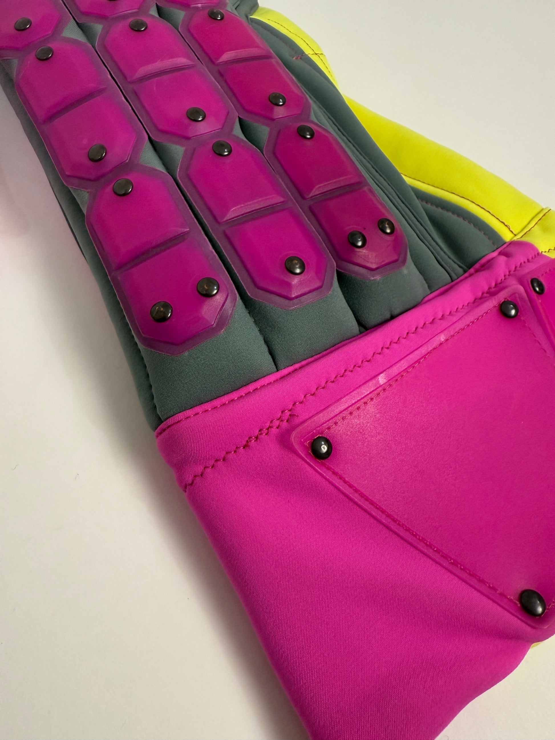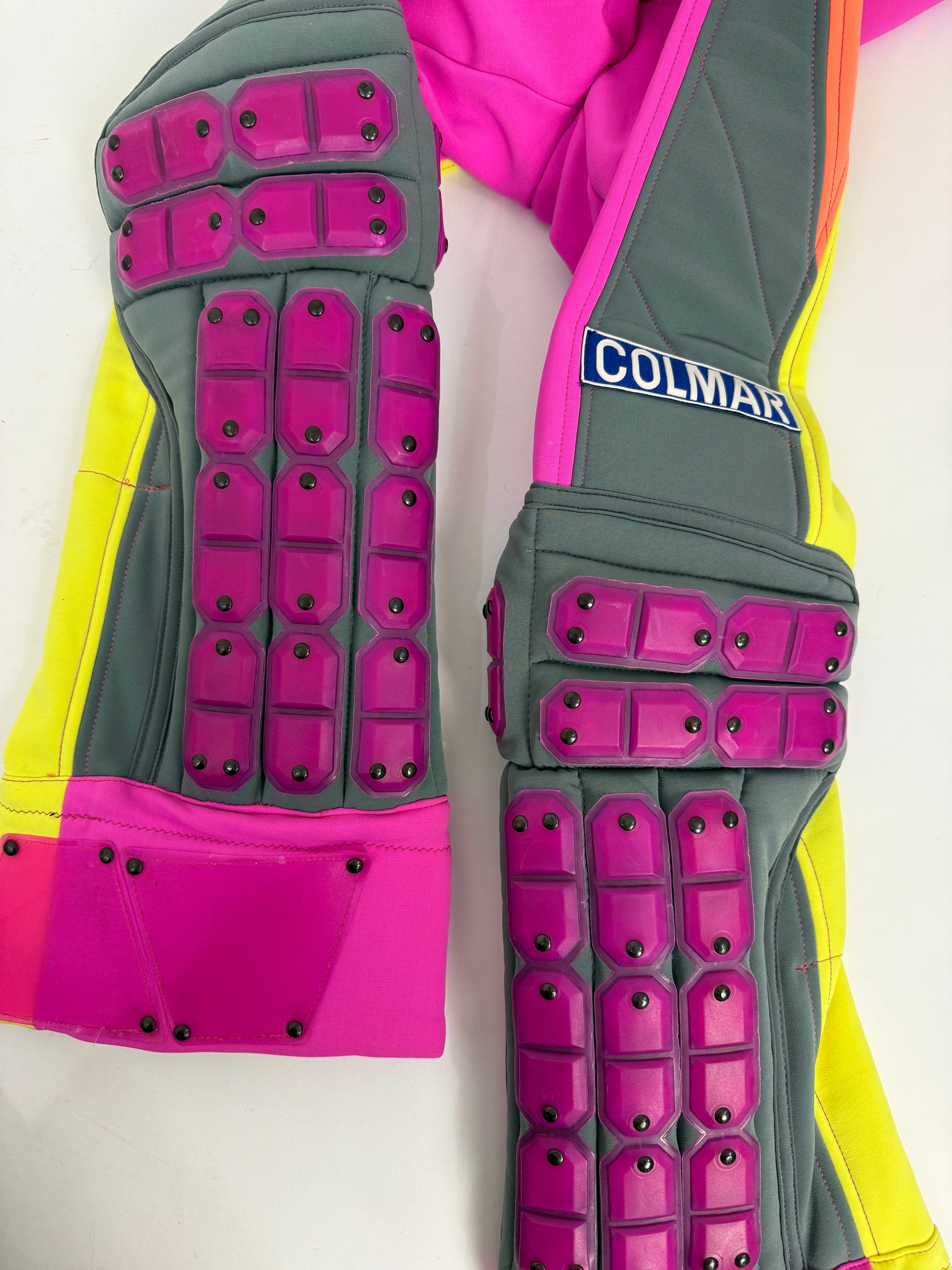 La tuta presenta una spettacolare combinazione fluo fucsia, giallo e grigio, con inserti rinforzati e protezioni rigide sulle gambe, dettaglio tecnico iconico dei modelli da competizione Colmar.