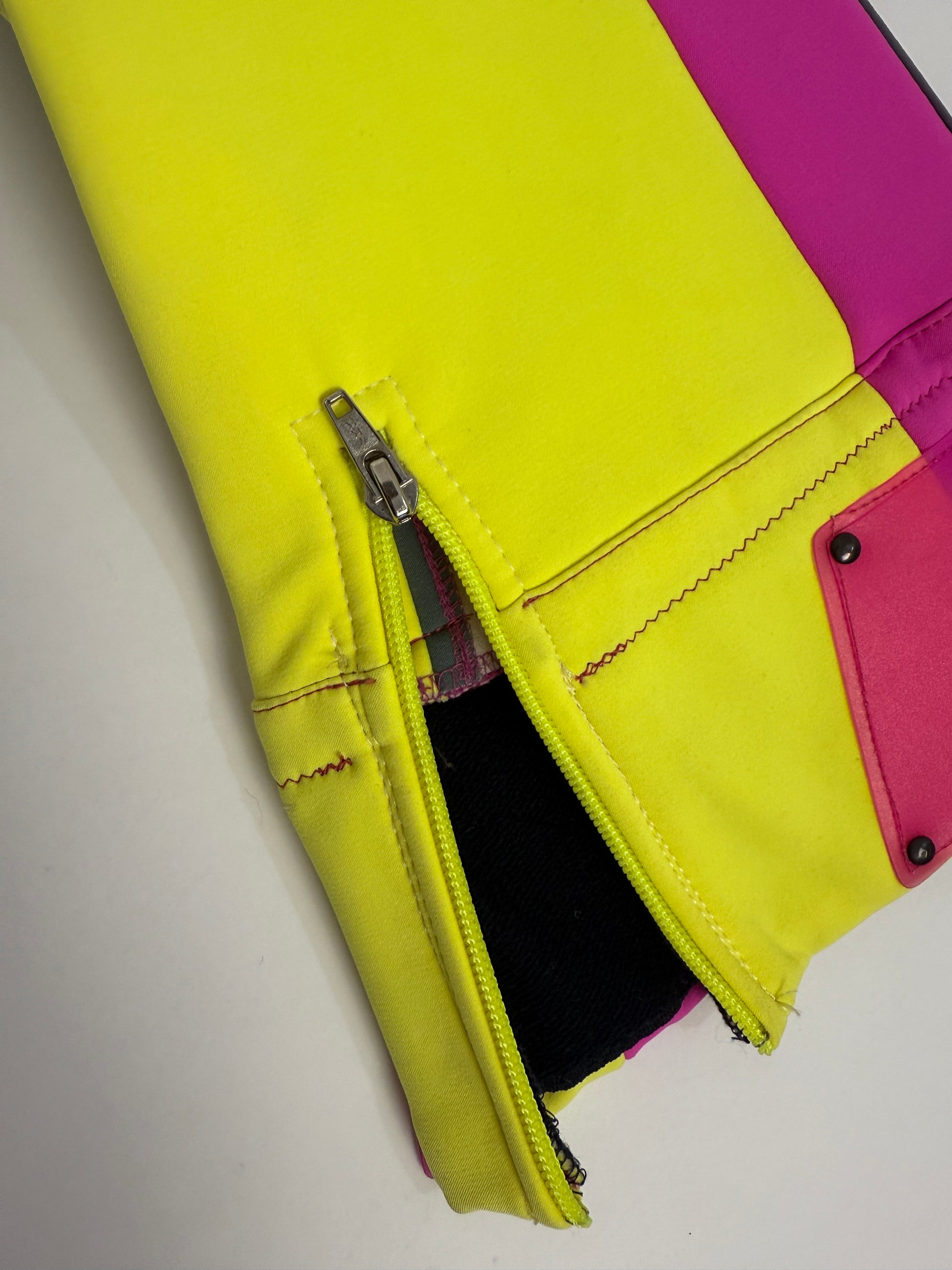 All’interno, la fodera in cotone felpato e il tessuto esterno tecnico elasticizzato offrono comfort e resistenza, bretelle regolabili, mentre le zip YKK, i loghi Colmar e Pool Sci Italia, e le etichette originali completano il look da gara vintage.