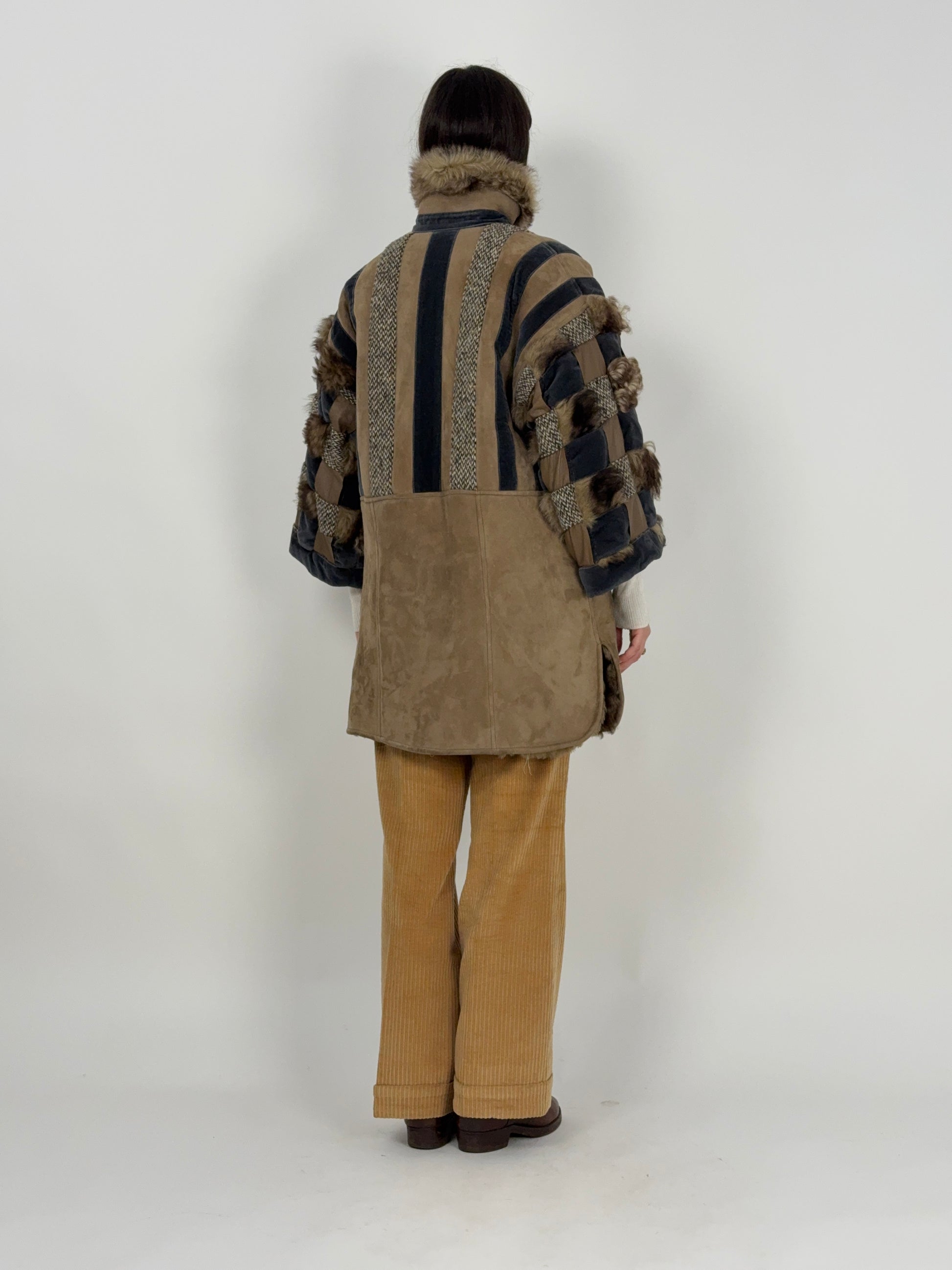 Cappotto anni '70 patchwork in camoscio e pelliccia