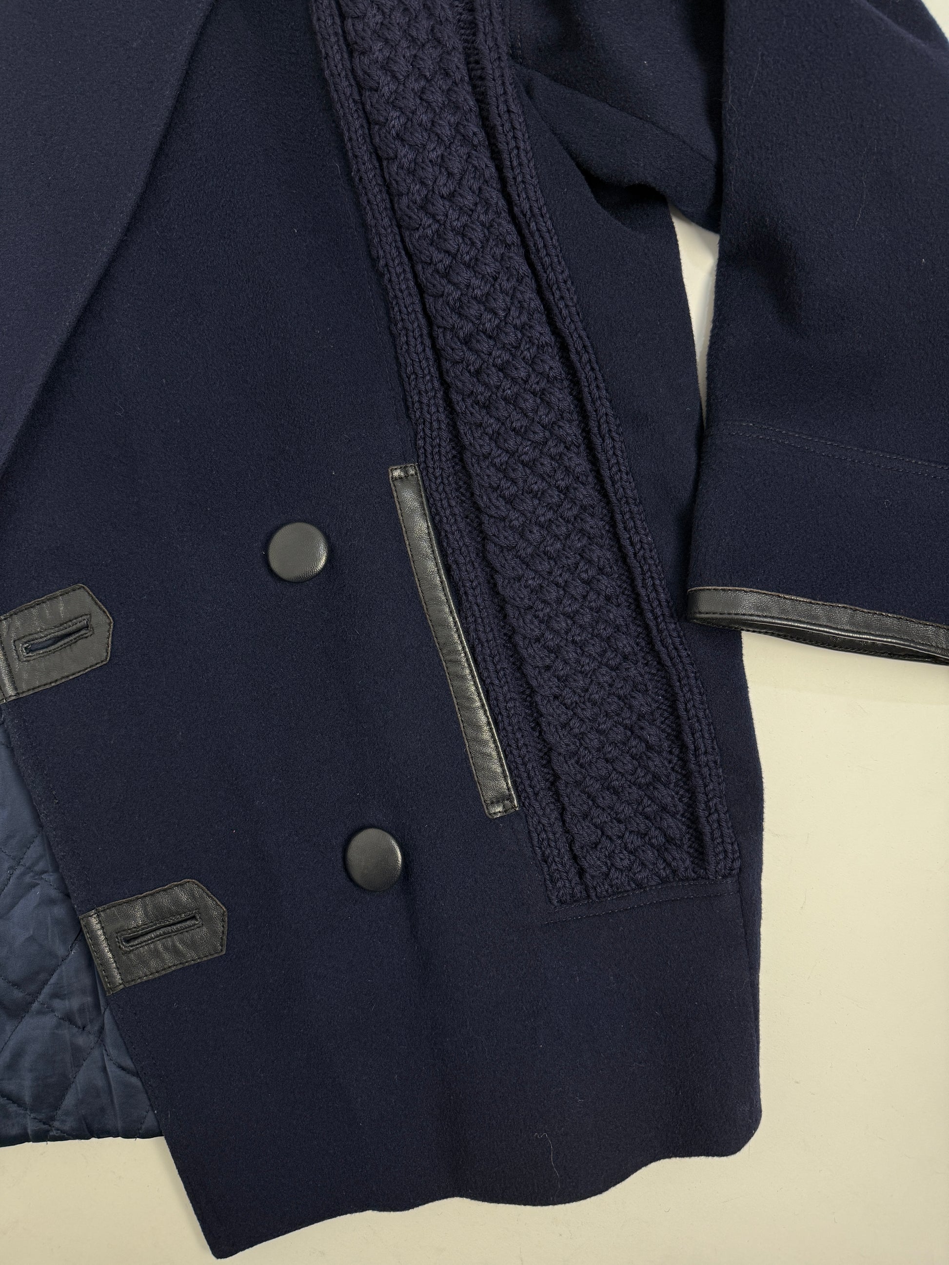 Gli inserti in maglia intrecciata sulle spalle e sui fianchi sono la sua firma estetica: un dettaglio che racconta una lavorazione ricercata e tipica dei capispalla premium dell’epoca. Le finiture in ecopelle nera su tasche e abbottonatura aggiungono contrasto e raffinatezza. L’interno è trapuntato, caldo e comodo, pensato per affrontare l’inverno