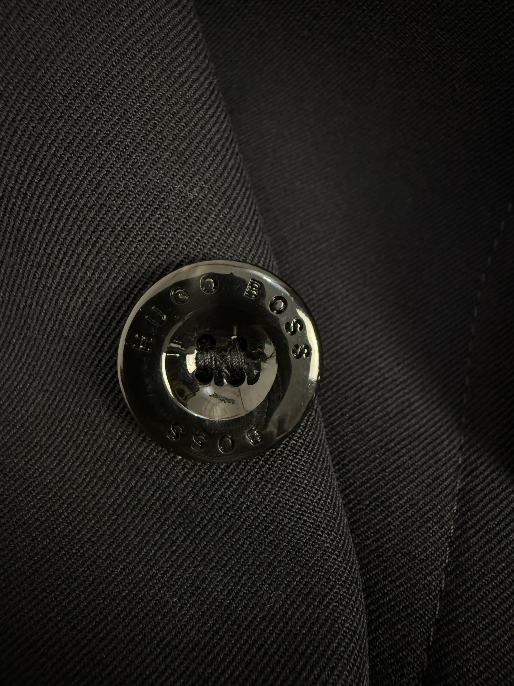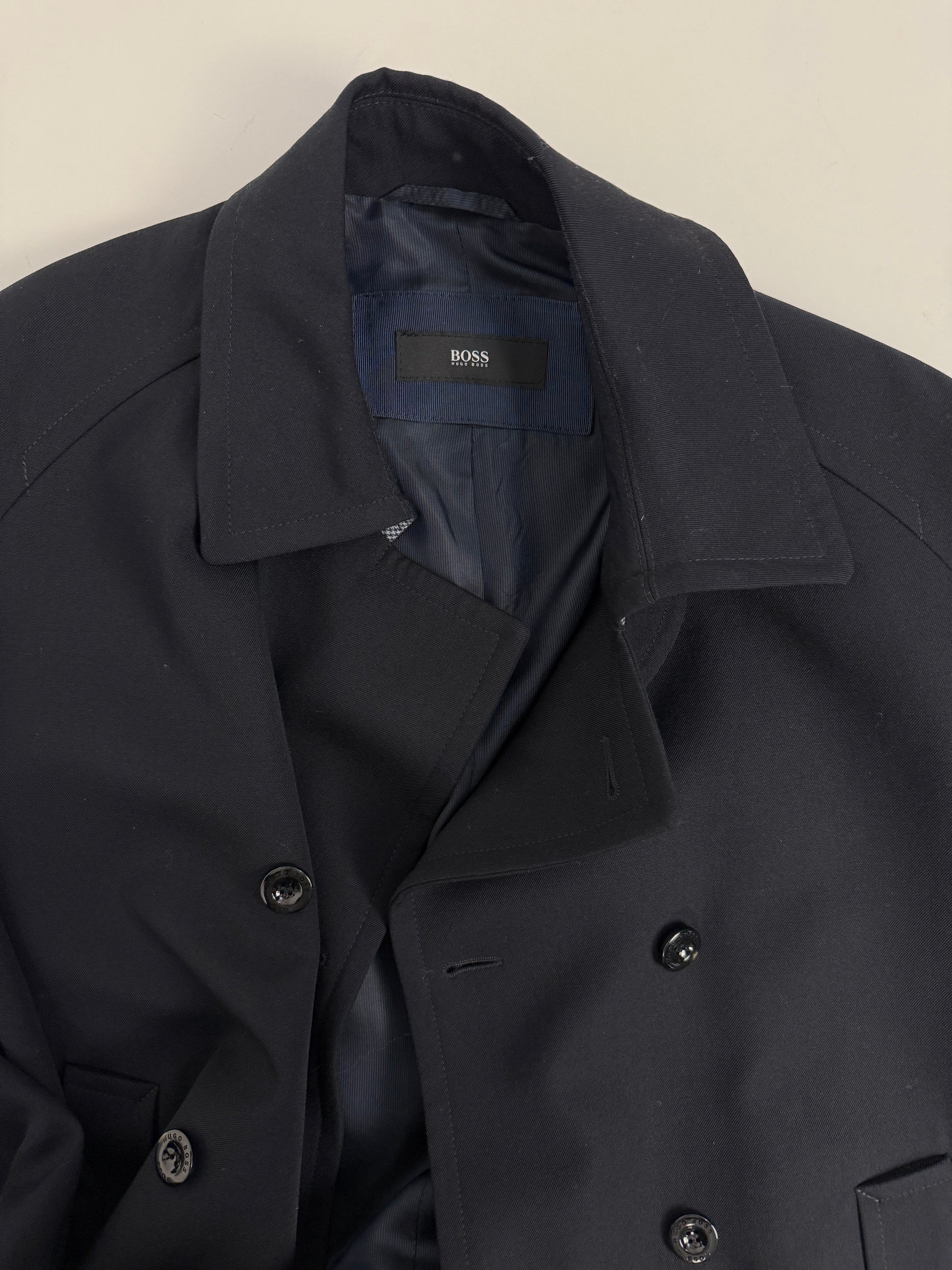 Il taglio doppiopetto, il colletto strutturato e i bottoni firmati Hugo Boss conferiscono al capo una presenza decisa, tipica del guardaroba maschile del brand.