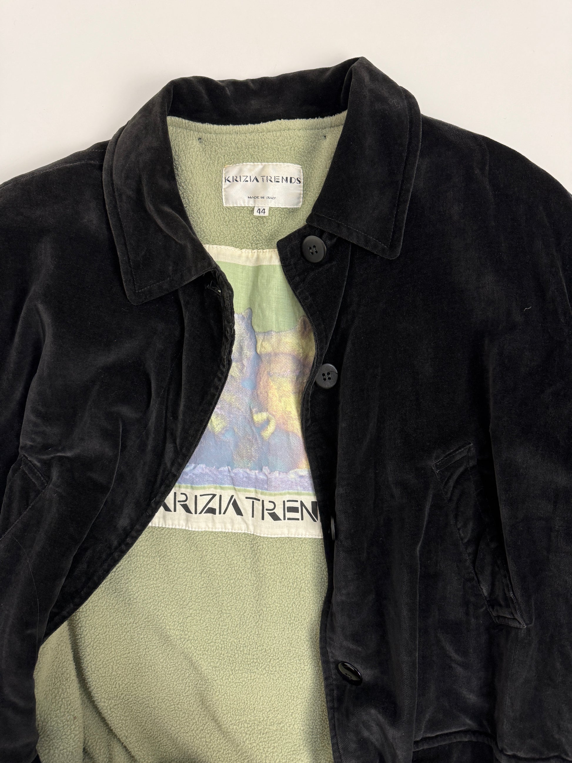 Il velluto, compatto e morbido, viene utilizzato qui in chiave urbana e non serale: Il taglio è pulito, rilassato, con volumi equilibrati che cadono bene sul corpo senza costringerlo, all’interno la fodera in caldo pile illustrata Krizia Trends: un dettaglio narrativo, quasi intimo, tipico del brand in quegli anni. Abbottonatura frontale e due tasche