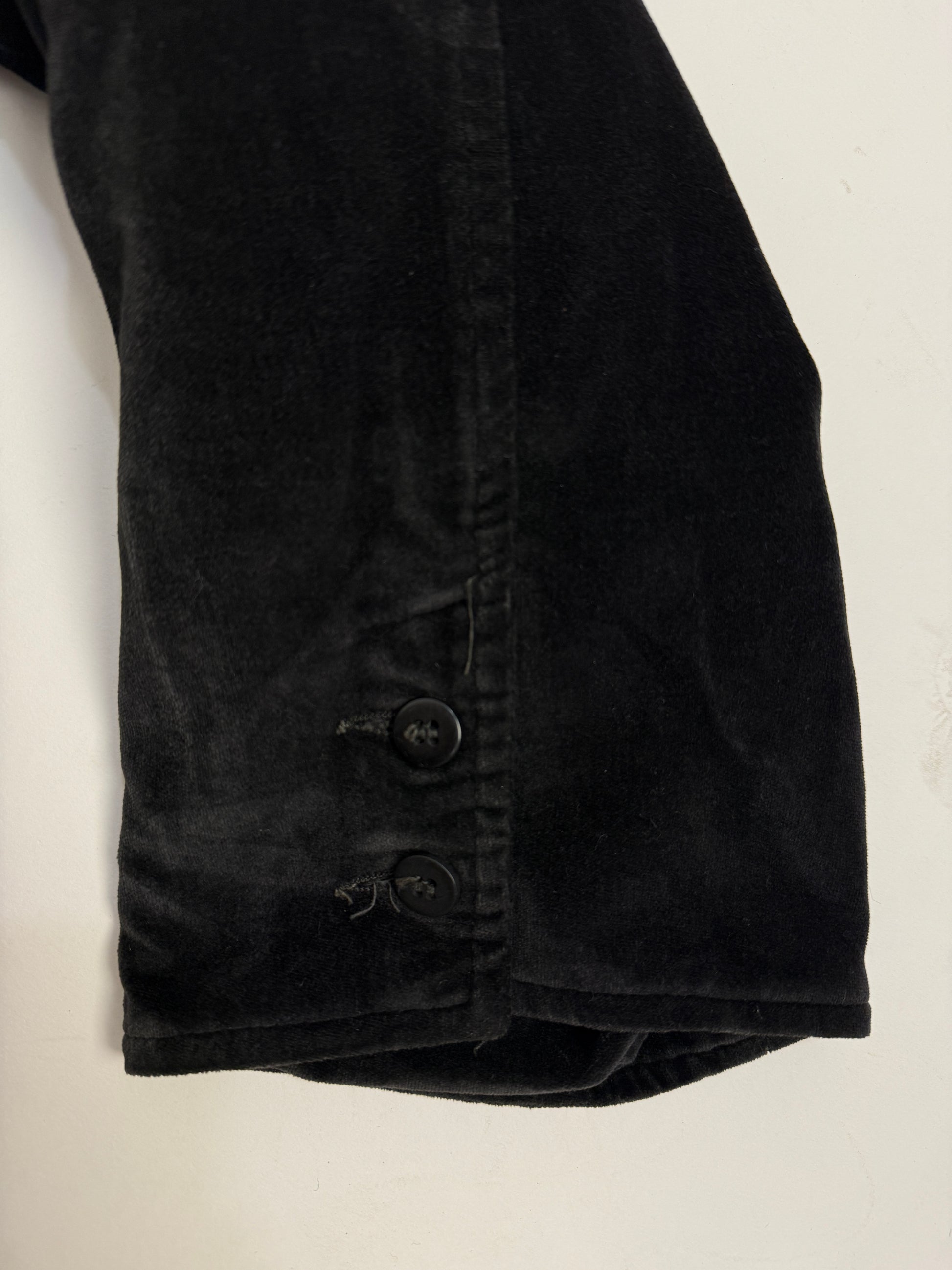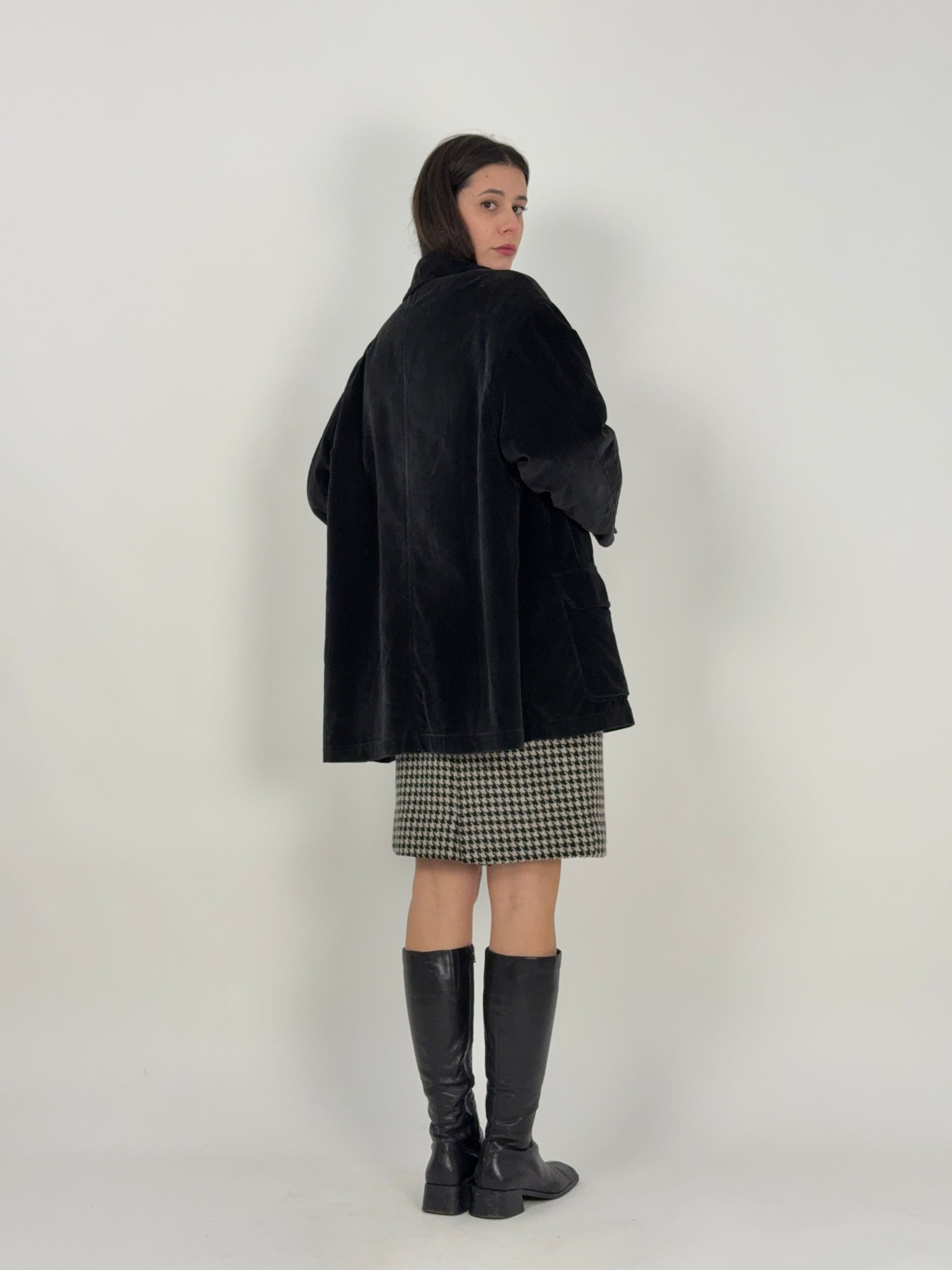 Cappotto vintage Krizia Trends in velluto nero, un capo che racconta una fase precisa e affascinante della moda italiana: fine anni ’80 / primi anni ’90, quando Krizia sperimenta una femminilità più quotidiana, colta e personale, senza mai rinunciare alla profondità progettuale.