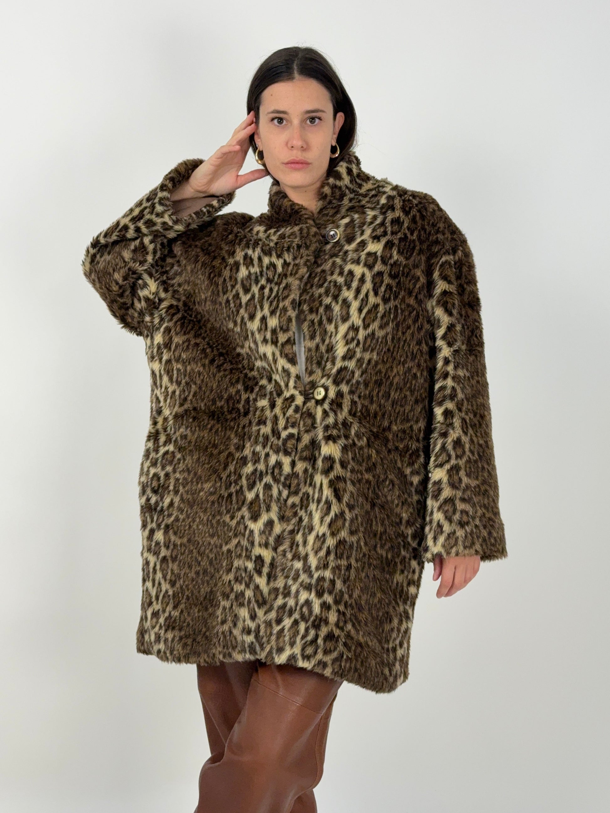 Cappotto vintage in eco pelliccia leopardata, autentico capo Made in Italy degli anni ’70.