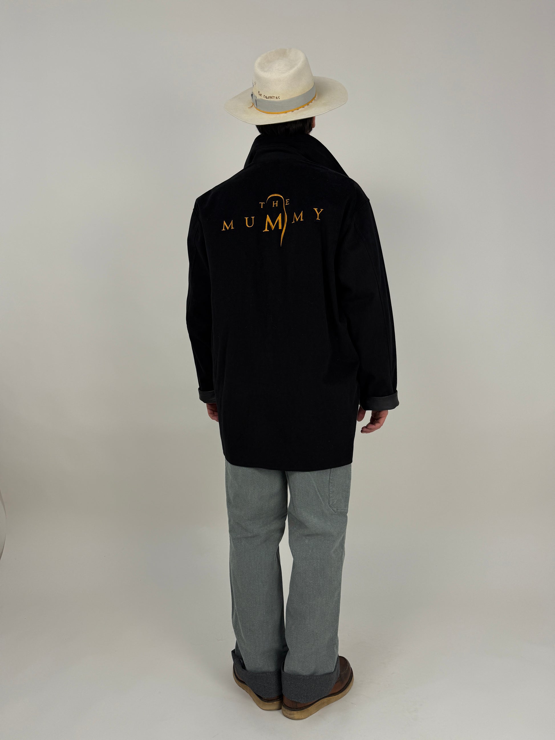 Realizzato in cotone pesante con dettagli in vera pelle su colletto e polsini, presenta sul retro il ricamo ufficiale The Mummy in filo dorato, lo stesso font utilizzato nei materiali originali del film.