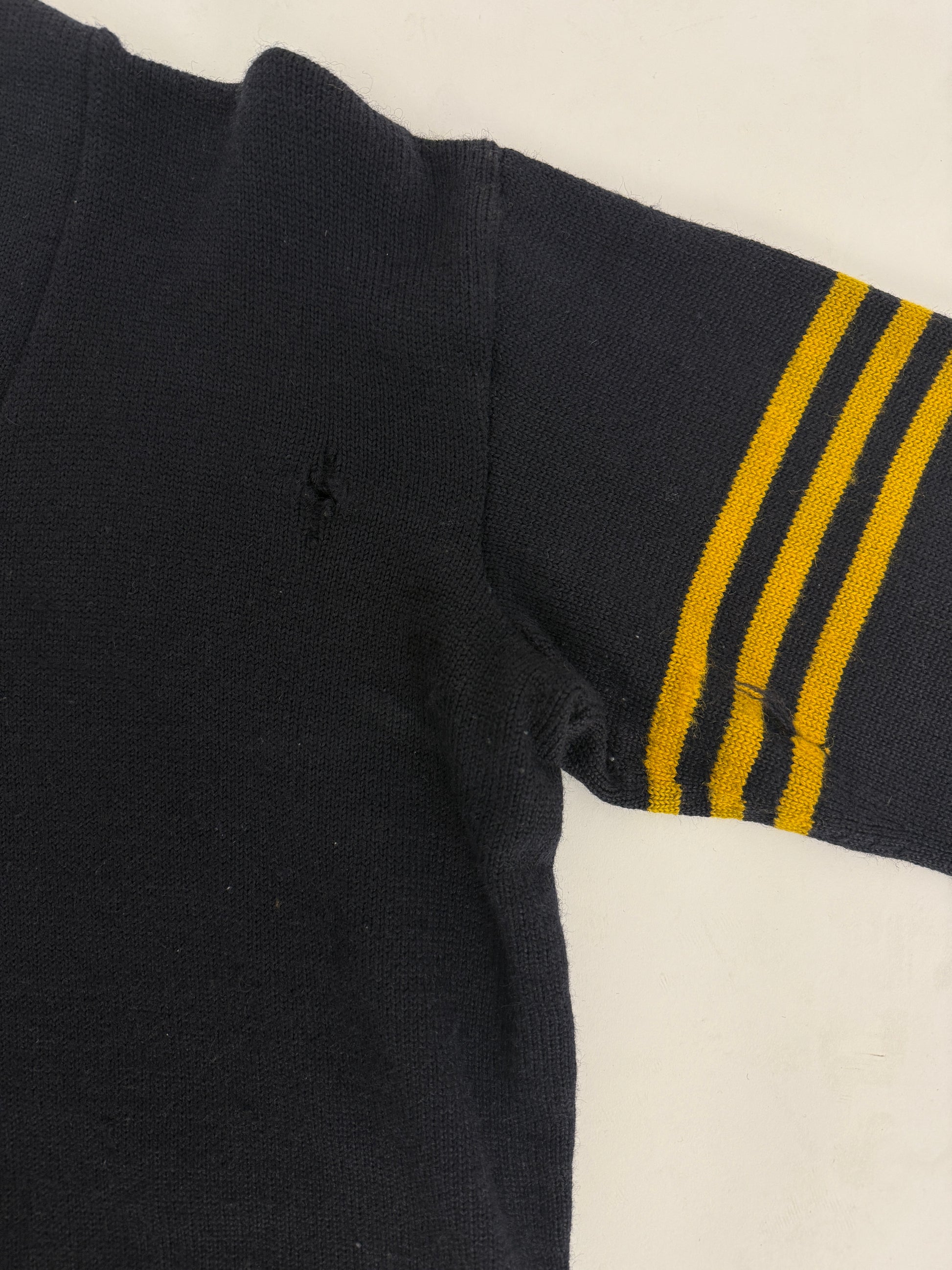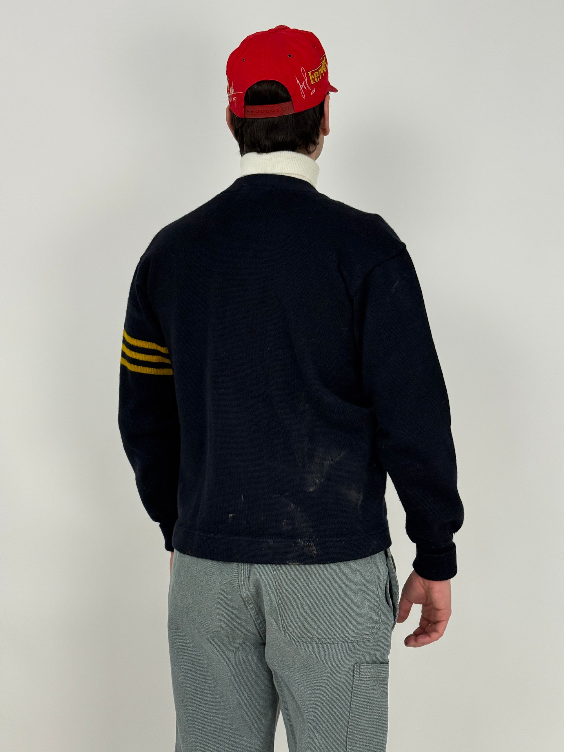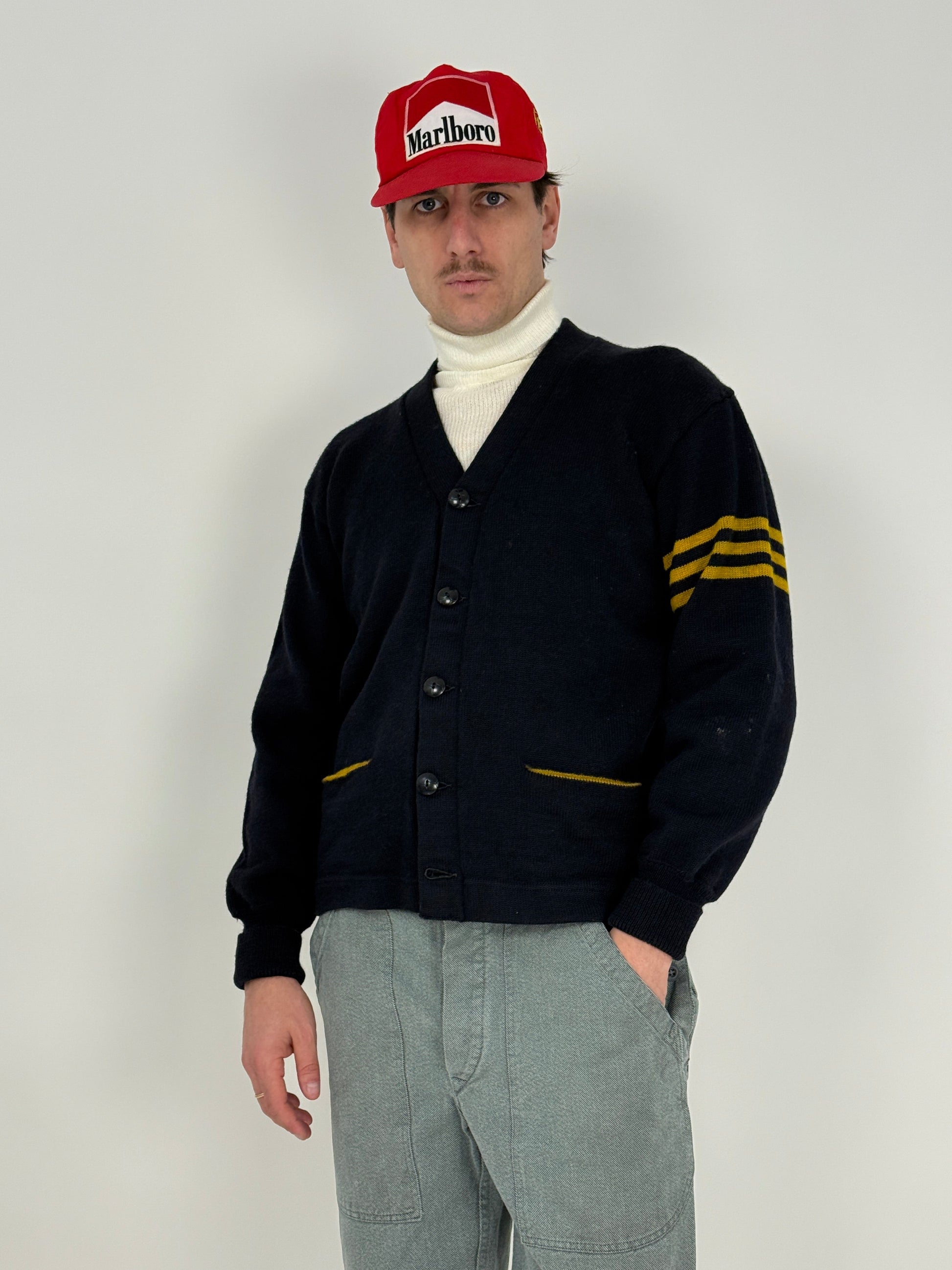 Un pezzo d’archivio che parla da solo: cardigan Dehen anni ’50, realizzato in 100% lana worsted, la stessa che ha vestito college team, motociclisti e atleti americani per decenni.