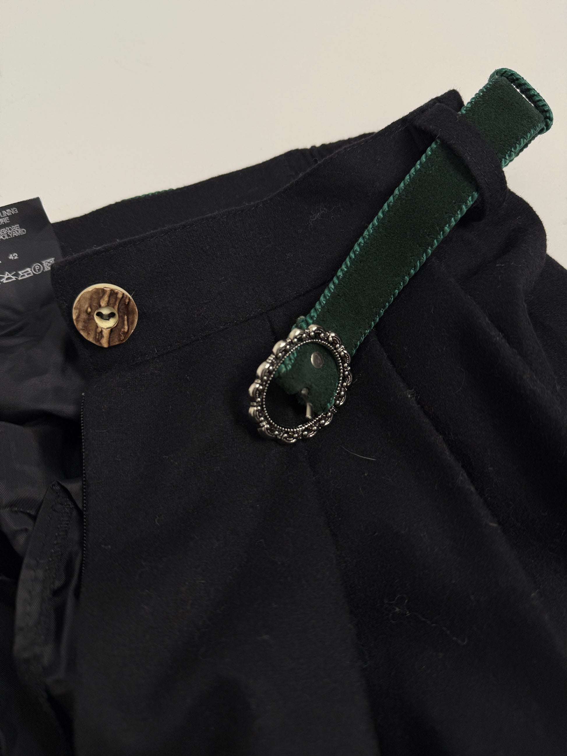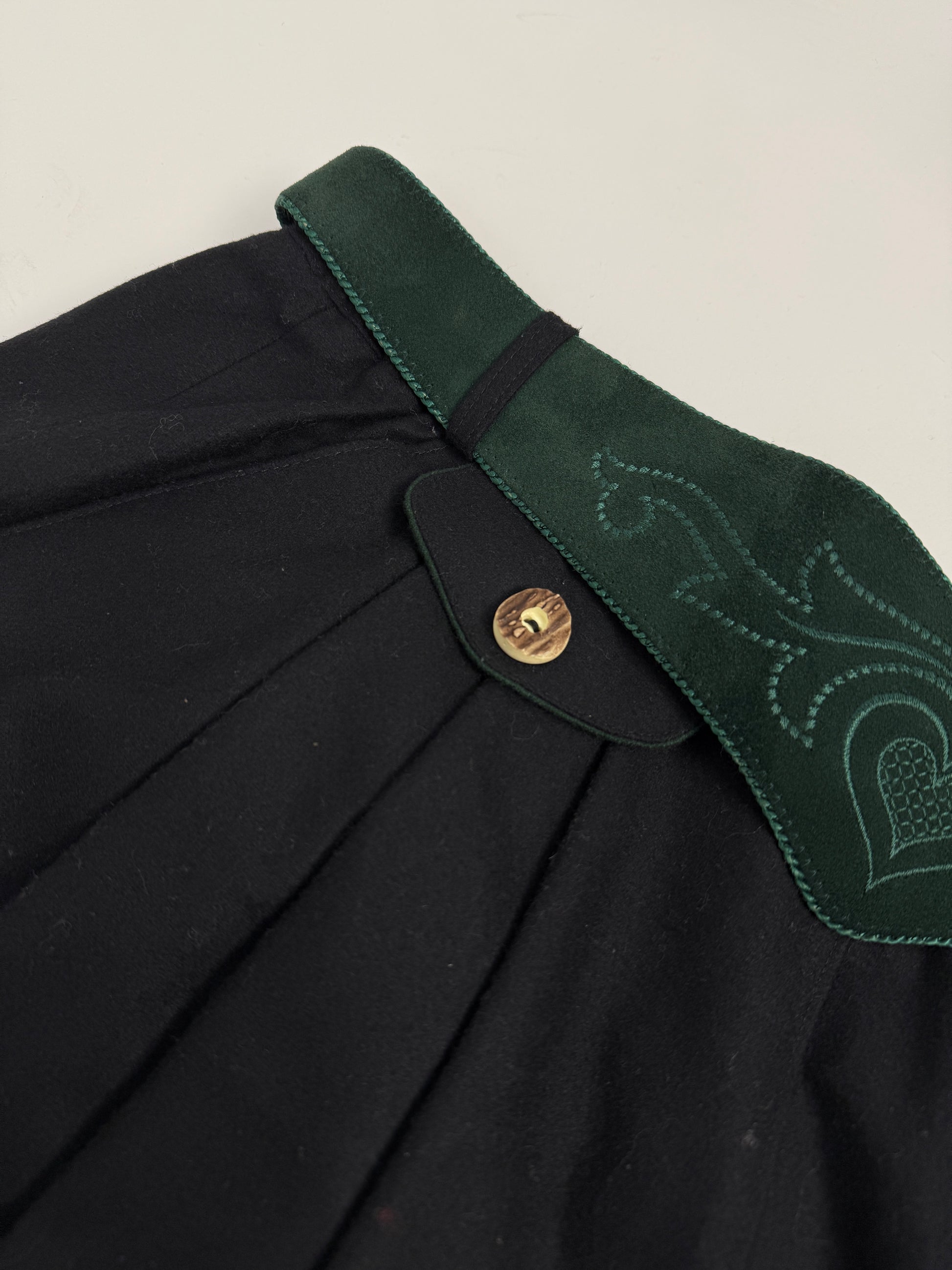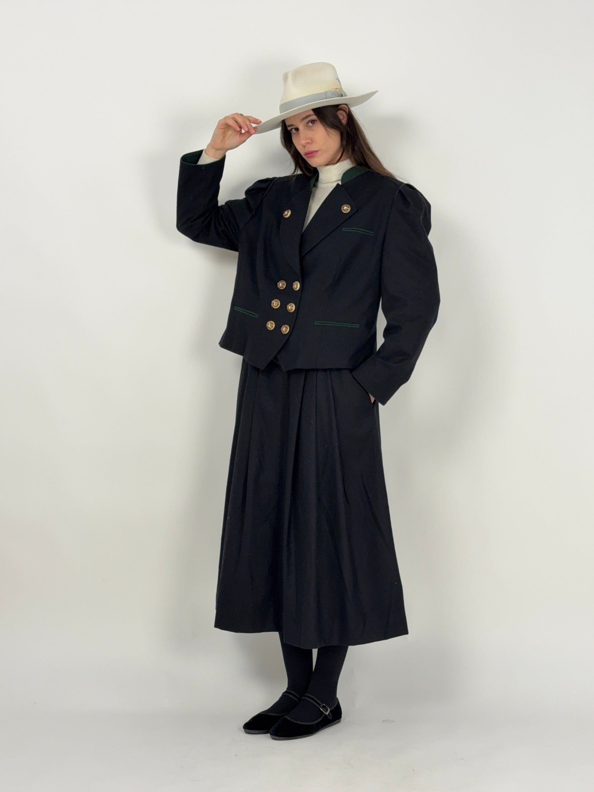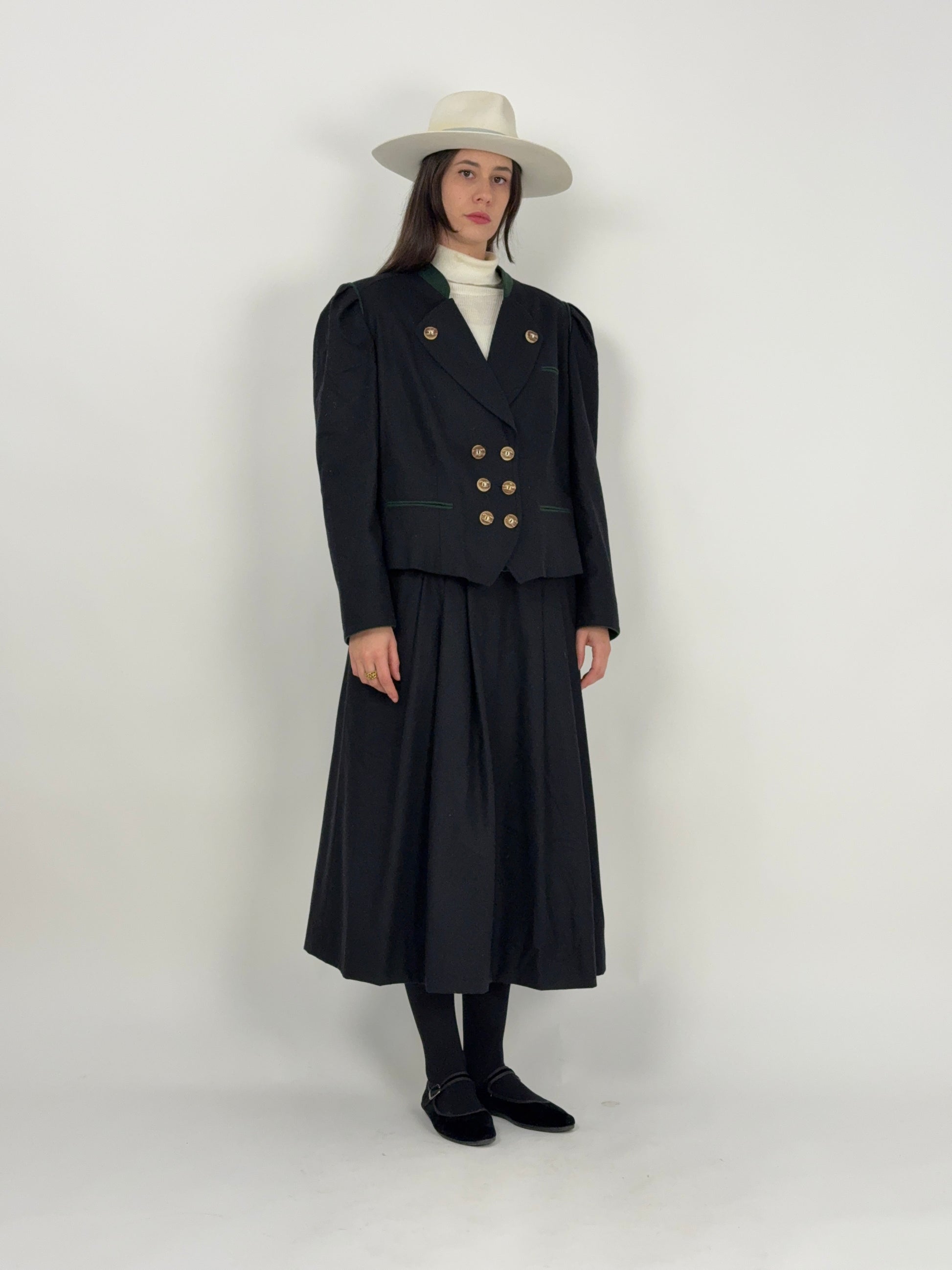 Un autentico completo tirolese, composto da giacca doppiopetto strutturata e gonna lunga plissettata coordinata, realizzato secondo la tradizione sartoriale mitteleuropea.