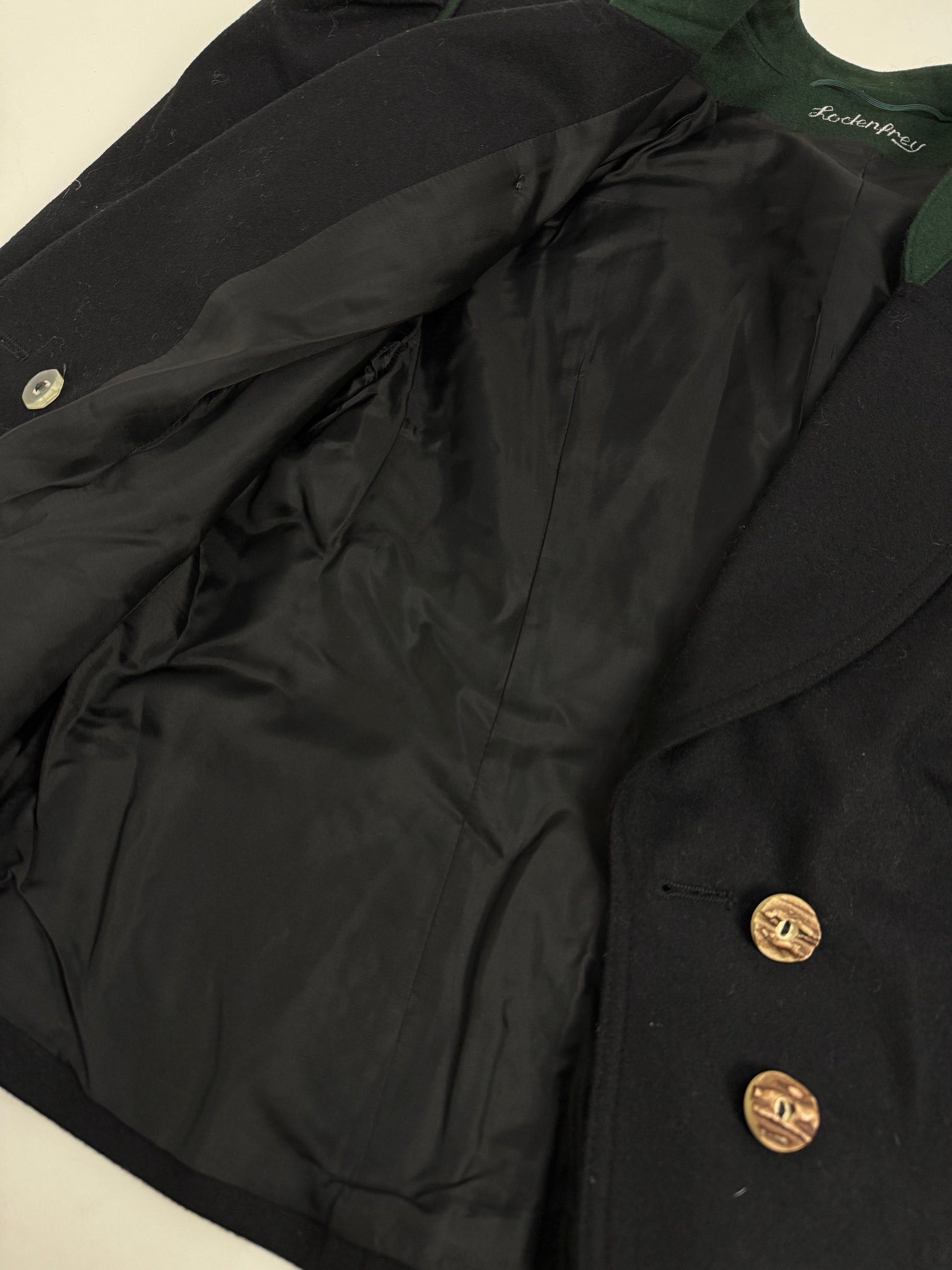 La giacca presenta una costruzione solida e impeccabile, con spalle leggermente strutturate, bottoni decorativi originali e inserti in panno verde scuro su colletto e finiture, firma estetica tipica di Lodenfrey.