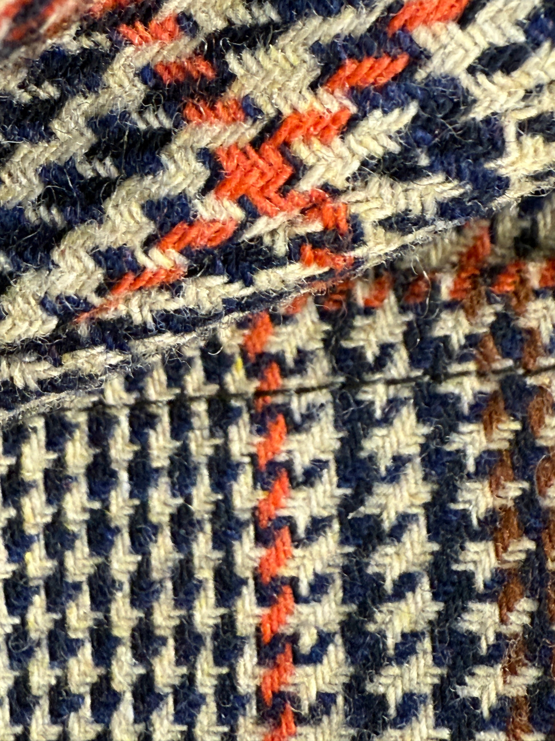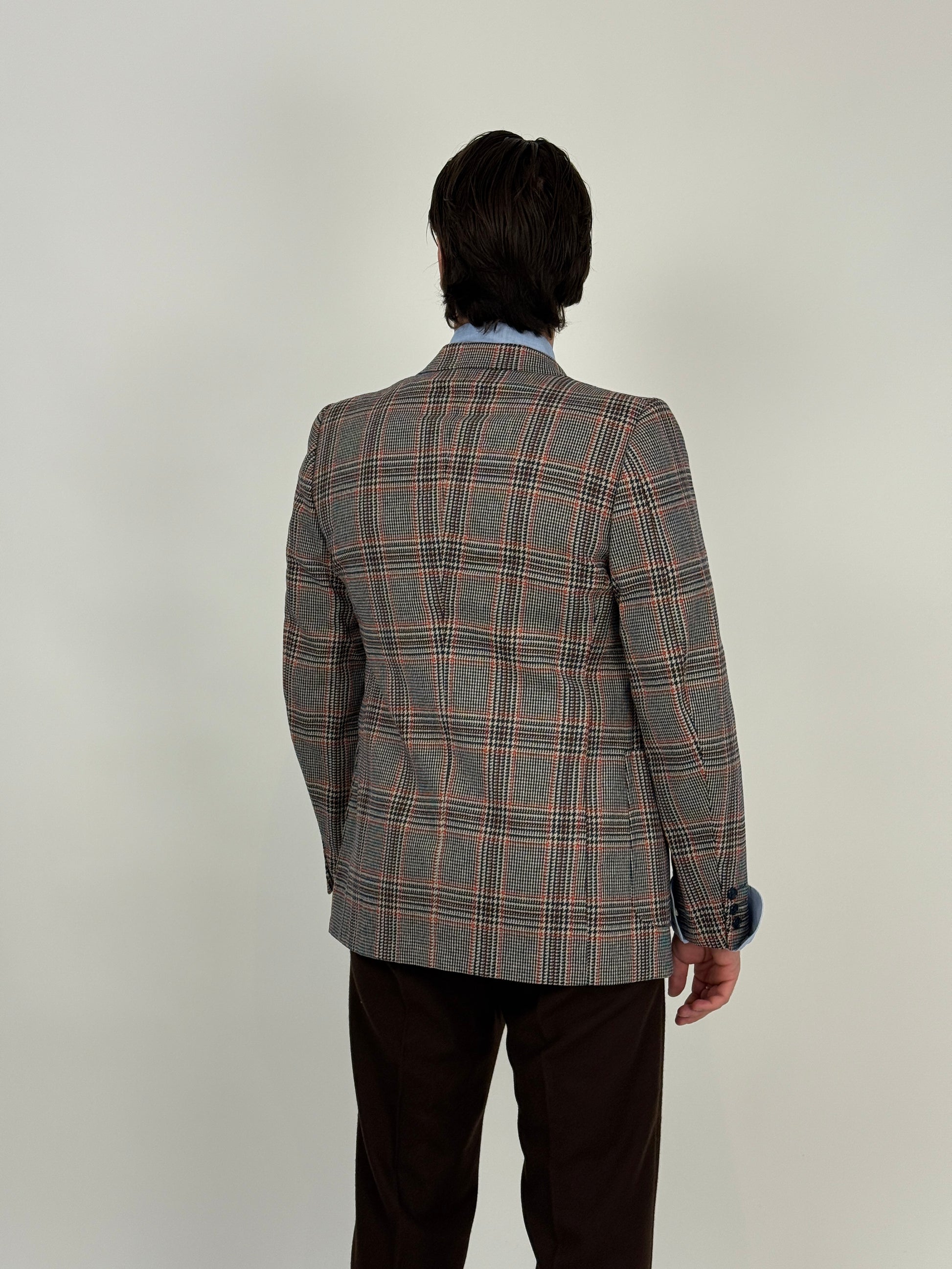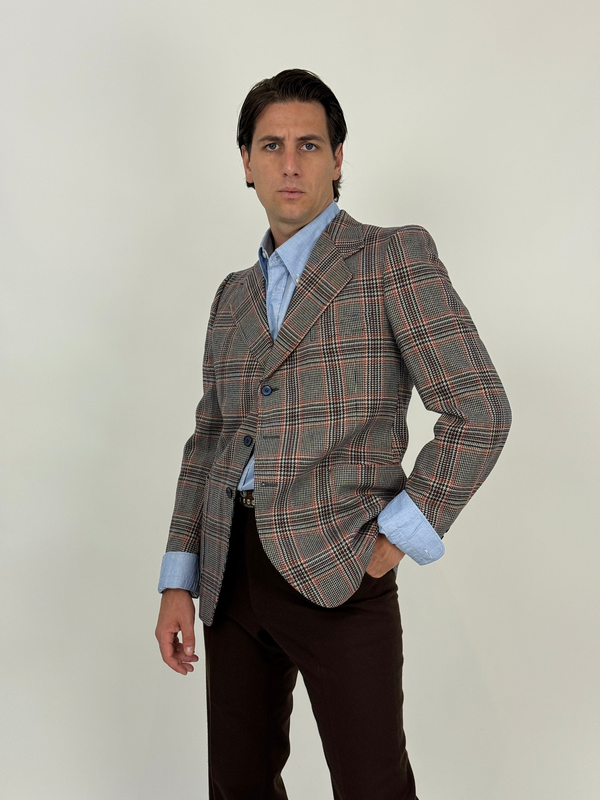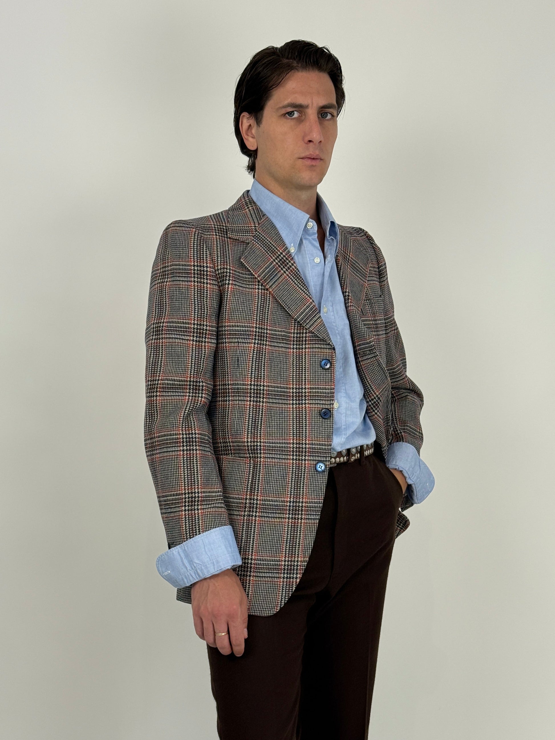 Il tessuto a Principe di Galles (micro pied-de-poule con finestratura rosso ruggine e blu navy) valorizza qualsiasi outfit, dal denim ai pantaloni sartoriali. Taglio single-breasted a 3 bottoni, revers classici, tasche a pattina e fodera interna liscia per maggiore comfort. Spalla leggermente strutturata e costruzione pulita tipica delle giacche anni ’70