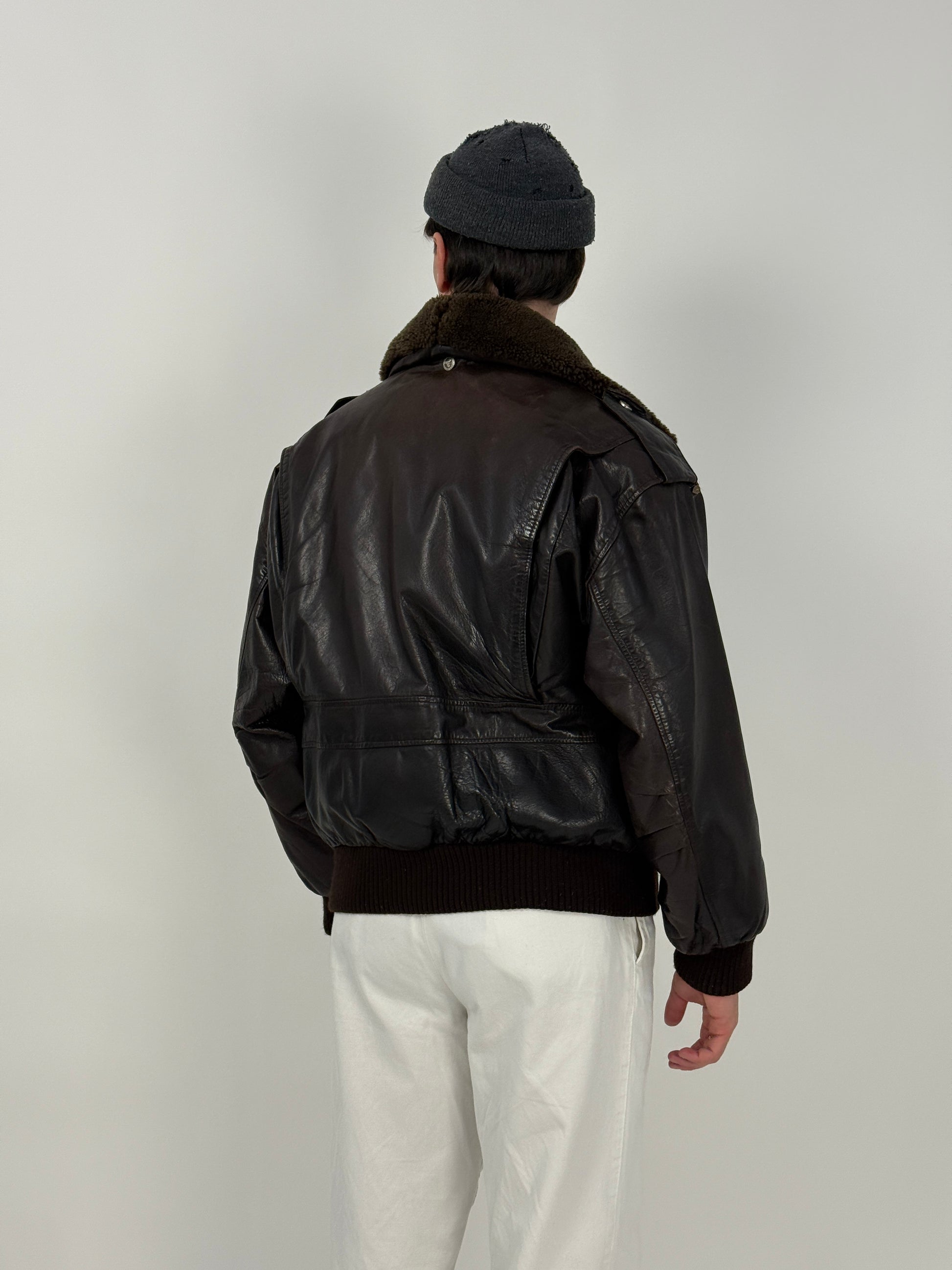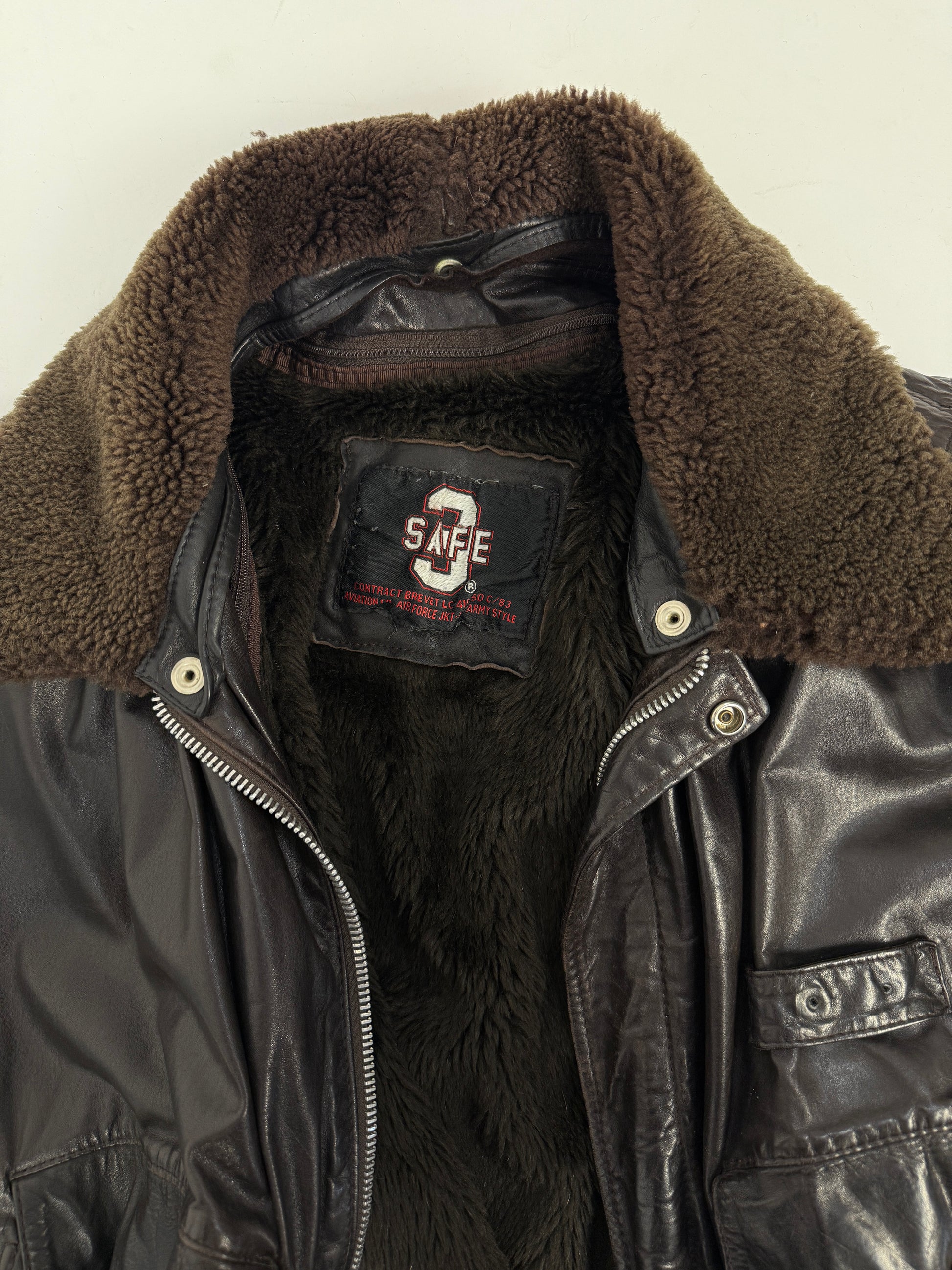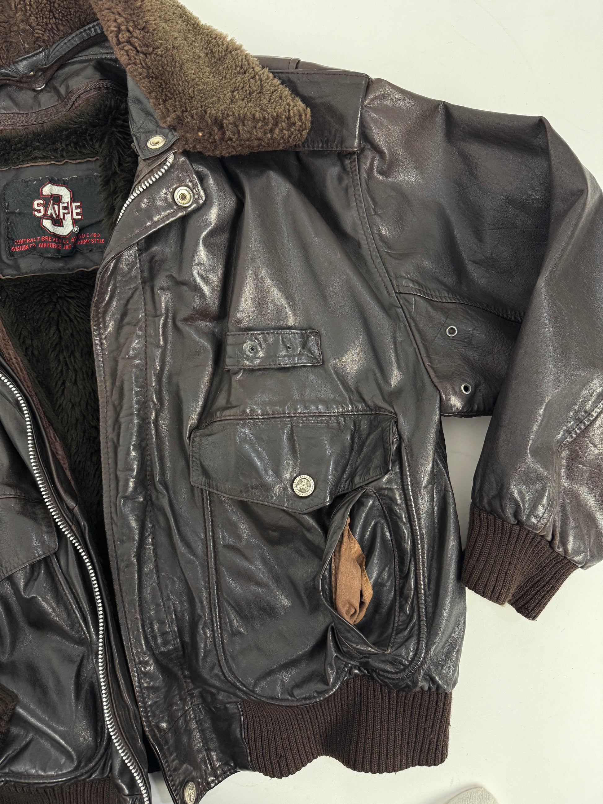 Giacca aviatore vintage in vera pelle marrone, modello B-3 U.S. Air Force, prodotta da SAFE con etichetta originale e interno foderato in pelliccia sintetica rimovibile