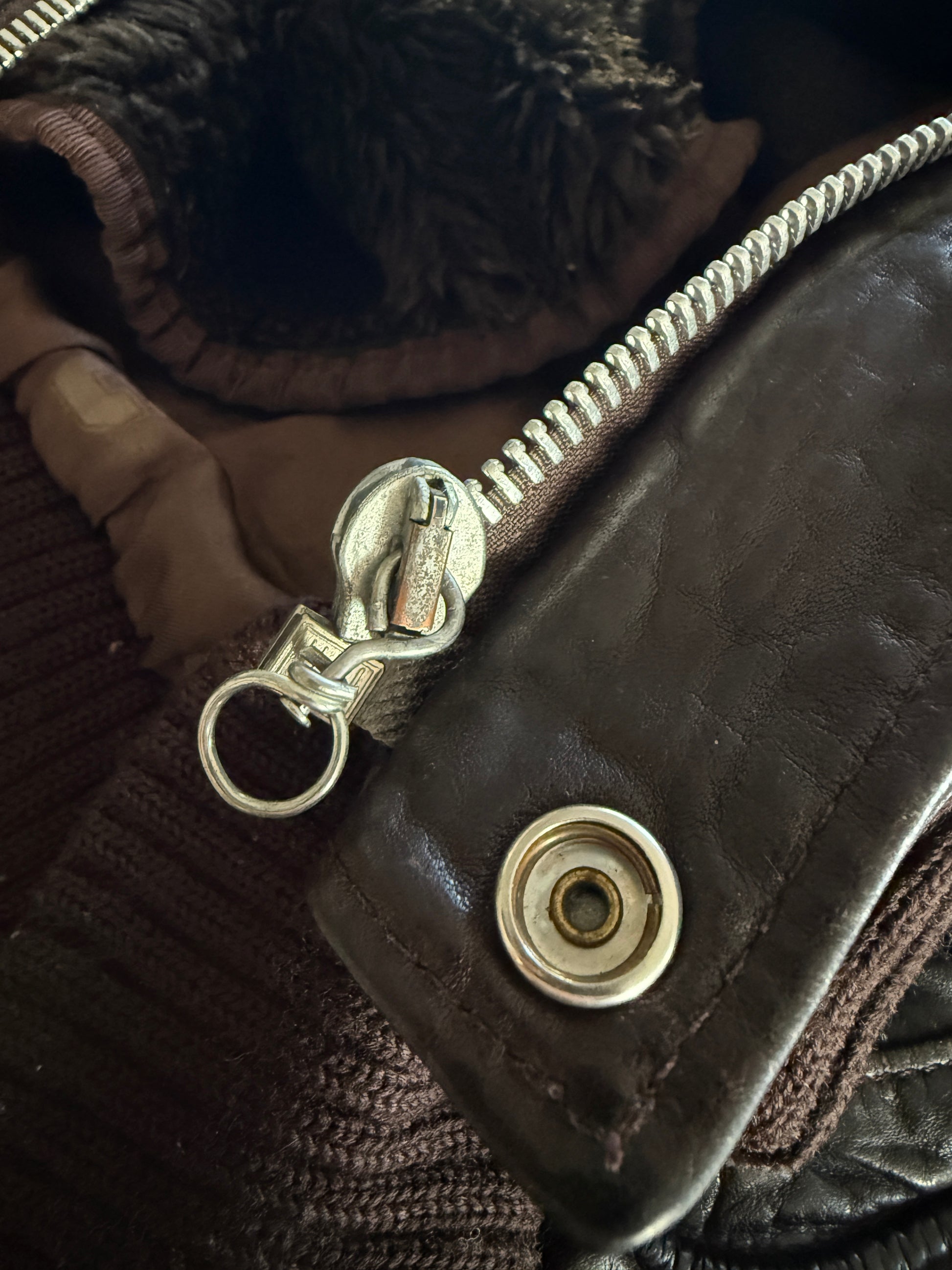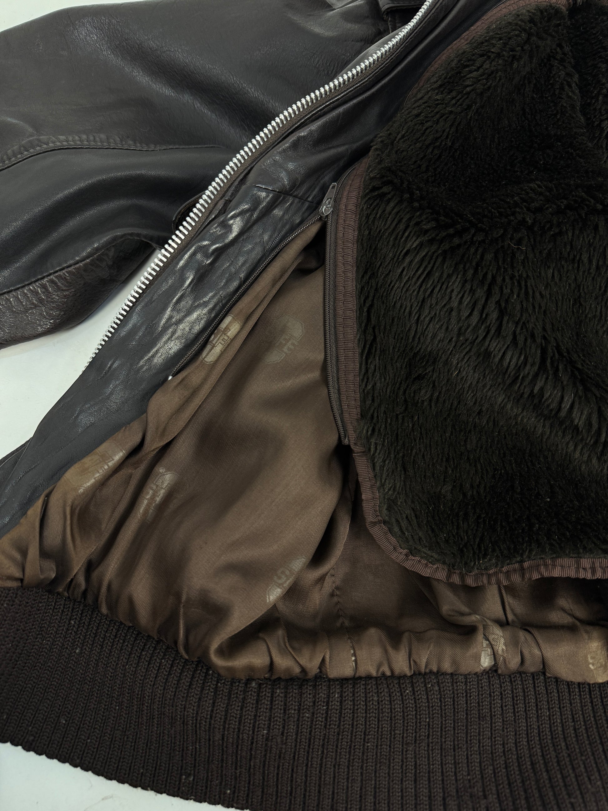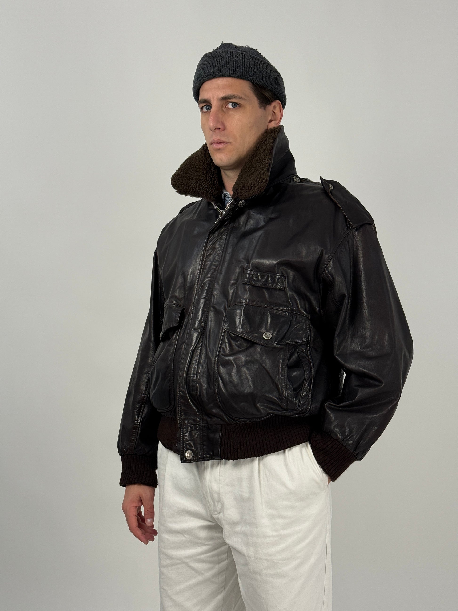 Giacca aviatore vintage in vera pelle marrone, modello B-3 U.S. Air Force, prodotta da SAFE con etichetta originale e interno foderato in pelliccia sintetica rimovibile