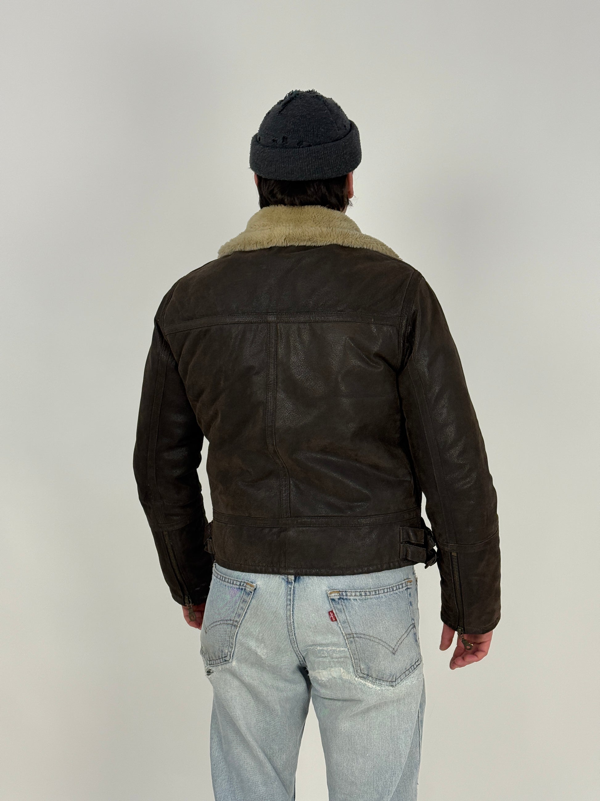 La costruzione è solida, pensata per durare nel tempo: zip robusta, tasche funzionali, collo in shearling che protegge dal freddo e una pelle vissuta che racconta la sua storia senza bisogno di spiegazioni.