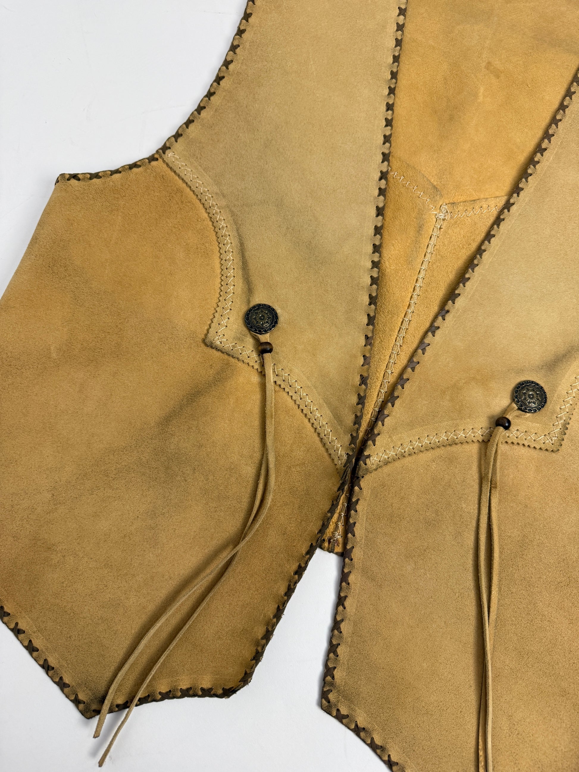 Questo gilet vintage in vera pelle scamosciata firmato Maverick è un pezzo iconico anni ’70 che profuma di libertà, musica e strada polverosa.