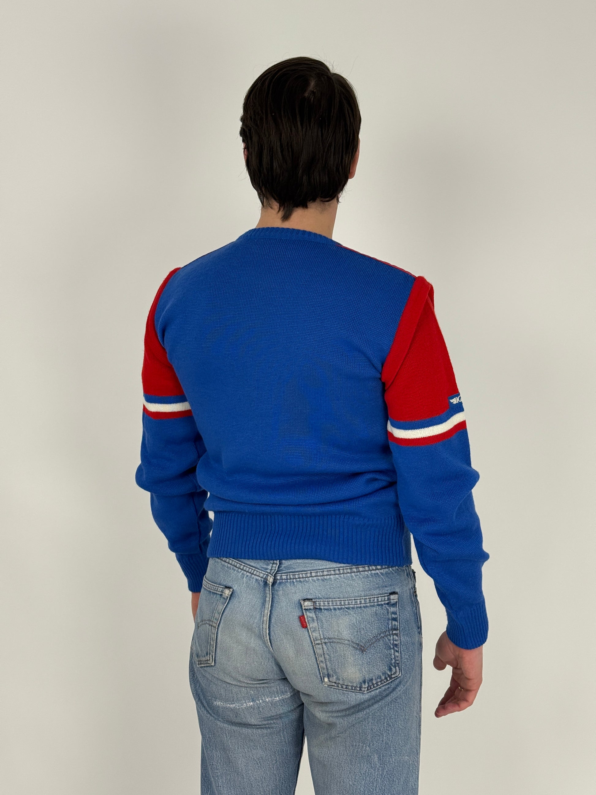 Colori pieni, spalle rinforzate rosse imbottite, banda tricolore sulla manica e la classica etichetta ricamata Icarus che racconta un’epoca in cui la maglieria sportiva era fatta per durare.