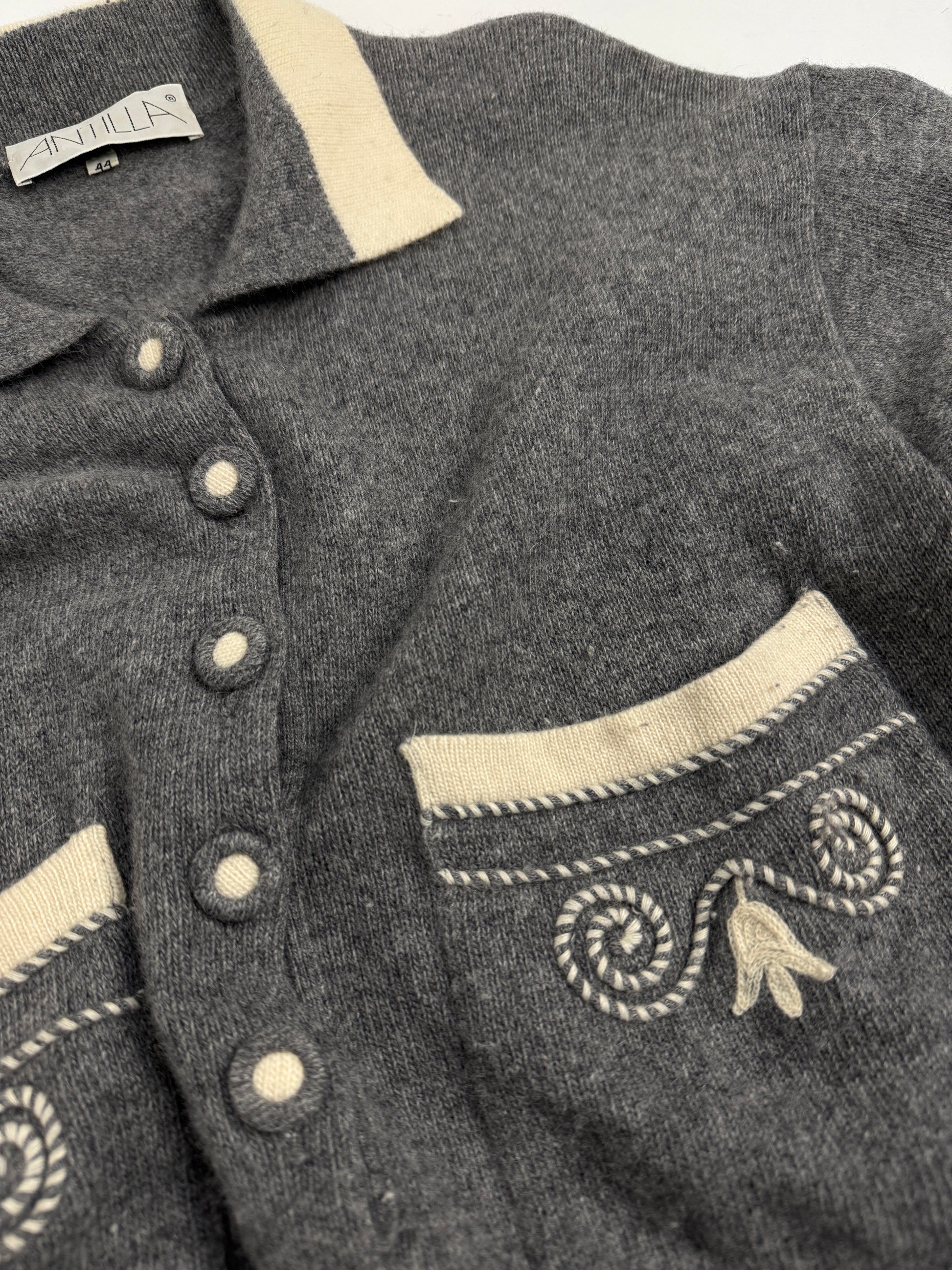 Lana grigia melange, bottoni rivestiti, rifiniture panna e ricami. È uno di quei capi che indossi per stare bene, grazie alla sua morbidezza e calore. Linea dritta, colletto a contrasto, tasche ricamate che parlano di artigianalità.