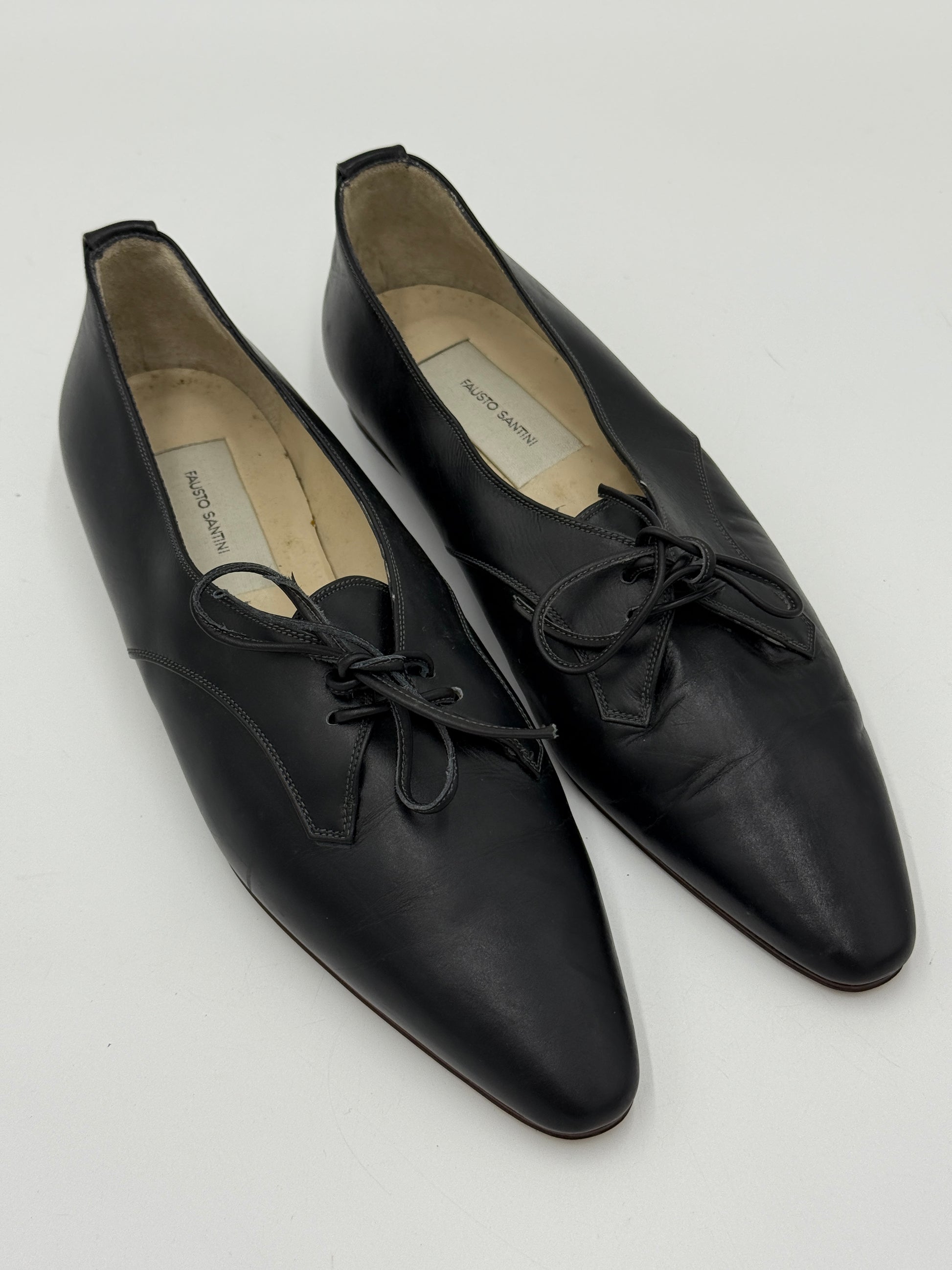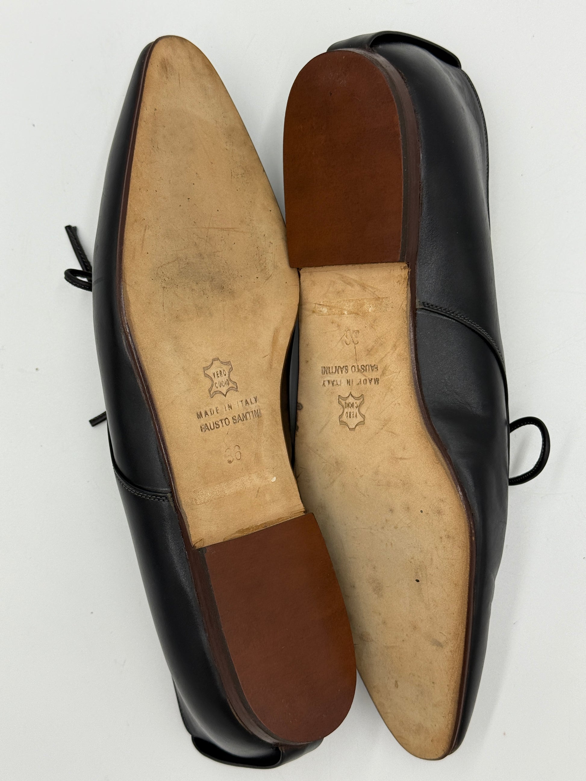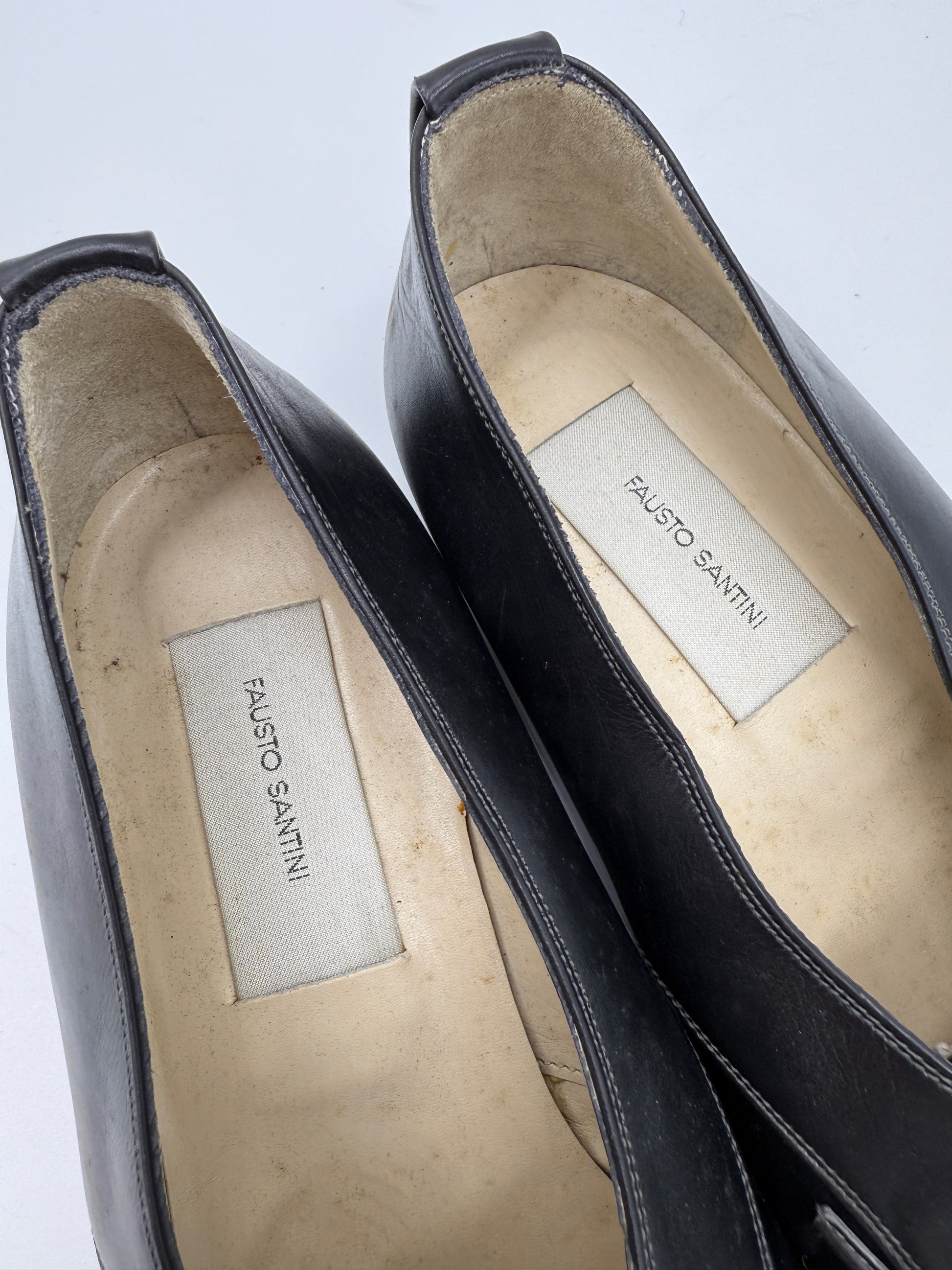Eleganza senza tempo e manifattura artigianale italiana: queste scarpe vintage Fausto Santini degli anni ’80 sono un pezzo raro per chi ama il design minimal e raffinato. Realizzate in morbida pelle nera di altissima qualità, presentano una punta affusolata e allungata che esalta la silhouette del piede con uno stile deciso e sofisticato.