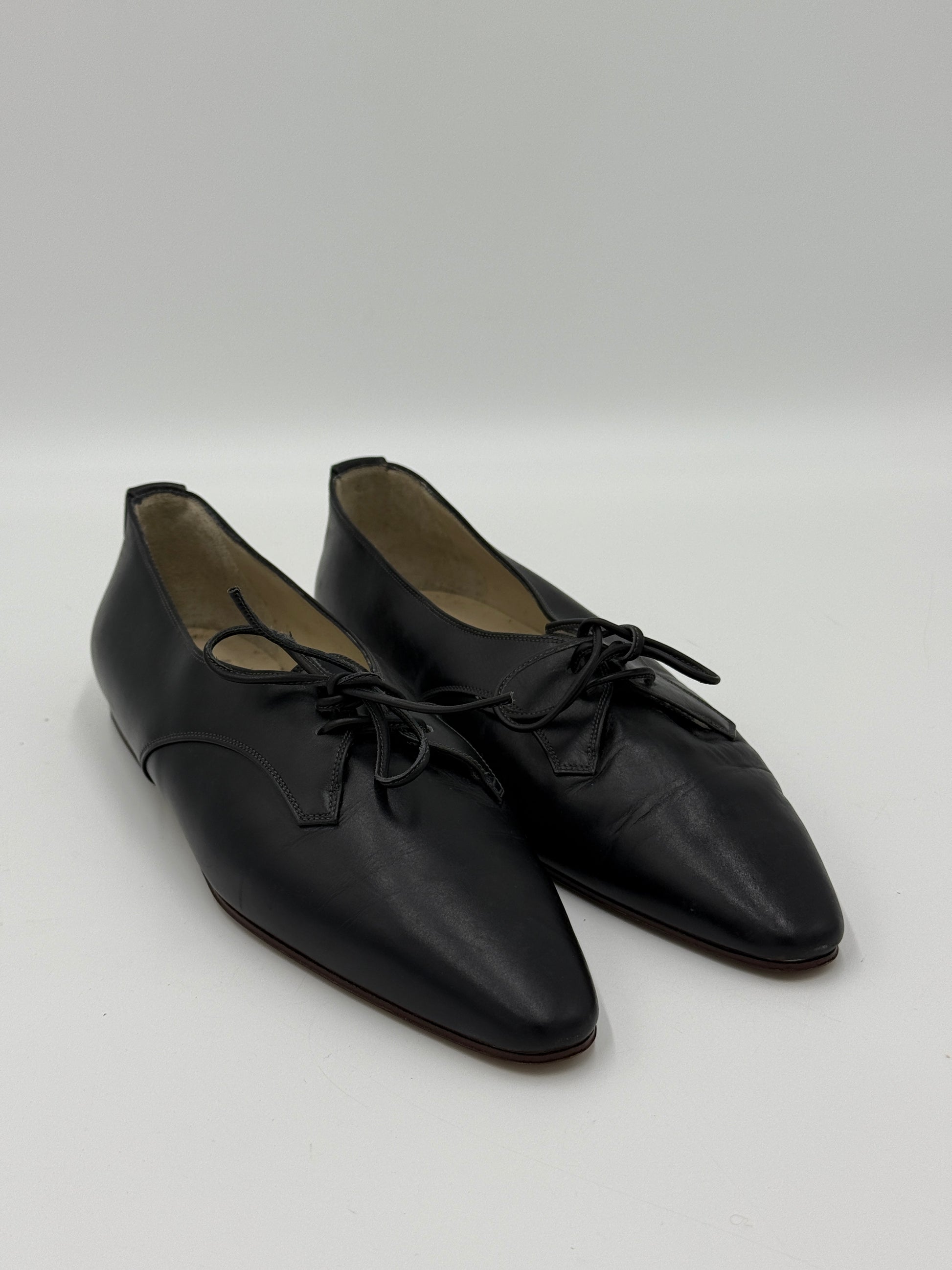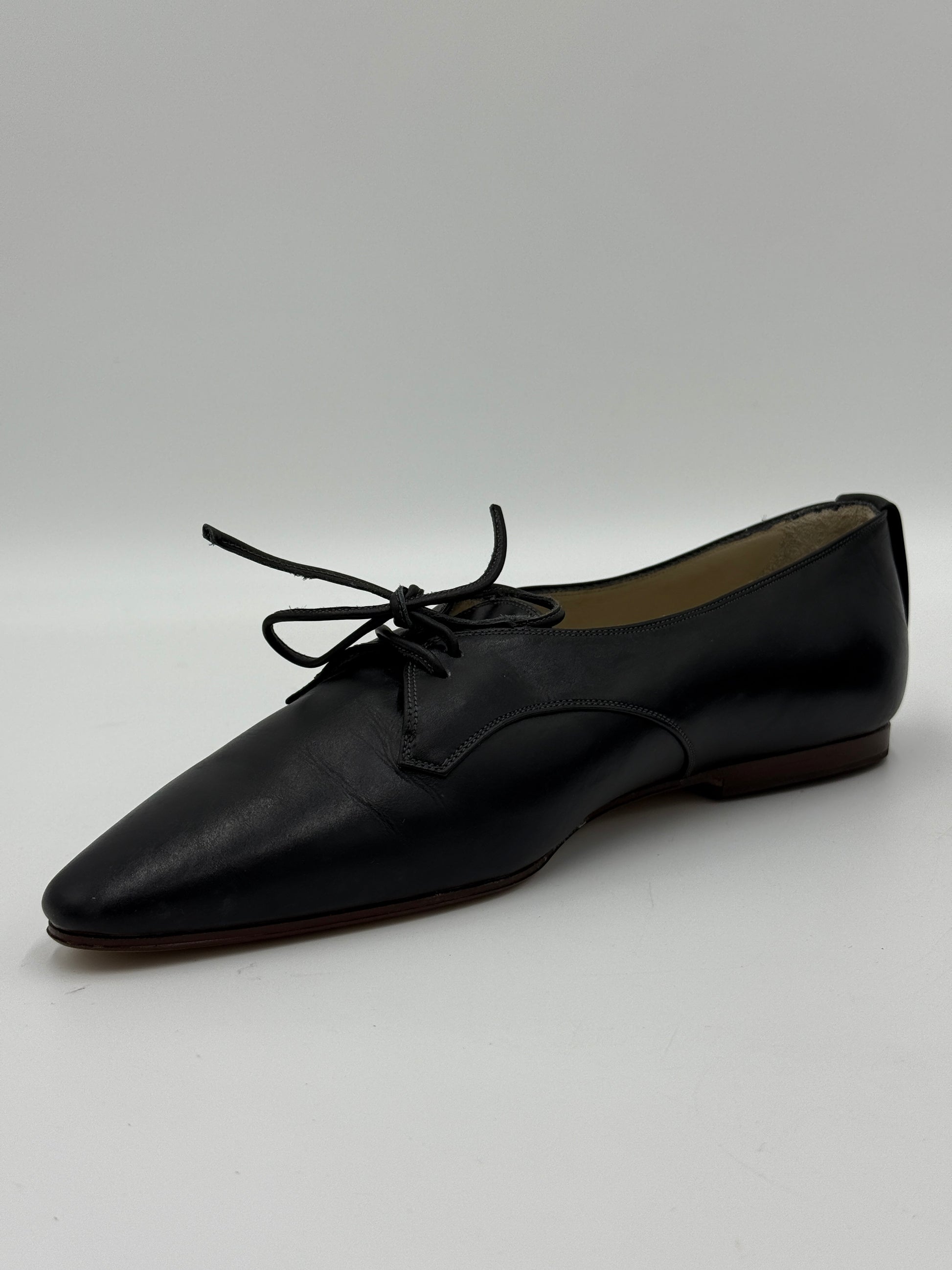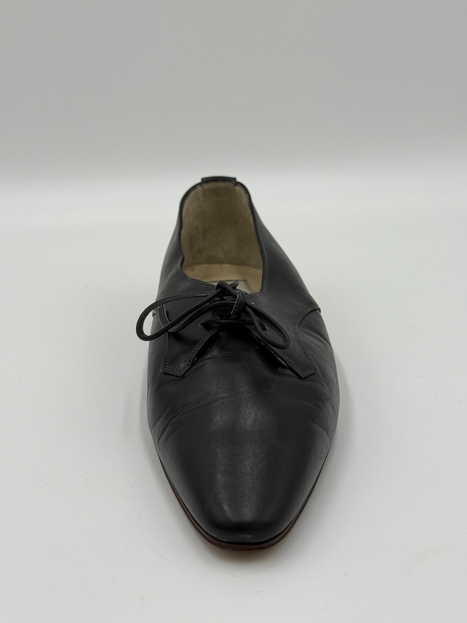 Eleganza senza tempo e manifattura artigianale italiana: queste scarpe vintage Fausto Santini degli anni ’80 sono un pezzo raro per chi ama il design minimal e raffinato. Realizzate in morbida pelle nera di altissima qualità, presentano una punta affusolata e allungata che esalta la silhouette del piede con uno stile deciso e sofisticato.