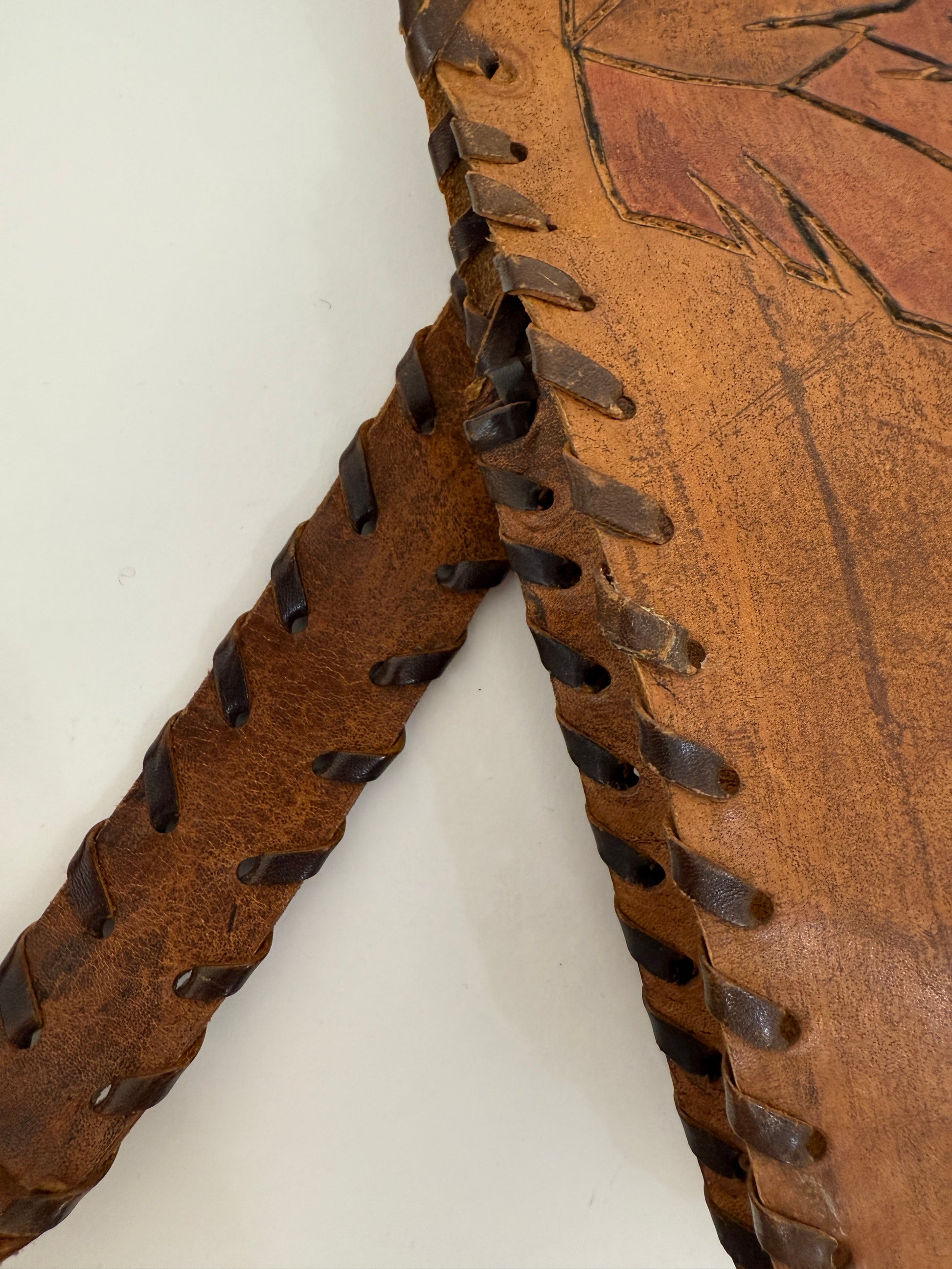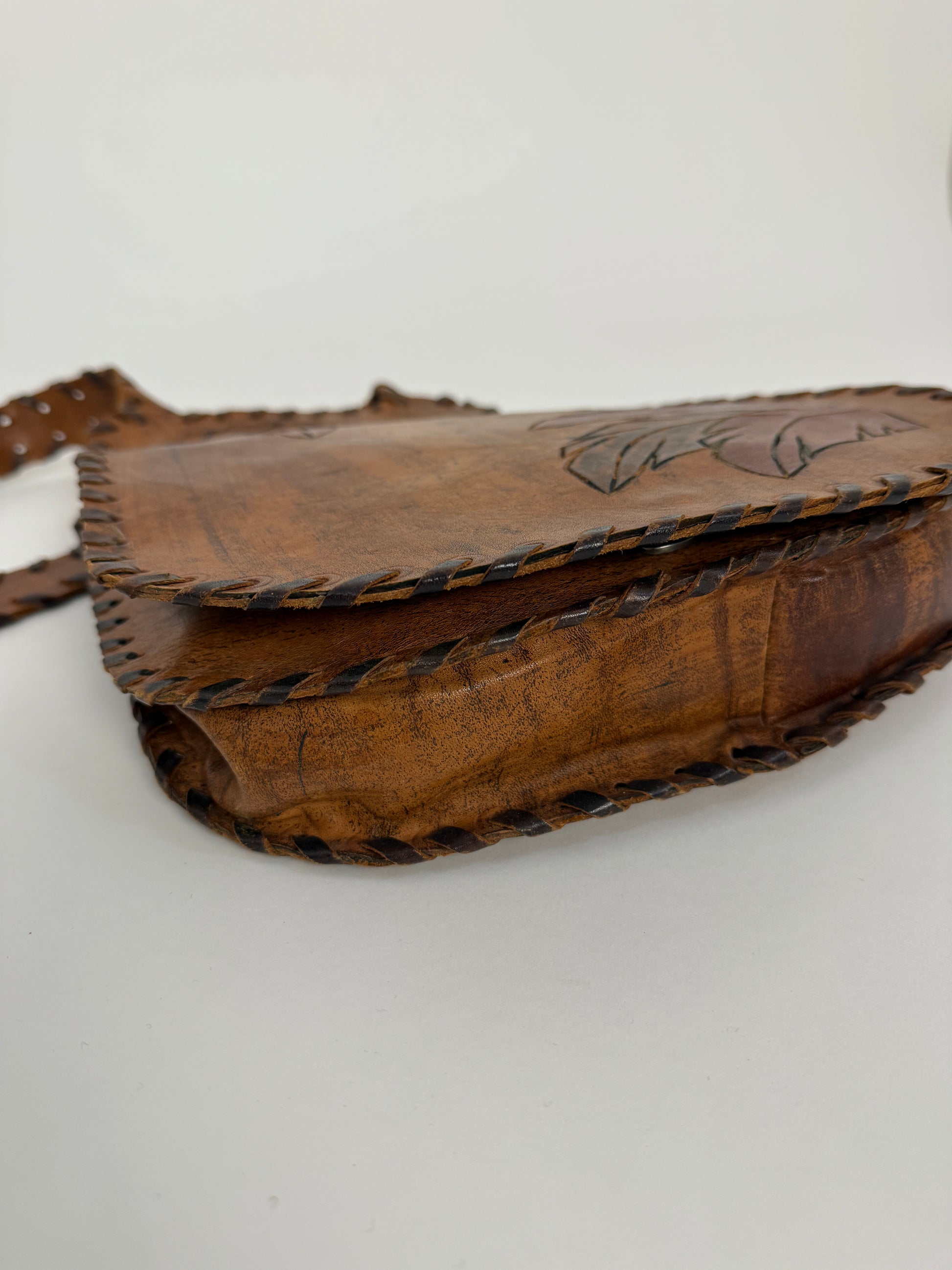 Borsa artigianale in cuoio vintage anni ’70: lavorazione completamente fatta a mano, cuciture a intreccio e pannello frontale inciso con foglie stilizzate, tipico delle produzioni artigiane dell’Italia rurale e delle botteghe di montagna dell’epoca.