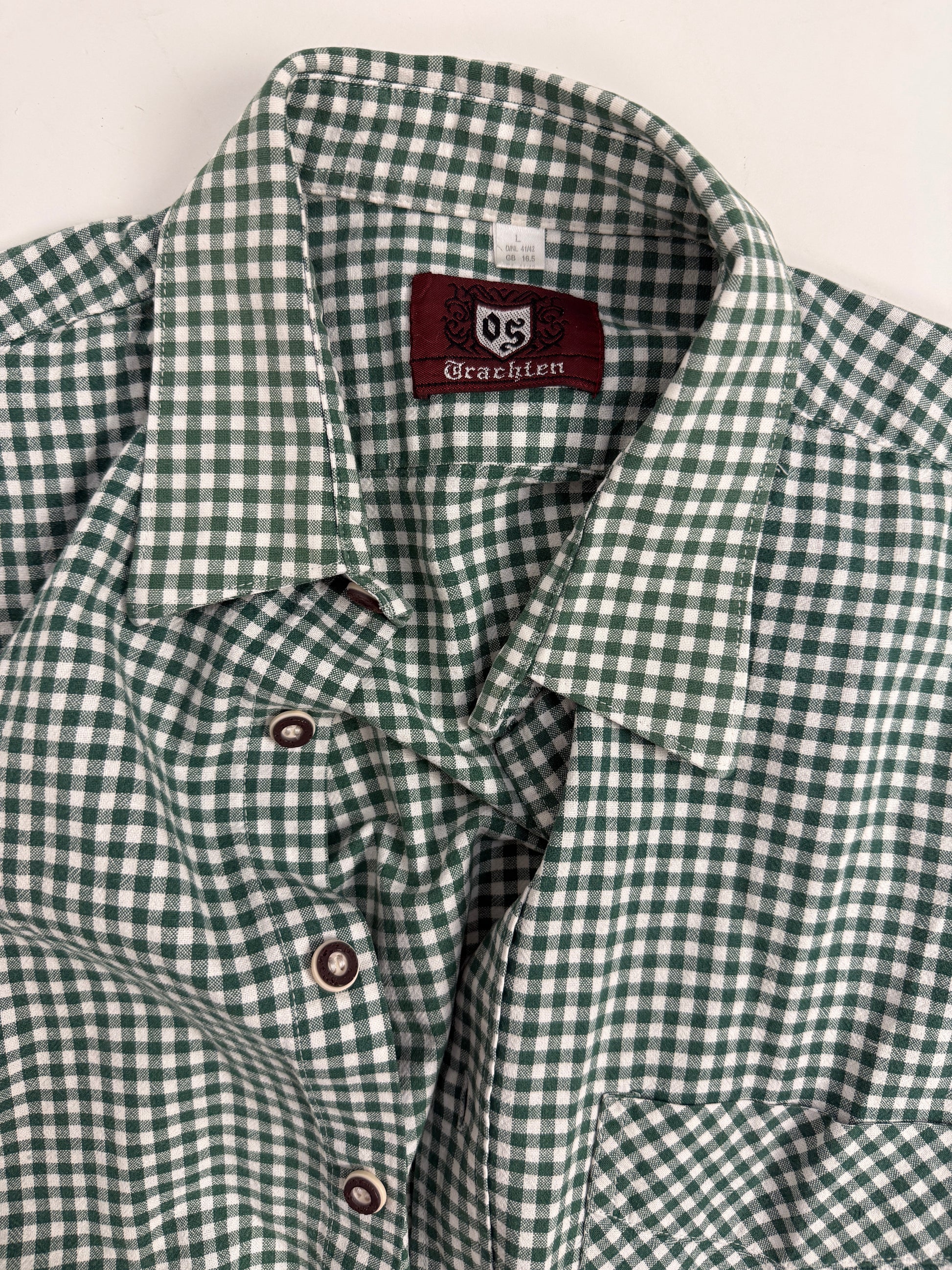 Camicia vintage a quadri verdi e bianchi firmata Trachten, icona dello stile bavarese tradizionale reinterpretato in chiave casual. Realizzata in puro cotone leggero e resistente, presenta bottoni decorativi effetto corno e una vestibilità ampia che la rende ideale sia per uomo che per donna.