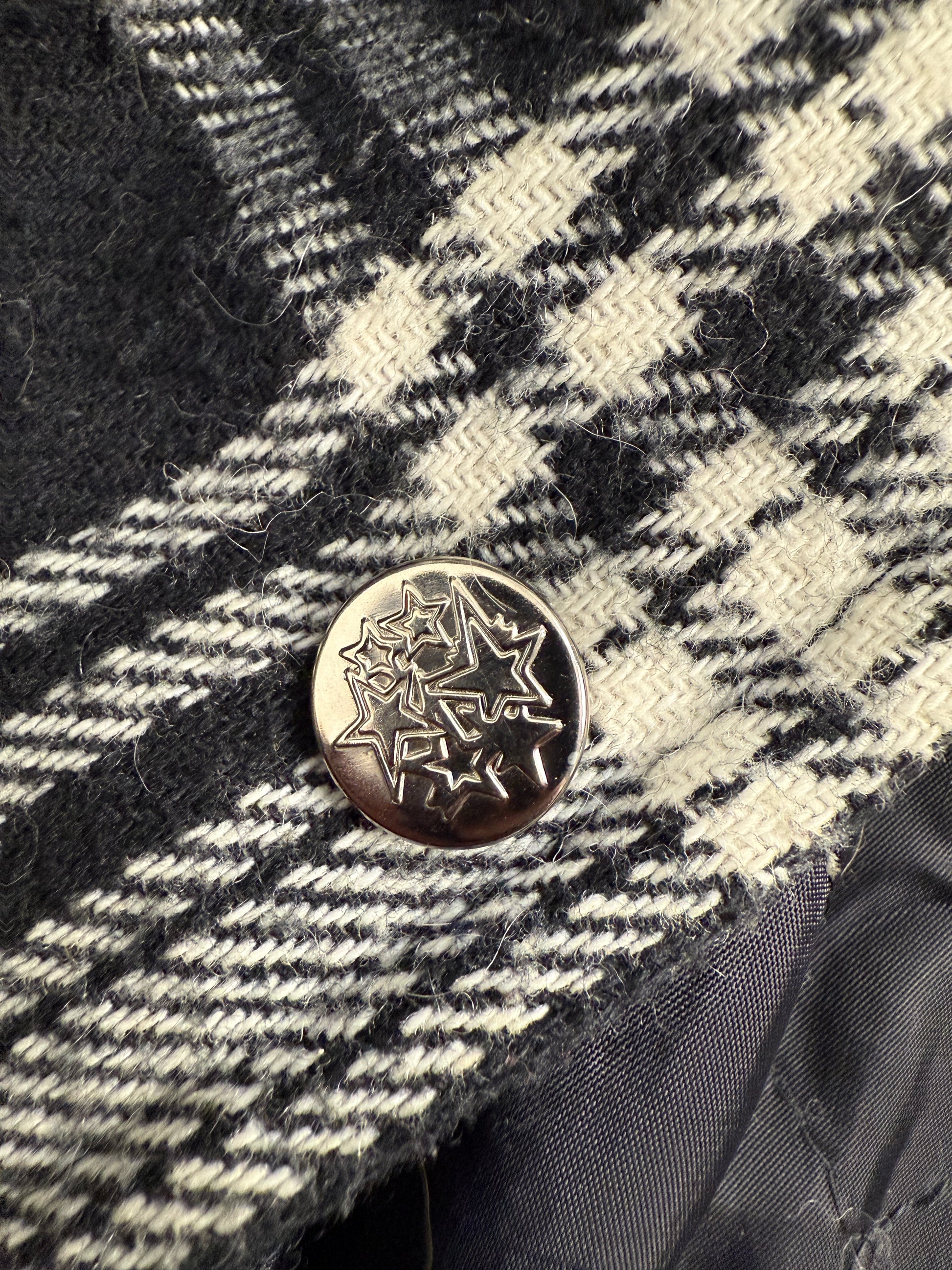 Questa giacca overshirt Blue Montgomery è realizzata in lana spessa e calda con iconico motivo a quadri bianco e nero, fodera trapuntata interna e bottoni metallici incisi con stelle