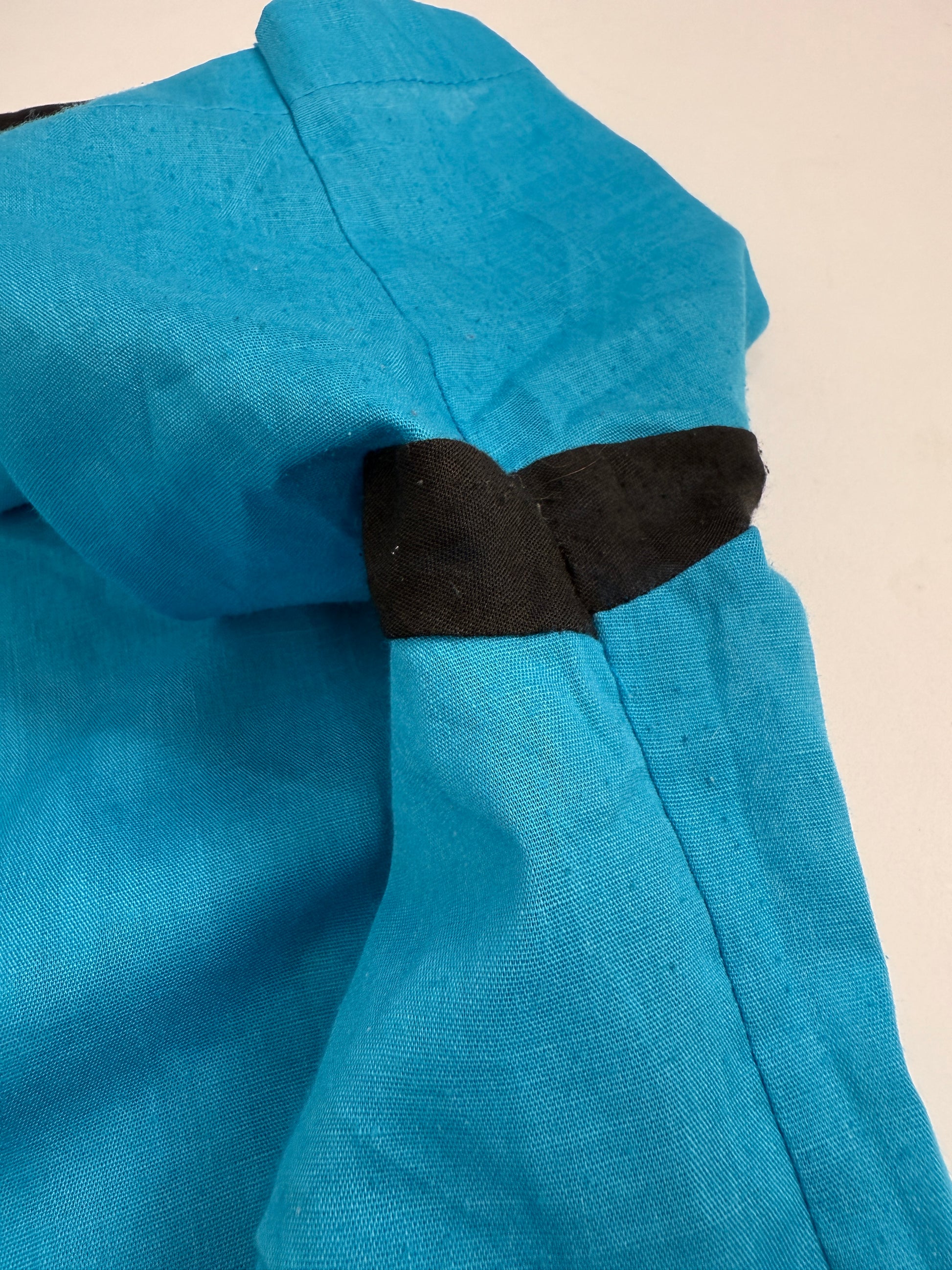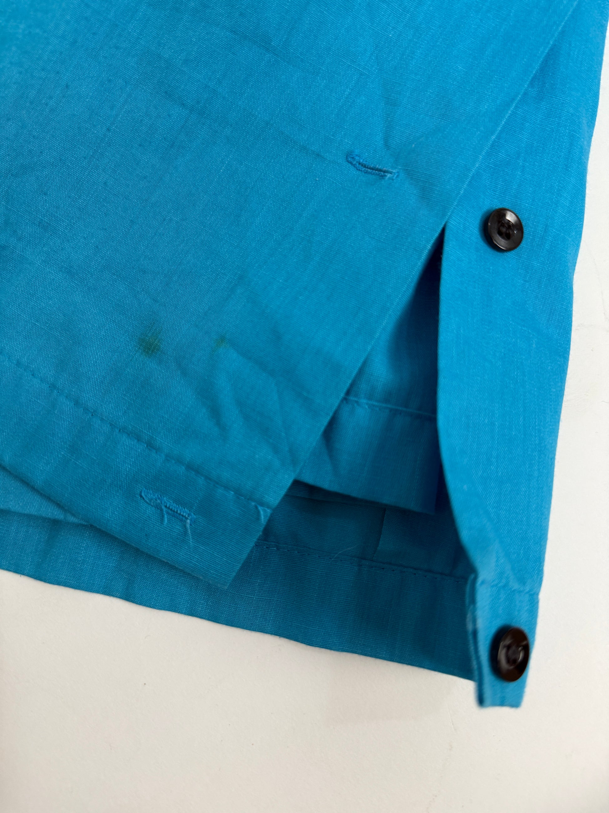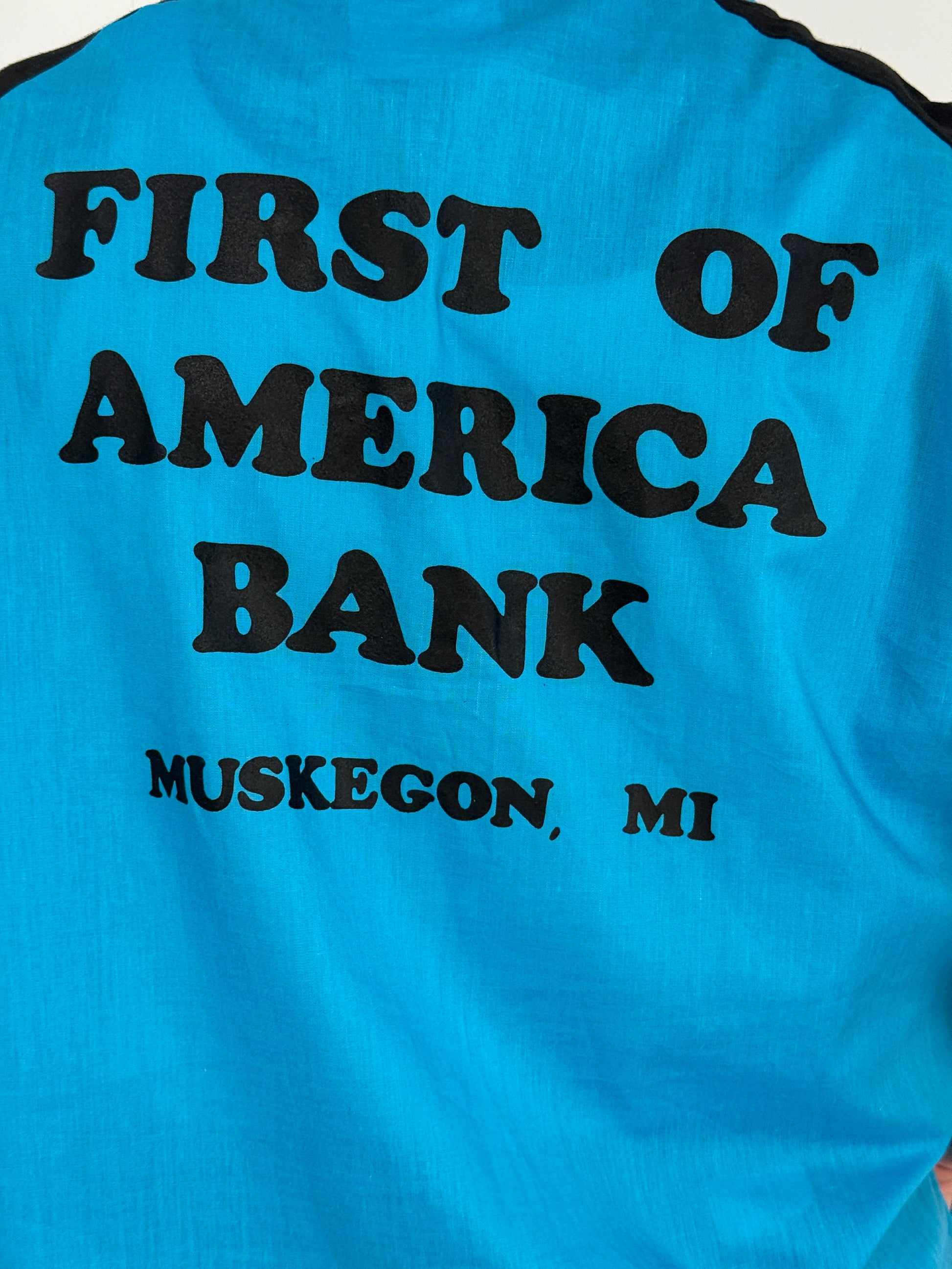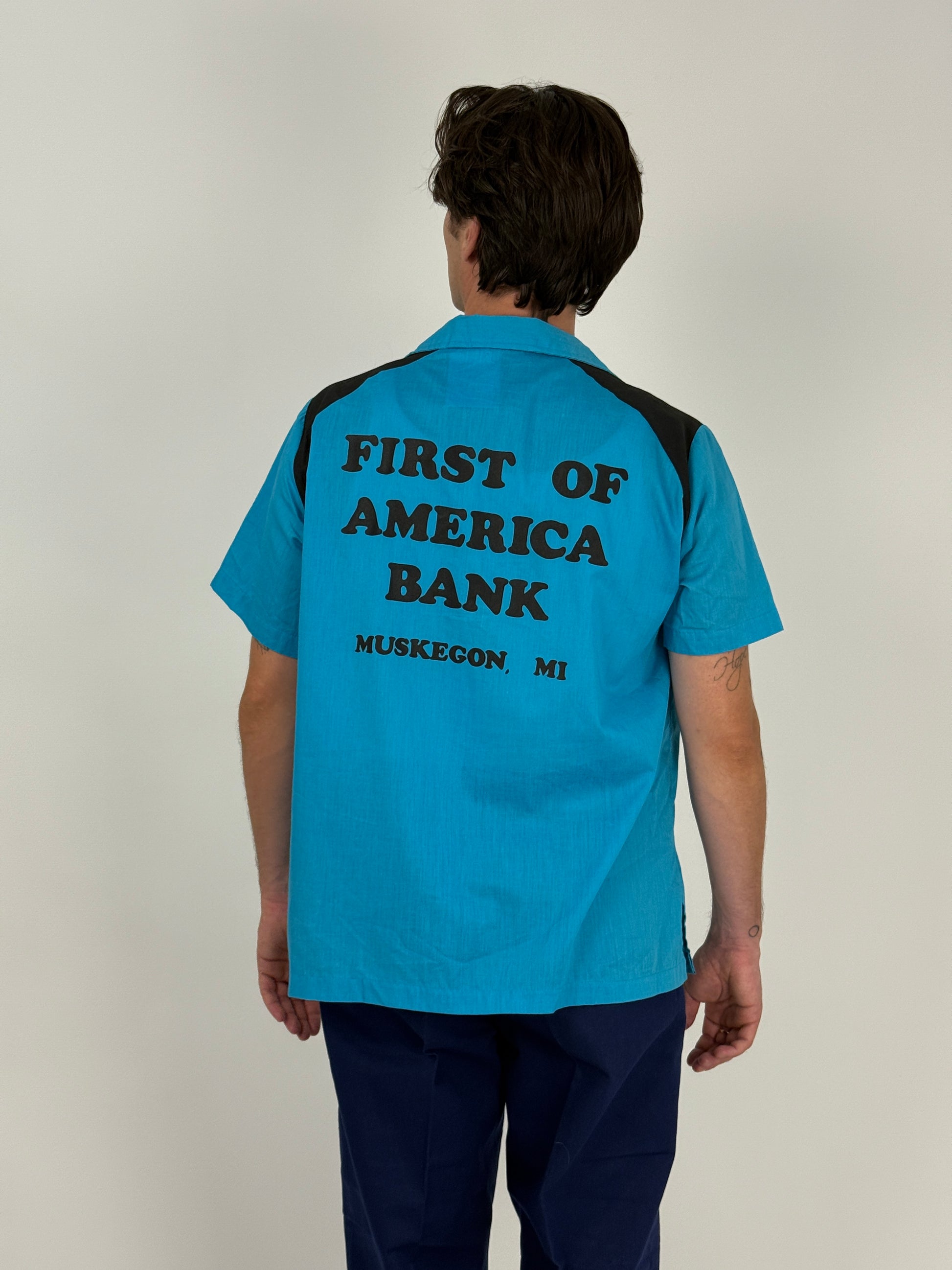 Base turchese brillante con inserti neri sulle spalle (color–block), collo cubano/camp collar, maniche corte e linea boxy. Sul davanti taschino con personalizzazione “OZZIE”; sul retro maxi stampa “FIRST OF AMERICA BANK – MUSKEGON, MI” con patina perfetta da vero vintage. Chiusura a bottoni neri e orlo dritto