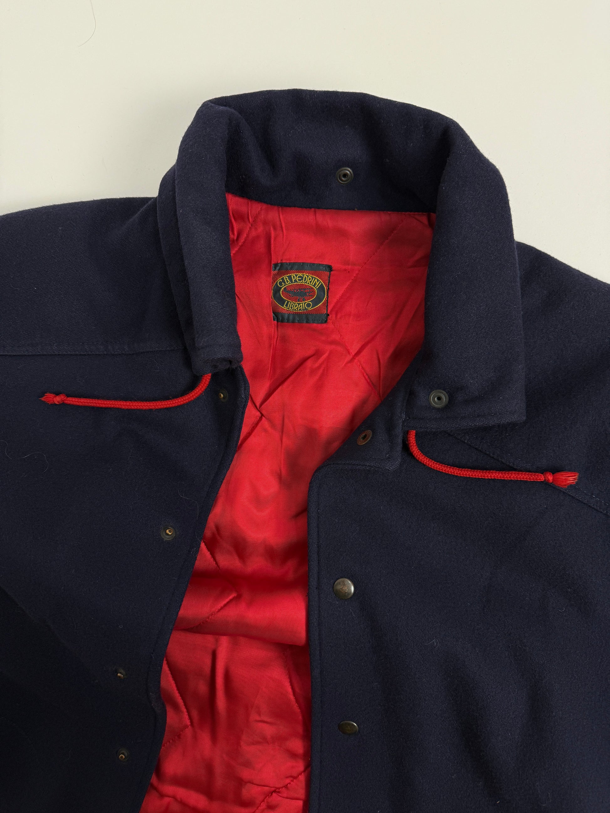Giacca vintage anni ’80 in lana blu navy, con fodera trapuntata rosso vivo, un dettaglio che fa subito “heritage workwear” e che solo i capi autentici sanno offrire.