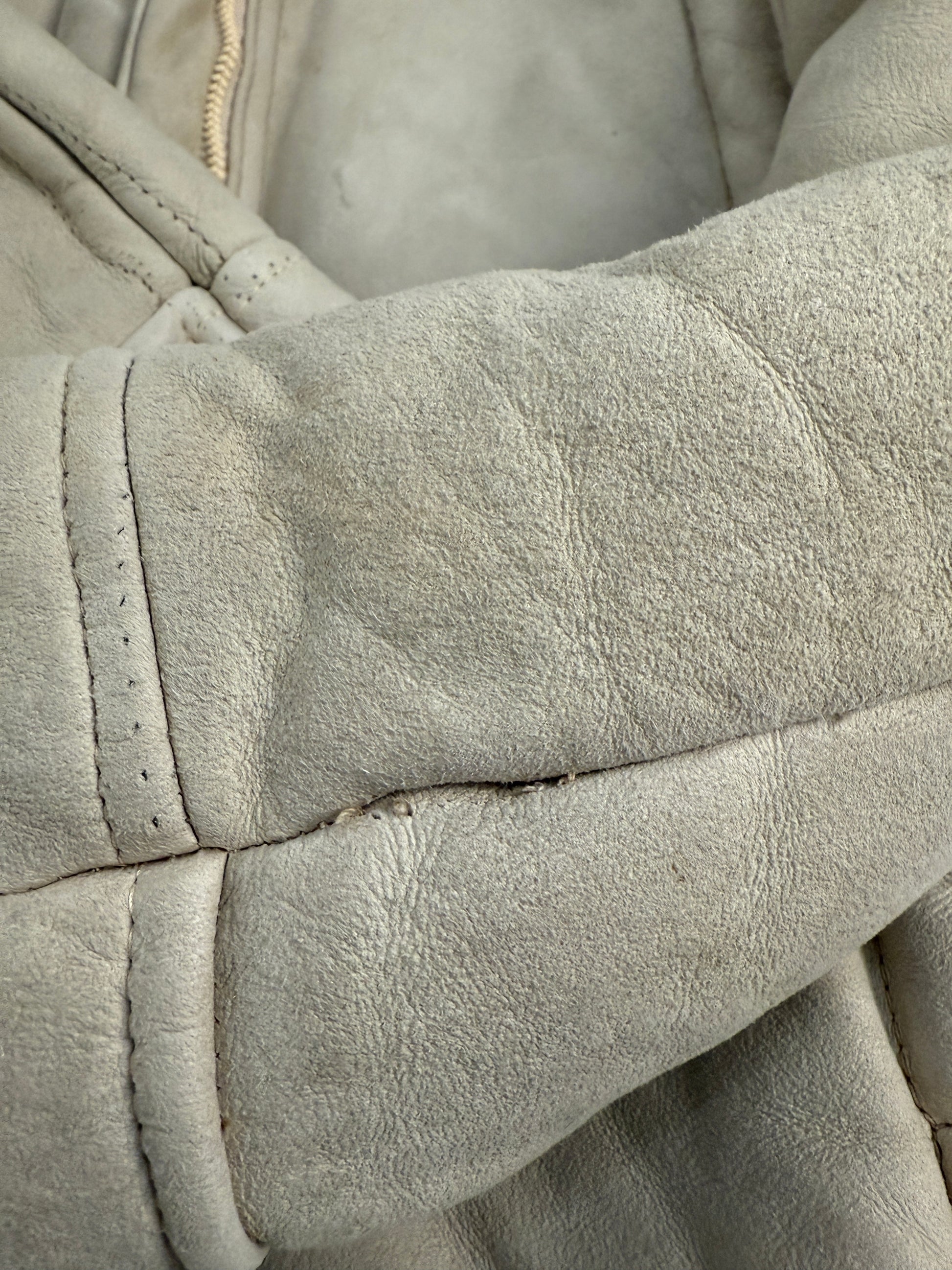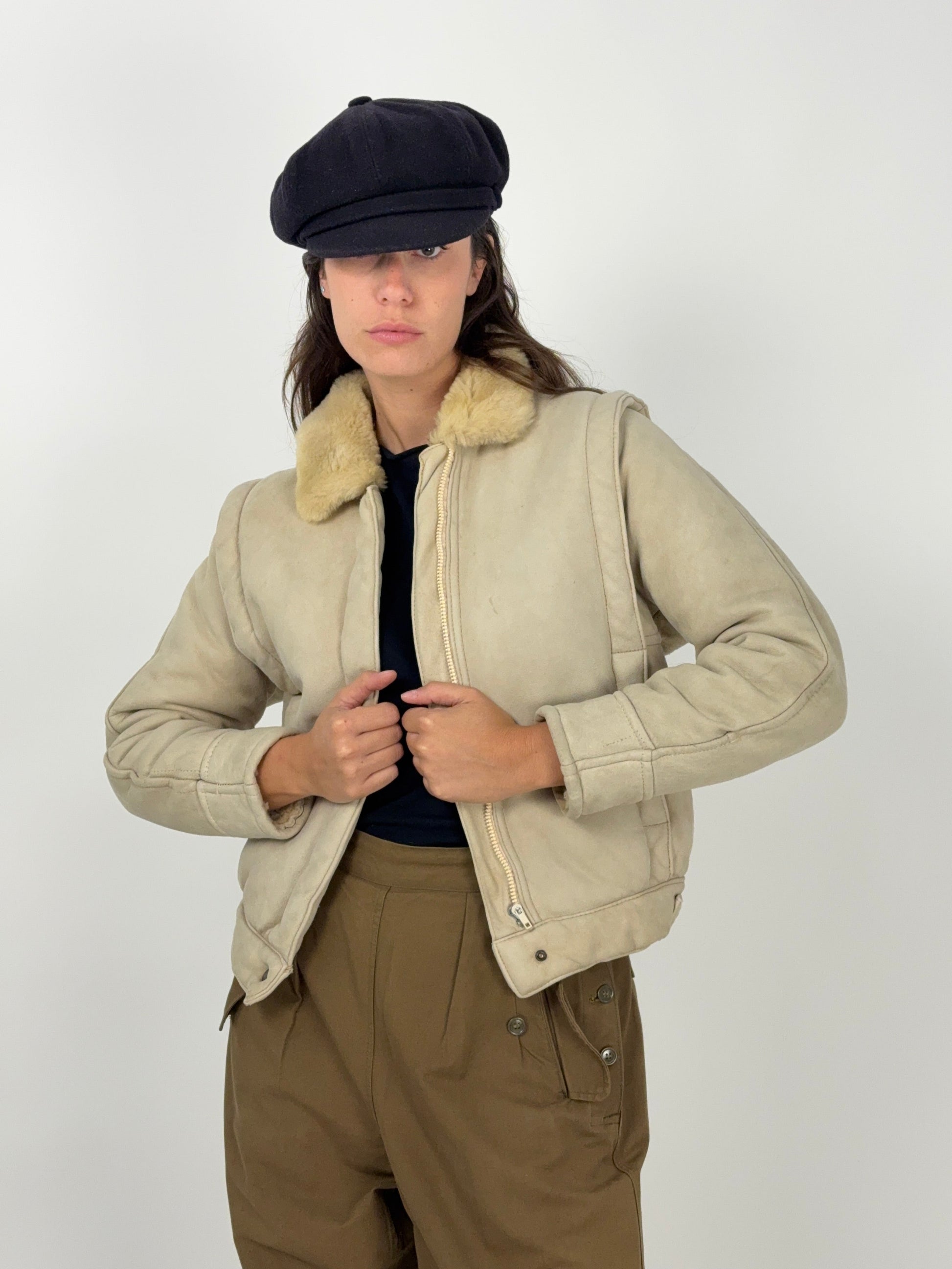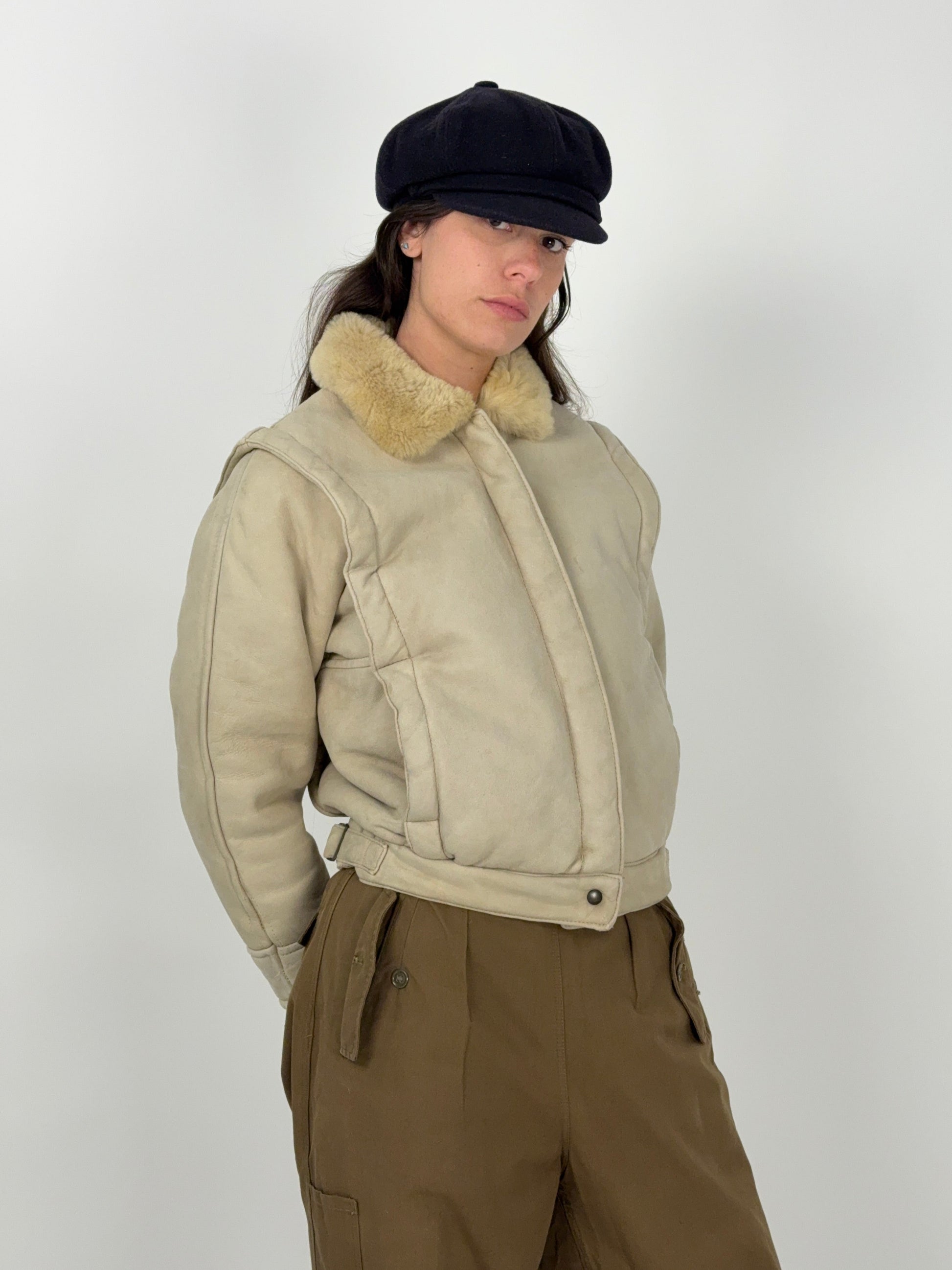 Questa giacca stile aviatore vintage in pelle beige con interno in shearling autentico è un capo che porta con sé il fascino intramontabile degli anni ’70. Un modello caldo, resistente e dal taglio corto, ispirato alle flight jacket dei piloti militari, reinterpretato per la vita quotidiana con dettagli funzionali come la zip frontale e le fibbie regolabili sui lati.