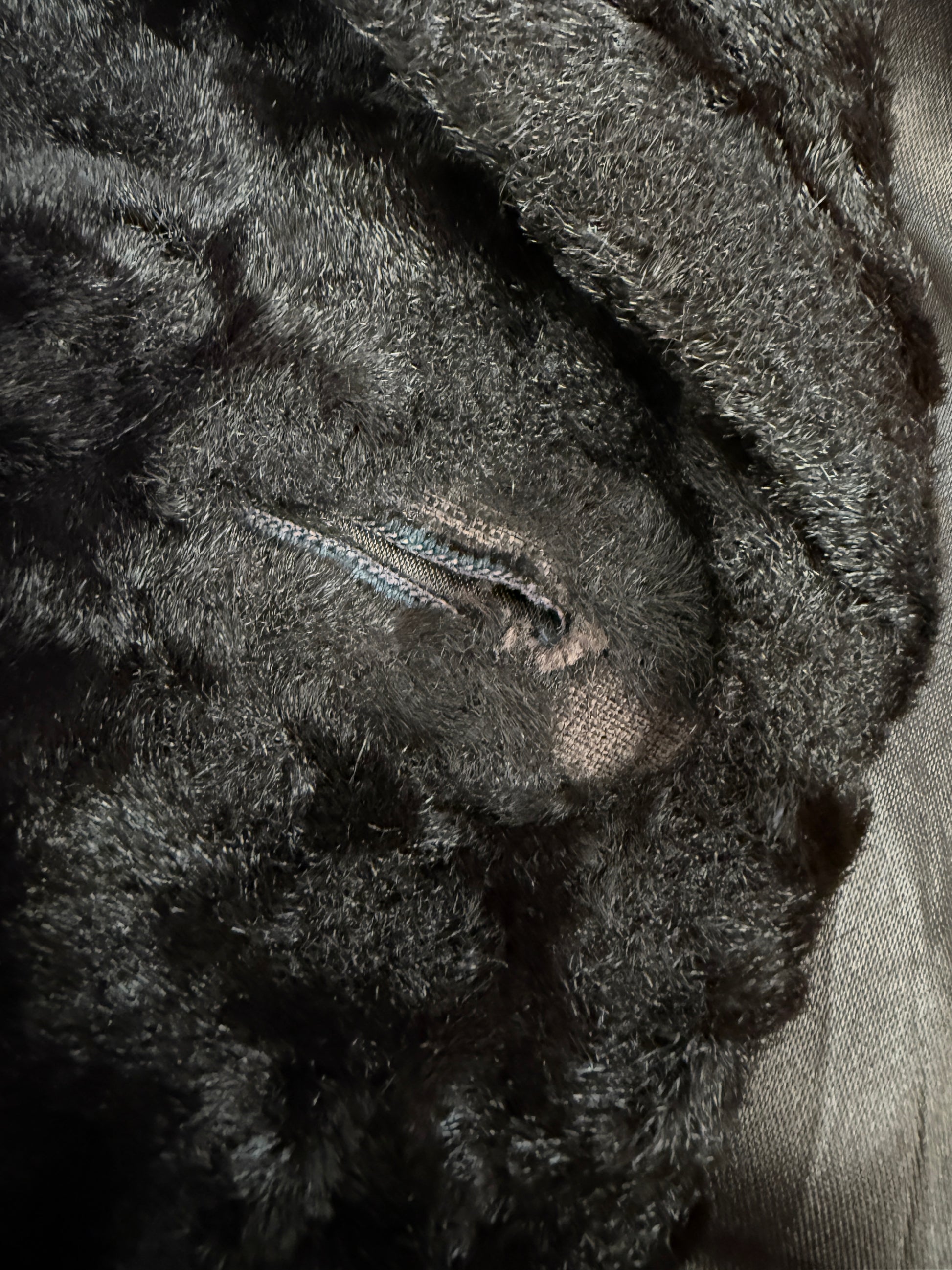 È quel tipo di capo che racconta subito l’epoca: silhouette leggermente over, bottoni doppiopetto, tasche ampie e quel finish lucido tipico delle pellicce sintetiche di fascia alta del periodo.