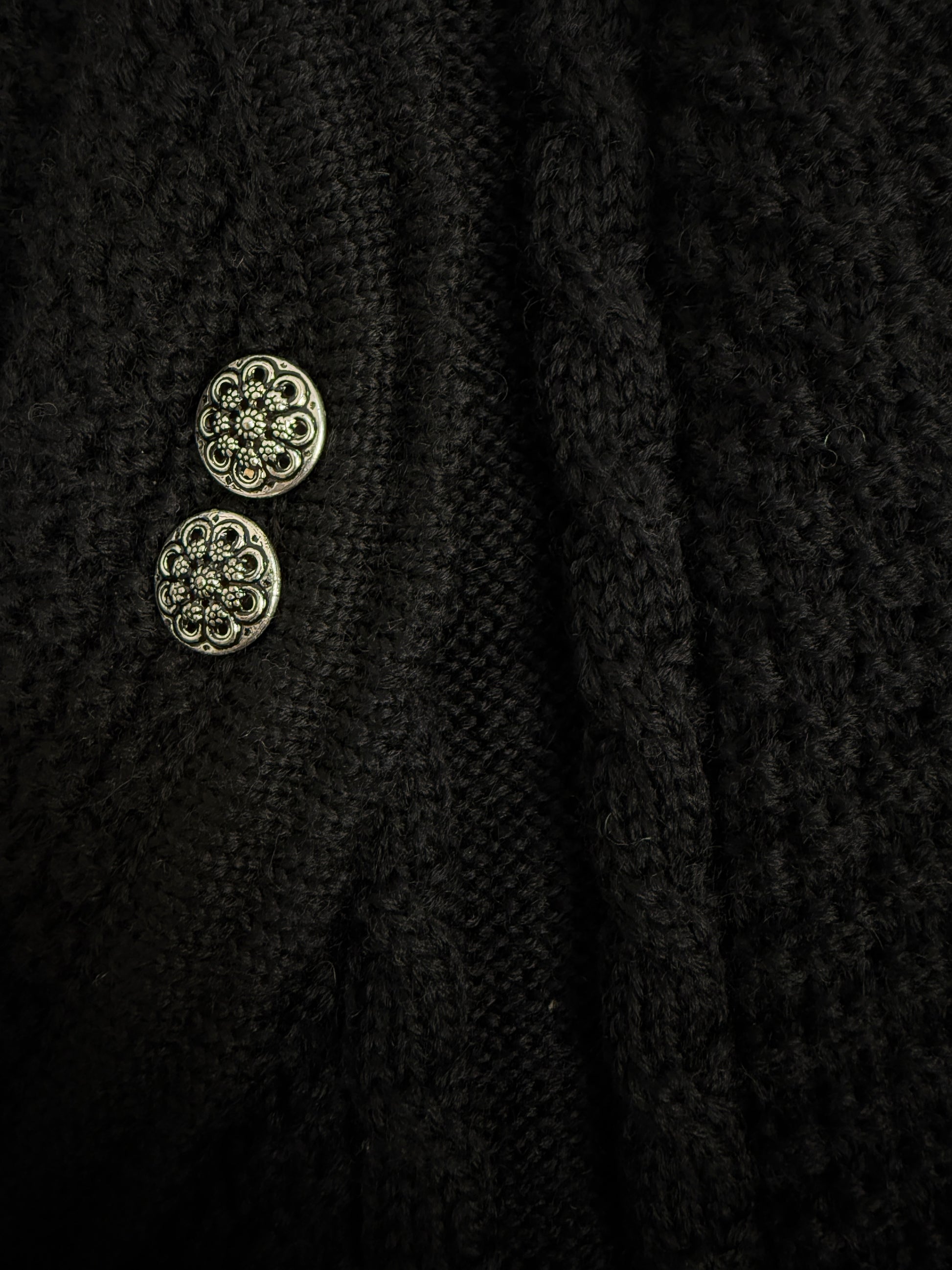 Un modello nero corposo, con maniche a sbuffo, trama pointelle e trecce frontali, chiuso da splendidi bottoni metallici decorati: quei dettagli che rendono subito riconoscibile il vero vintage di qualità.