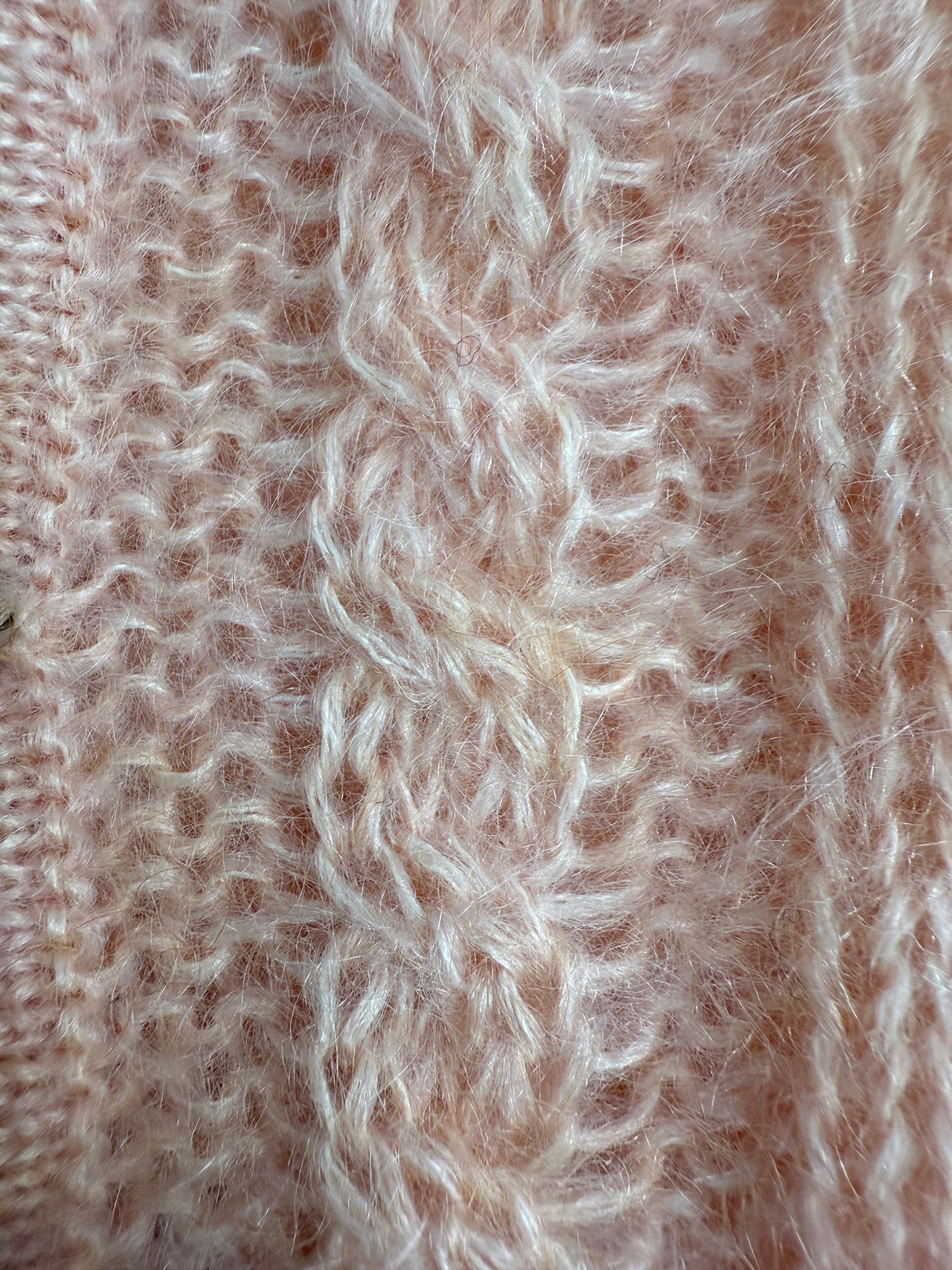 Questo cardigan vintage Oris in mohair rosa cipria racchiude tutta la delicatezza e l’eleganza del knitwear Made in Italy. Il filato soffice e leggermente peloso crea un effetto nuvola sulla pelle, mentre i bottoni gioiello color ametista donano luce e carattere, rendendolo un capo unico nel suo genere. Spalline interne