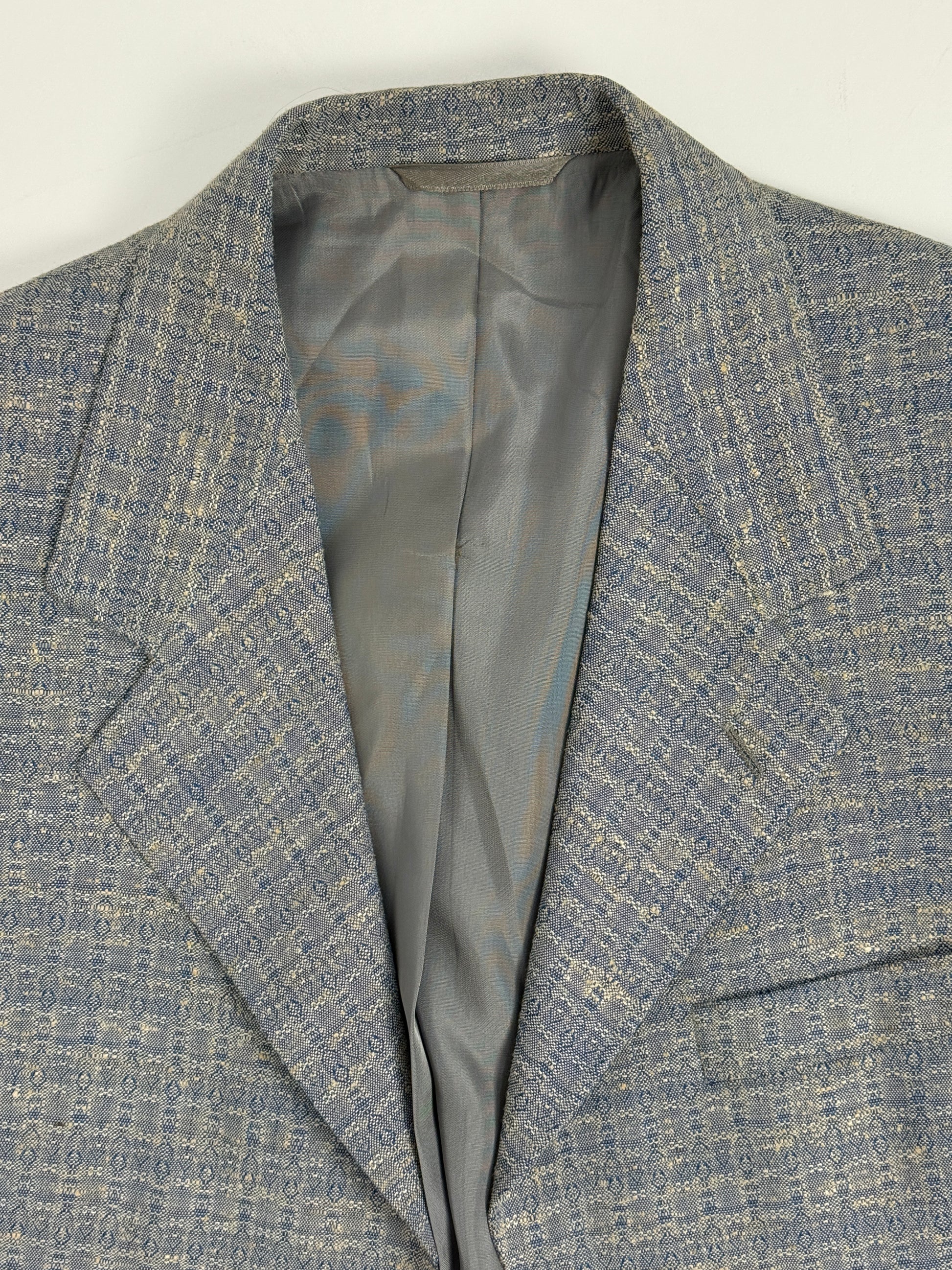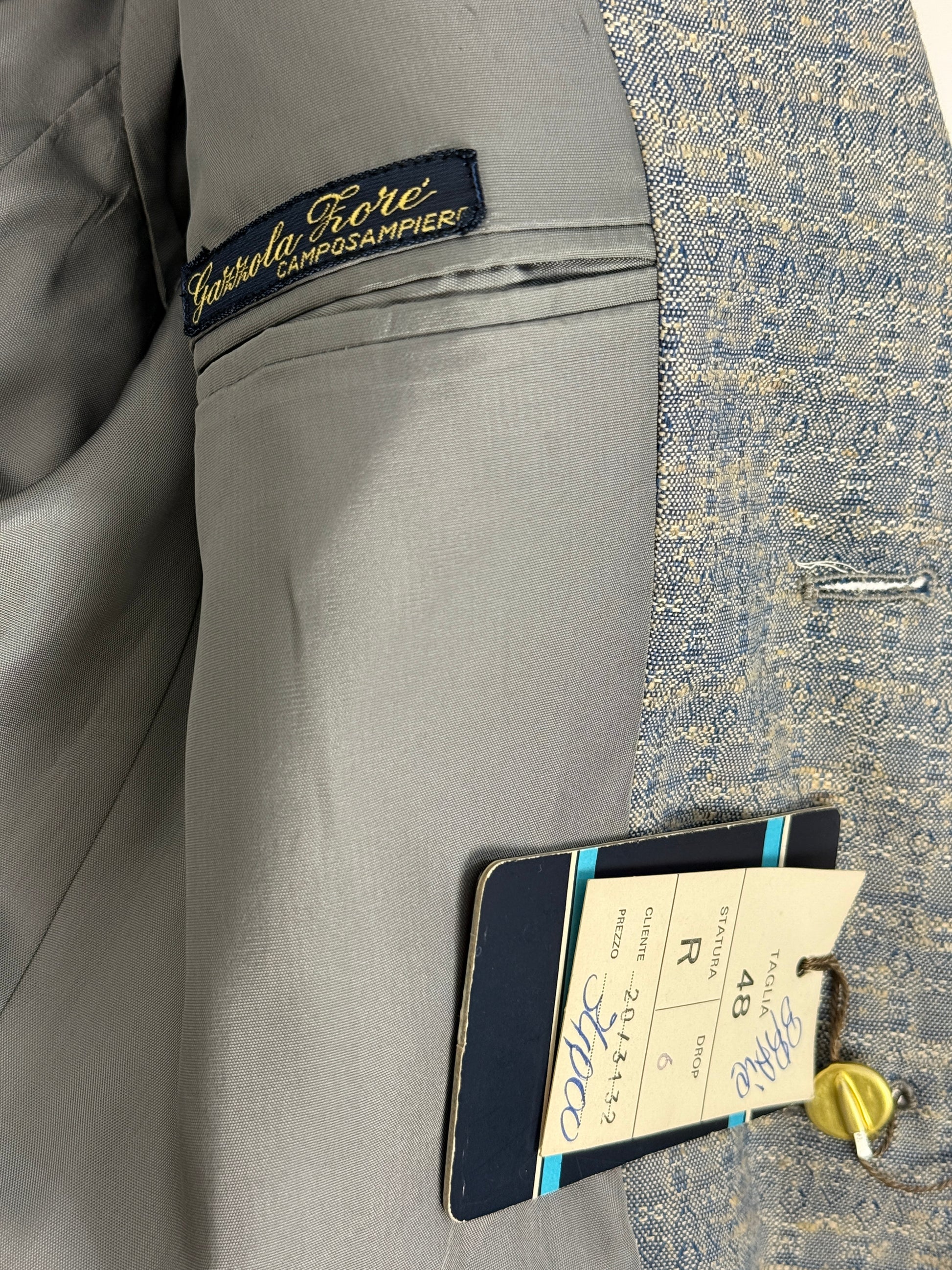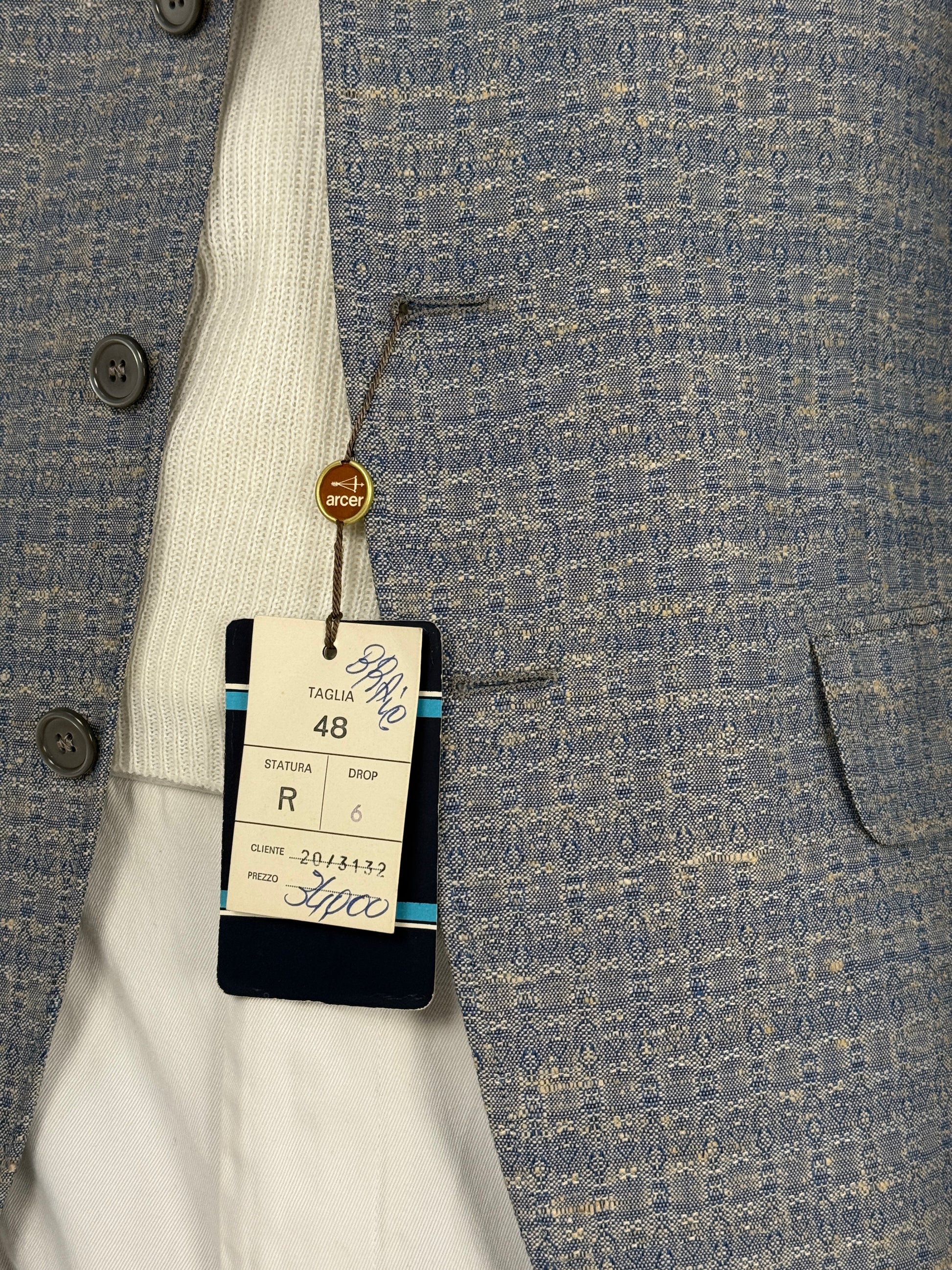 Il tessuto è un azzurro mélange a micro-motivi geometrici: leggero, compatto, fresco, con quella mano materica che oggi è impossibile da replicare se non a costi altissimi. La spalla è pulita, il rever classico e la silhouette snella senza essere rigida.
