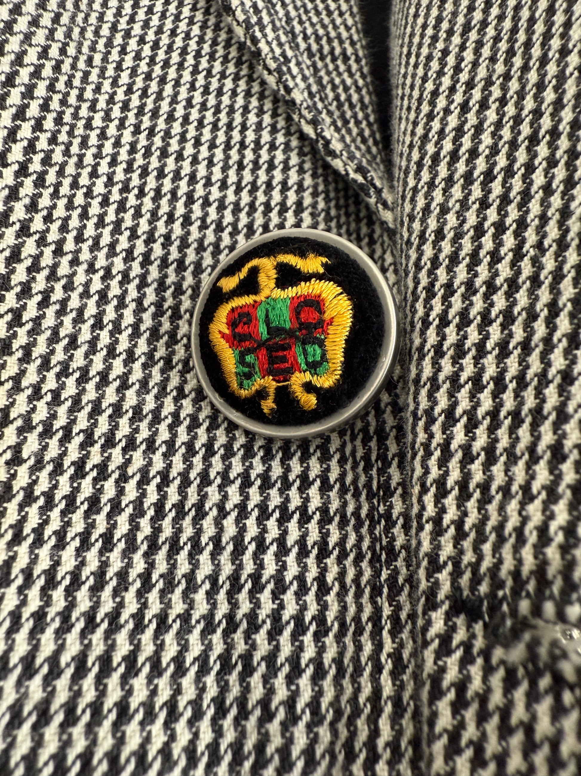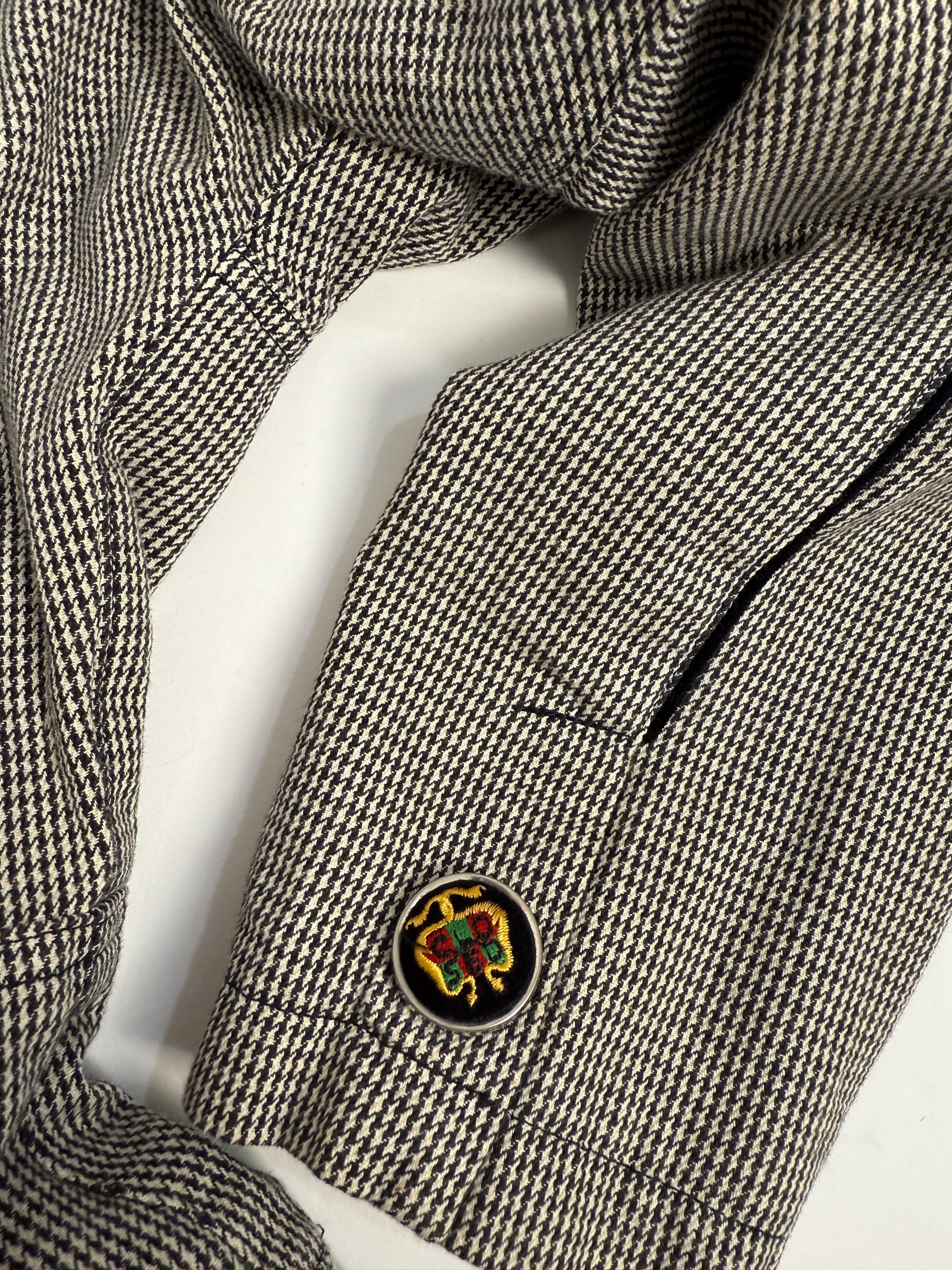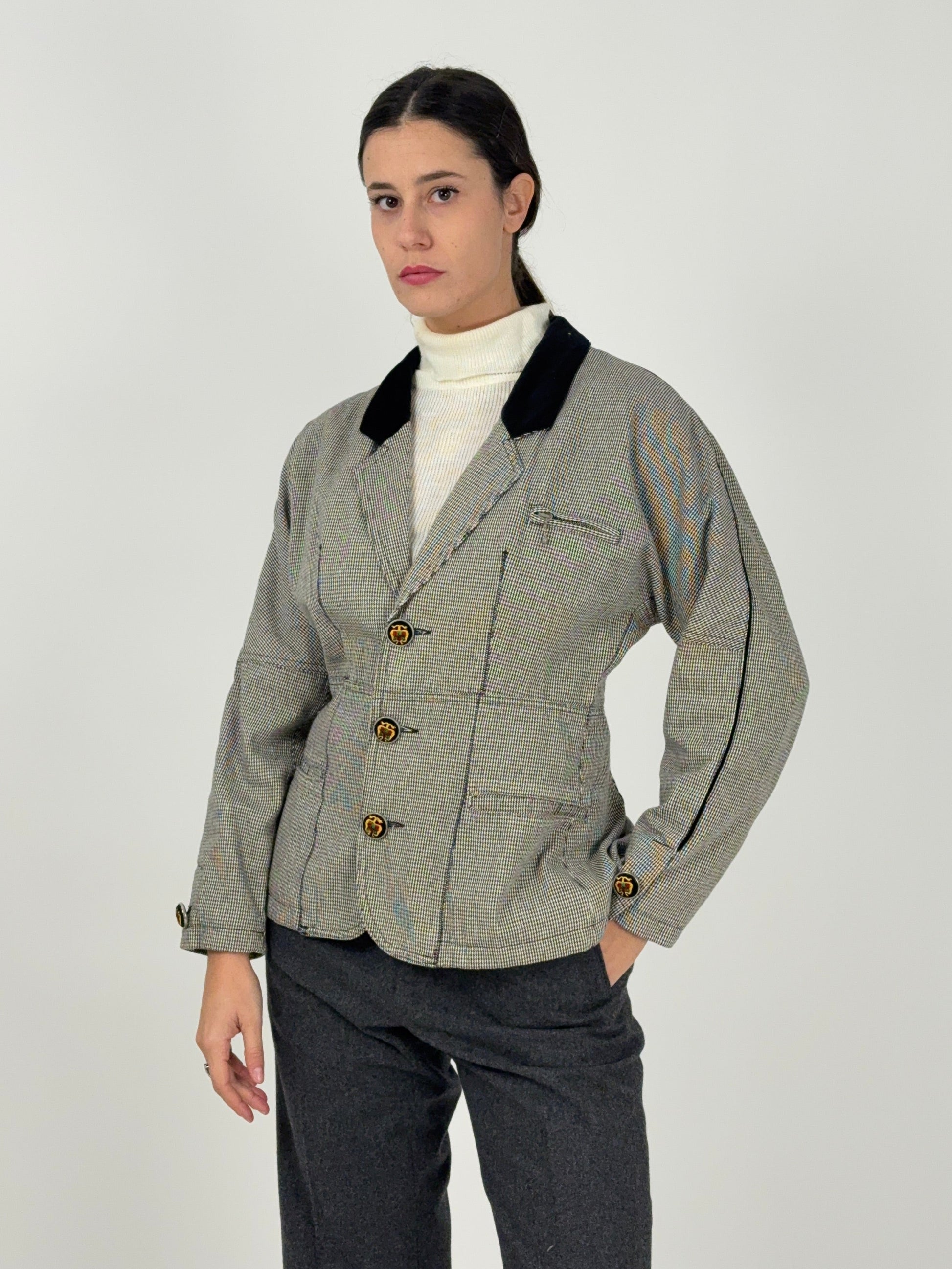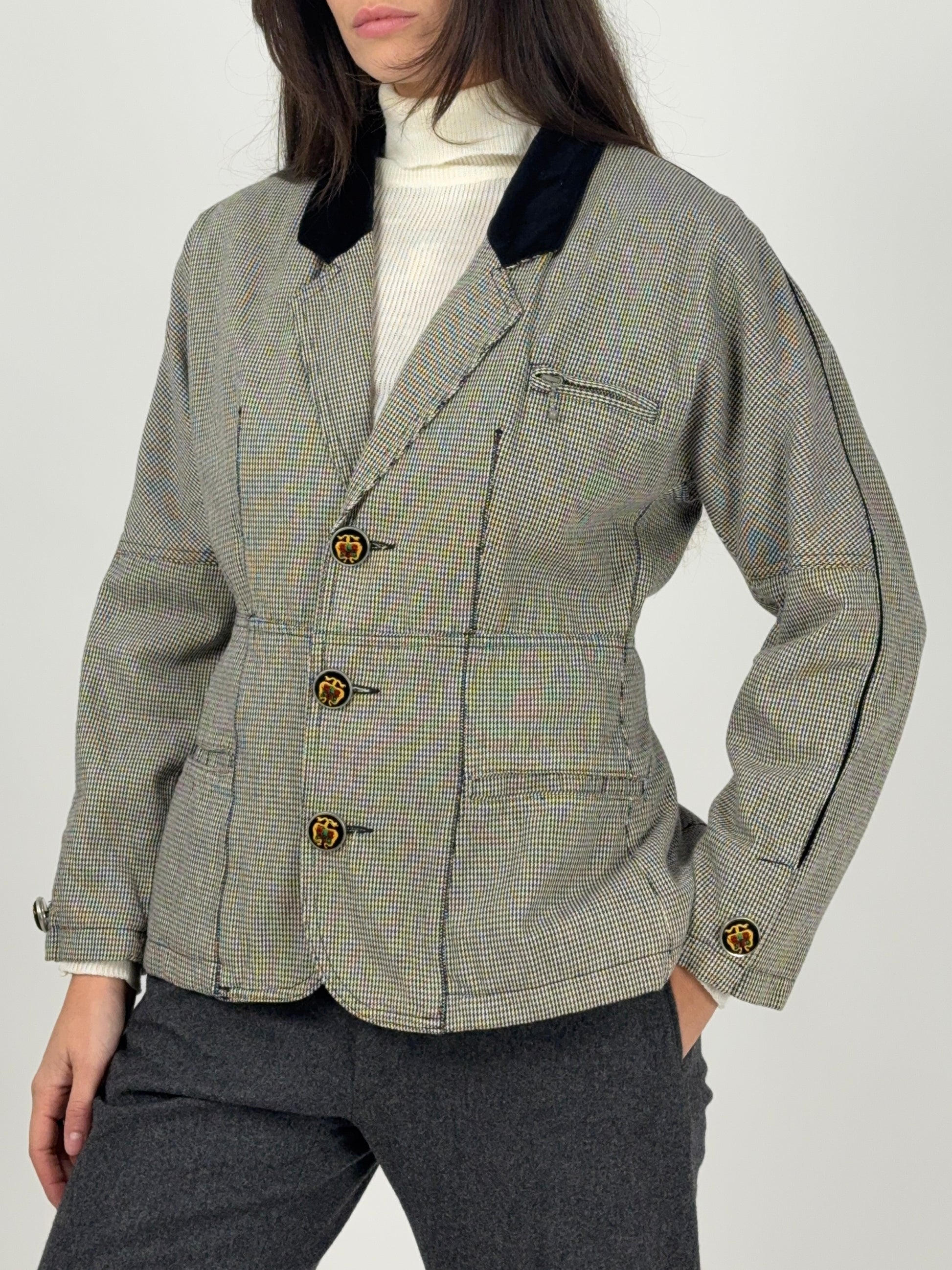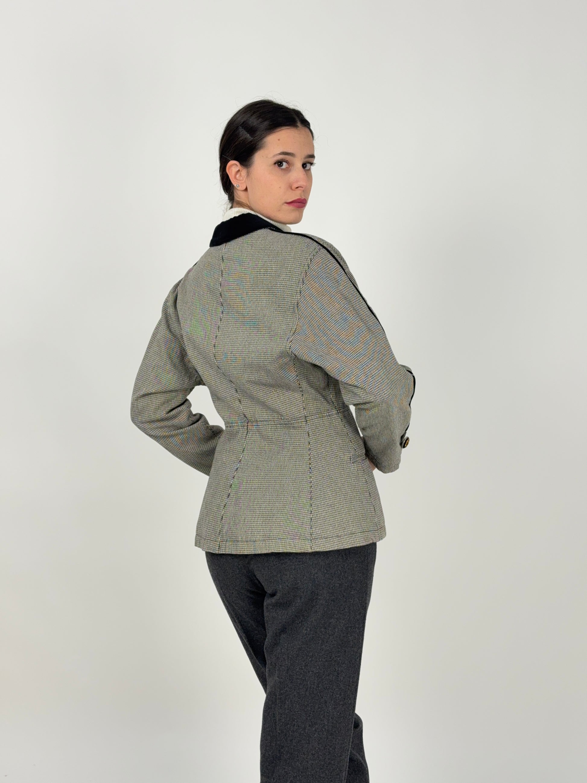 micro pied de poule fine, colletto in velluto nero che la incornicia e bottoni ricamati in stile stemma.