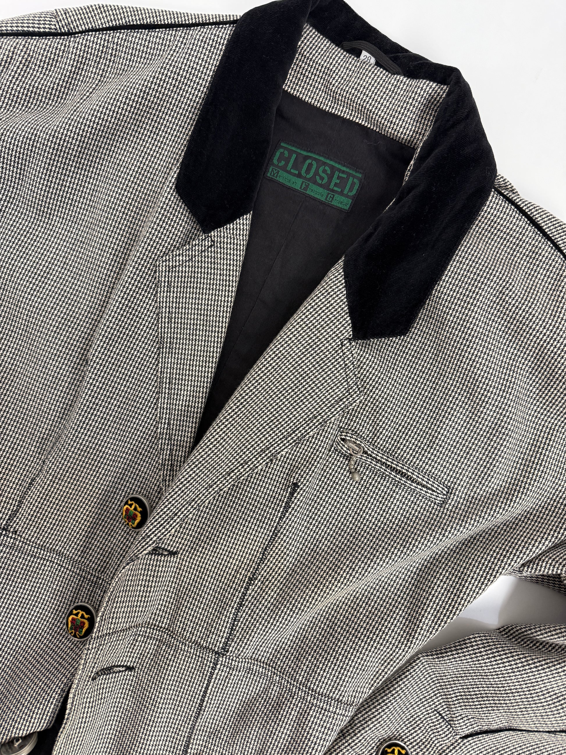 La texture è compatta, calda e solida. Chi ama il vintage riconosce subito la mano CLOSED anni d’oro: qualità, dettagli, identità. Una giacca che funziona sempre, per outfit classici, minimal, oppure più ricercati giocando con pantaloni in lana o denim scuro.